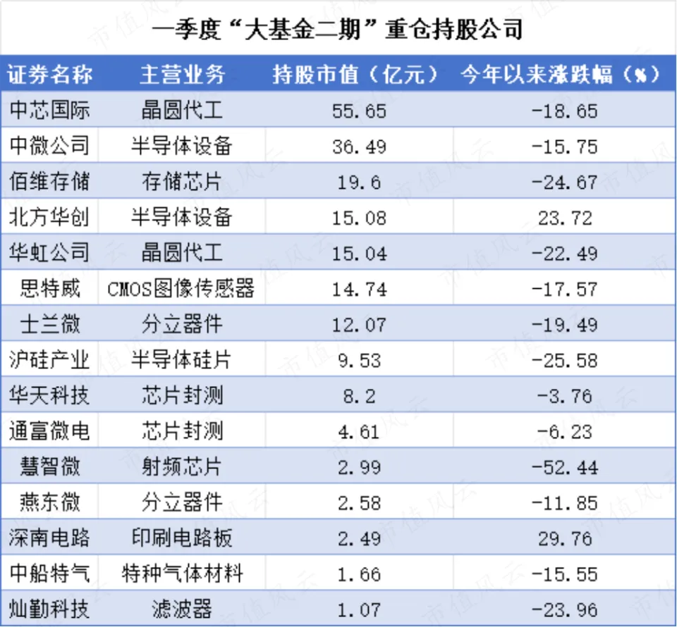 截止到一季度、大基金二期重仓了中芯国际(688981.SH)、中微公司(688012.SH)等半导体企业。