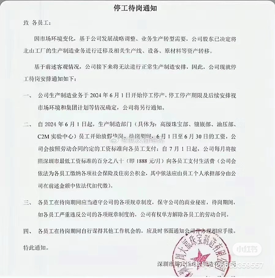 界面消息记者 | 黄姗 许悦 界面消息编辑 | 楼婍沁 针对日前在交际媒体上传播的深圳工厂歇工停产听说,香港周大福珠宝集团向界面消息独家回应道:“集团不停致力于透过调解企业资源设置,提拔运营服从,让我们可以或许更机动、高效地应对珠宝斲丧市场的变革。当中包括对深圳厂区部分部分的调解与重新规划,以及把深圳厂区部分生产部分迁往广东顺德厂区。” 6月5日下战书,界面消息实地拜望了位于深圳市盐田区北山道的北山工业区的周大福厂区。这里就是周大福珠宝研发大楼所在地,其谋划主体正是“深圳市周大福珠宝制造有限公司”。 一位厂区保安对界面消息记者表现:“大部分的人都走了,已经歇工了。” 别的,一位不具名的周大福内地中高层员工则向界面消息证实,周大福深圳北山厂区要迁往佛山顺德,“深圳以后就不留工厂了。” 周大福珠宝的官方回应也证实了早前深圳北山工厂生产制造制造部分歇工停产的听说。 6月4日晚间,一则周大福深圳工厂歇工停产的关照书在交际媒体上传播。 网传关照表现,深圳市周大福珠宝制造有限公司对内发布“停产待岗关照”。关照称,“因市场情况变革,基于公司发展战略调解,业务生产转型必要,公司股东己决定将北山工厂的生产制造业务举行迁徙及相干生产线、设各、原质料等资产转移。” 根据该关照,周大福“北山工厂的生产制造部分”已经从2024年6月1日开始歇工停产。该生产制造部分涉及到“高级珠宝部、镶嵌部、油压部、C2M实验中心”。 天眼查APP数据表现,深圳市周大福珠宝制造有限公司成立于2012年,曾用名为“深圳市福昌科技开发有限公司,是周大福珠宝金行成员,主要从事珠宝金饰及有关饰品、钟表、工艺品等生产和研发。该公司是香港周大福珠宝集团有限公司(以下简称“周大福珠宝”)设在深圳的黄金珠宝金饰等的生产制造商。 而盐田区北山工业区的周大福高新科技研发生产中心在2017年5月正式投入利用,距今恰好7年。 公开数据表现,周大福本来在顺德就设有工厂,旗下广东顺德周大福珠宝制造有限公司的成立时间为2014年7月,这里也是周大福珠宝最早的发源地。2023年3月,在周大福、周生生等头部品牌的牵头下,多家珠宝制造企业与顺德市政府签约,落户打造“打造千亿级黄金珠宝金饰产业集群。” 针对此次工厂搬迁动作,前述不具名周大福内地中高层员工向界面消息透露,“许多员工在深圳定居不愿意搬迁去顺德。” 而根据蓝鲸消息报道,一位周大福深圳工厂员工表现,“顺德那边也已经很饱和了,那边根本也不敷货做”。 而另一位在周大福工作超十年的员工对该媒体表现,“拿补偿金的话是N+3,至于顺德方案补偿金不多,不凌驾3万,不管做了多少年都是一样的,顺德那边工厂也许多人,可能也不必要我们这边的人”。 针对歇工停产的薪资处理处罚以及去职补偿的争议,周大福珠宝对界面消息回应道,“我们不停与受影响的相干员工保持良好和紧密的沟通,在正当合规的底子上有序处理处罚员工的劳动关系和作出补偿。 ” 界面消息此前报道,近期金价连续飙升让多家黄金珠宝零售商感到压力。 5月30日,周生生集团主席兼总司理周永成在日前举办的股东大会上表现,由于本年金价升势太急,制约斲丧意欲,本年贩卖表现比预期差,如今难以估算金价走势,会审慎管理好黄金交易,以减低风险。 周生生集团尚未发布2024年第一季度业绩报告,但在发布于4月22日的2023年财报中提到,“在中国内地,只管春节假期期间贩卖强劲,2024年1月和2月合计贩卖额与2023年(同期)的高基数相比稍微下跌。” 内地黄金珠宝品牌周大生珠宝也在2024年第一季度财报中表现,“报告期,受外部经济情况因素影响,春节后黄金市场价格快速上涨,叠加节后效应,黄金斲丧及卑鄙客户补货热情受到克制,黄金品类的贩卖在节后受到一定水平的影响,斲丧预期更加审慎。” 相干阅读 |