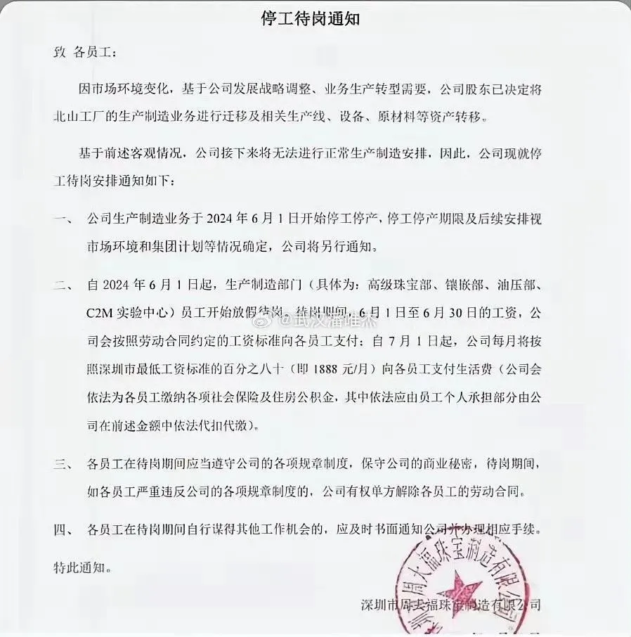 6月5日,有关周大福(01929.HK)深圳工厂歇工停产的消息冲上热搜。 对此,周大福公司官方回应称,这紧张涉及周大福对深圳厂区部门部门的调解与重新规划,以及把深圳厂区部门生产部门迁往广东顺德厂区,该事项公司内部正在精密沟通中。 歇工停产? 克日,有网友在社交媒体上称,周大福位于深圳的工厂歇工停产。据网传通知截图表现,此次周大福关停深圳工厂的紧张缘故因由是“市场情况变革,基于公司发展战略调解、业务生产转型需要,公司股东已决定将北山工厂的生产制造业务进行迁移及干系生产线、装备、原质料等资产转移”。 按照网传《通知》截图,周大福深圳南山工厂生产制造业务于2024年6月1日开始歇工停产,“歇工停产限期及后续安排视市场情况和集团操持等情况确定,公司将另行通知”。 网传《通知》还指出,自2024年6月1日起,生产制造部门(详细为:高级珠宝部、镶嵌部、油压部、C2M 实行中央)员工开始放假结岗。待岗期间,6月1日至6月30日的工资,按照劳动条约约定的工资尺度向各员工付出。自7月1日起,公司每月将按照深圳市最低工资尺度的百分之八十(即1888元/月)向各员工付出米饭钱(公司会依法为各员工缴纳各项社会保险及住房公积金,此中依法应由员工个人负担部门由公司在前述金额中依法代扣代缴)。 据报道,多位周大福深圳工厂员工向媒体记者证明了上述通知的真实性。如今周大福位于深圳的北山工厂已经歇工。 值得一提的是,歇工停产还涉及职员安置。据悉,对于一线员工,周大福深圳工厂提供了两种方案:一是拿赔偿金解约;另一种是深圳厂区员工可选择随迁至顺德。 详细赔偿详情,有周大福员工爆料,“拿赔偿金的话是N+3,至于顺德方案赔偿金不多,不超过3万,不管做了多少年都是一样的,顺德那里工厂也许多人,大概也不需要我们这边的人”。 周大福回应 对此,6月5日下午,周大福对外回应称,“关注到克日网络舆论误导指我们歇工停产,干系言论失实。” 周大福表现:“集团一直致力于透过调解企业资源设置,提升运营服从,让我们可以大概更机动、高效地应对珠宝消费市场的变革。当中包罗对深圳厂区部门部门的调解与重新规划,以及把深圳厂区部门生产部门迁往广东顺德厂区。” “我们一直与受影响的干系员工保持良好和精密的沟通,在正当合规的根本上有序处理员工的劳动关系和作出赔偿。”周大福方面表现,周大福珠宝深耕中国市场快要一个世纪,如今天下已经开设七千多间门店,业务一直保持稳固增长势头。此次工厂部门职能调解完全不会影响集团业务及对中国本地,尤其是大湾区的长远投资。 据相识,周大福创建于1929年,今年为该公司建立95周年,2011年12月在香港团交友易所主板上市。如今,周大福在本地有深圳、顺德、武汉3个财产基地,此次歇工的深圳工厂紧张以研发为主。 天眼查表现,涉事公司深圳市周大福珠宝制造有限公司建立于2012年3月,注册资源5000万元。年报信息表现,该公司2022年参保人数达1051人。值得一提的是,该公司由周大福品牌关联公司周大福珠宝金行(深圳)有限公司全资持股,后者对外投资企业超70家,如今已有30余家注销,此外其100余家分支机构中超七成已注销。 业绩保持妥当 经业务绩层面,比年来,周大福业绩相对妥当,制止2023年9月尾的前6个月内,该公司实现营收454.5亿元(人民币,下同),同比增长6.43%,净利润41.76亿元,同比增长36.44%。 据最新发布的2024年前三月未经稽核紧张策划数据,周大福集团零售额同比增长12.4%,此中中国本地零售值同比增长12.4%,占比为88.6%;中国香港、中国澳门及其他市场同比增长12.8%,占比11.4%。不过,季内中国本地同店贩卖同比下滑2.7%。对此,周大福称,中国本地同店贩卖受惠于节日需求,但由于基数较高季内同店贩卖淘汰。 行业方面,天下黄金协会数据表现,2024年第一季度黄金均价创下汗青新高,达到2070美元/盎司。这一代价较去年同期高出10%,较上季度环比上涨5%。国内黄金代价的走势与国际金价上涨保持同步。周大福官网表现,今日零售金价为716元/克。 制止6月5日下午收盘,周大福总市值1007亿港元,报收10.08港元/股。 |