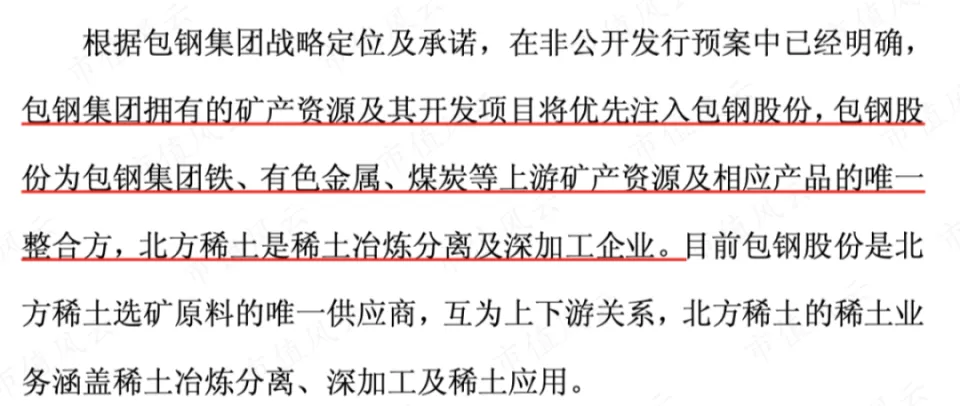 (1)包钢作为资源性企业,包钢团体承诺拥有的矿产资源及其开发项目将优先注入包钢股份,包钢股份为包钢团体铁、有色金属、煤炭等上游矿产资源及相应产品的唯一整合方;(2)北方稀土定位是稀土冶炼分离及深加工,其质料来自于包钢股份。