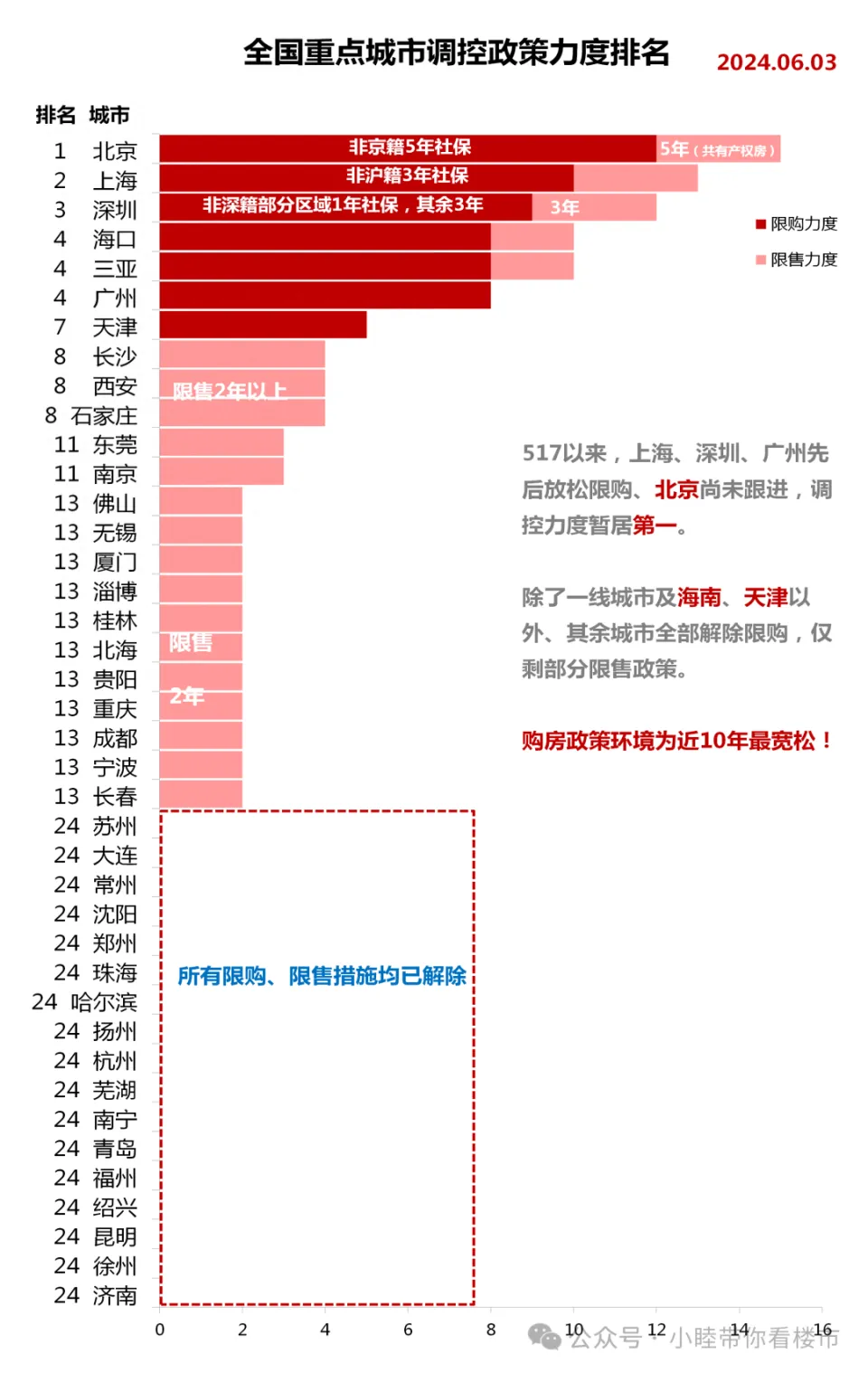 就当前中国房地产市场的限购严酷水平而言,北京无疑位居首位。只管在4月尾北京政策履历了一轮放松,但5月北京政策未进一步调解,现在,非北京市户籍居民在购房时,仍需满足一连缴纳5年社会保险的硬性要求,这一高门槛设置有用控制了购房群体的规模,体现了北京对房地产市场调控的审慎态度和一连稳健的政策导向。在限售方面,北京市对于共有产权房采取烈?为严酷的管控步调,规定购买者需持有房产满5年才可上市生意业务,而其他类型房产则不受此限。紧随厥后的是上海和深圳,分别位列限购严酷水平的第二和第三位。这两座都会均在5月份对限购政策举行了调解,现在其置业门槛较北京要低。上海的最新厘革表现在对外地户籍购房者的社保缴纳要求上,从原先的5年收缩至3年,这一“527新政”无疑为更多埋伏购房者打开了市场准入的大门。深圳在罗湖区、宝安区的西乡街道与新安街道、以及福田区维持3年社保的门槛,而别的地区则仅需1年社保纪录。别的,深圳全城仍实验3年限售规定,以此来抑制谋利性购房行为。广州在履历两轮政策调解后,部分地区仅需半年社保,且120平以上住房可以买,现在限购力度较其他一线都会显着更低。其次是海南,现在海南的限购政策仍未调解,少部分地区仍要5年社保,2年限售。尚有一个仍有限购的都会是天津、但力度最弱(限购地区需6个月社保),且认河北、北京社保。除了海南外,大部分二线都会的房地产市场于年内相继宣布全面清除购房限定步调。之前调控力度较高的杭州、长沙、西安、合肥等热门二线都会,均于本年4月先后清除限购。意味着在这些二线都会中,购置房产不再受到严酷的资格检察约束,埋伏购房者只需具备相应的经济本领即可,无需满足诸如本地户籍、社保缴纳年限或纳税纪录等以往常见的准入条件。这无疑为外地投资者以及有购房需求的居民去掉了门槛,促进了房地产市场的流动性与活泼度。固然限购政策广泛取消,但限售政策在一些热门二线都会中仍部分保存。杭州、长沙、成都、西安、合肥、南京及厦门等都会,现在实行着为期2至3年的限售规定。517之后,一线都会政策逐步放开已是板上钉钉的事,上海、广州、深圳在5月27-28号政策超预期宽松也预示着调控步调即将逐步退出汗青舞台。517开始的本次系列调控很及时,一揽子房地产政策落地表现出中央‘稳地产’的刻意,显着提振了市场信心,随着焦点一二线都会逐步落实各项举措,接下来市场有望进入政策效果兑现期,同时6月房企也将进入上半年业绩冲刺阶段,市场活泼度有望回升。