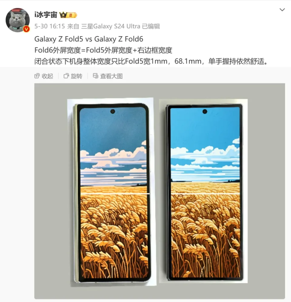 该博主并表现“Fold6外屏宽度=Fold5外屏宽度+右边框宽度,闭合状态下机身团体宽度只比Fold5宽1mm,68.1mm,单手握持依然惬意。”