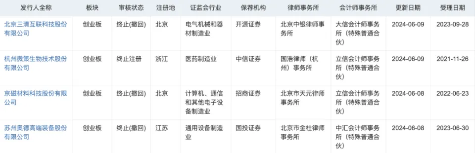 端午假期,IPO撤回数目仍在不断增长。6月8日和9日共有5家公司IPO折戟。 此中6月8日苏州奥德高端装备股份有限公司(简称“奥德装备”)、京磁质料科技股份有限公司(简称“京磁股份”)撤回创业板IPO。6月9日,杭州微策生物技术股份有限公司(简称“微策生物”)过会后提交注册阶段制止注册,北京三清互联科技股份有限公司(简称“三清互联”)撤回创业板IPO。 另外,拟创业板上市企业福建侨龙应急装备有限公司(简称“侨龙应急”)2023年6月8日IPO注册生效,但至今却仍未发行。证监会下发的注册批文有效期仅12个月,假如企业未能在该限期内发行股票,则意味着发行失败。 两公司创业板IPO折戟 奥德装备和三清互联尚未上会,即已撤回IPO。 奥德装备建立于2007年,告急从事高精密工业温控装备及配件的研发、生产和贩卖,致力于为客户提供安全、环保的工业温控体系办理方案。奥德装备的告急产物有:油循环模温机、水循环模温机、冷冻机、螺杆水冷机组、油加热器、电加热油锅炉、导热油锅炉。 2023年6月奥德装备创业板IPO获受理,公司原计划募资4.6亿元,分别用于工业温控装备生产基地建立项目、高低温泵生产基地建立项目、研发中心项目、补充活动资金。制止撤回IPO,奥德装备尚未复兴首轮问询。 三清互联告急从事电力物联网感知层终端及成套装备的研发、计划、生产和贩卖。致力于将物联网先进技术应用于输配电及控制装备行业范畴,提升智能配电网体系的感知、通讯与控制本领。三清互联依托把握的电力物联网感知层关键技术,研发并生产的告急产物包罗 DTU、FTU、台区智能融合终端、故障指示器、一二次融合成套柱上断路器、一二次融合成套环网箱和其他低压电气装备等。 2023年9月,三清互联创业板IPO获受理,公司原计划募资3.4亿元,用于电力物联网智能装备财产化基地建立项目及补充活动资金。制止撤回IPO,三清互联已披露首轮问询复兴。 两公司过会后仍撤回 陪同着IPO严羁系信号连续开释,不少企业选择自动撤回上市申请,甚至包罗已颠末会的企业。此中京磁股份已经IPO过会,而微策生物IPO过会后已提交注册,但两公司终极均选择撤回IPO。 京磁股份专业从事烧结钕铁硼永磁质料的研发、生产和贩卖,是中国烧结钕铁硼永磁质料告急生产厂家之一,焦点产物为高性能烧结钕铁硼永磁质料,告急应用于汽车工业、节能家电、风力发电及消耗电子等范畴。 京磁股份与卑鄙告急客户建立了恒久稳固的合作关系。在汽车工业范畴,京磁股份是德国大陆(纬湃科技)、法雷奥、丰达电机、前锋音响等汽车零部件企业的供应商;在节能家电范畴,京磁股份是美的团体、格力电器等家电企业的供应商;在风力发电范畴,京磁股份是西门子、上海电气等着名风电企业的供应商;在消耗电子范畴,公司是歌尔股份、美特科技等消耗电子企业的供应商。 2022年6月京磁股份创业板IPO获受理,公司原计划募资5.77亿元用于年产2800吨高性能稀土永磁元器件生产线新建项目,补充营运资金。2023年4月,京磁股份顺遂过会,但随后未有提交注册。过会一年多后,京磁股份终极撤回IPO。 微策生物2013年建立,专业从事POCT产物的研发、生产与贩卖。微策生物自主研发的多系列血糖监测产物充分满足各类人群的血糖监测必要,陈诉期内上市的血糖多合一产物具备血酮、尿酸监测功能,在糖尿病管理及生酮饮食中饰演告急角色,未来微策生物还将陆续推出检测乳酸、总胆固醇等指标的POCT产物,以及动态血糖监测产物。 2021年11月微策生物创业板IPO获受理,公司拟募资7.75亿元。2022年7月微策生物IPO过会,2022年10月提交注册。等待近一年半后,微策生物终极选择制止注册。 IPO生效未能发行 IPO严监严管下,除了撤回IPO公司不断增长,纵然已IPO注册生效的企业也不代表十拿九稳。侨龙应急2023年6月8日注册生效,至今却仍未发行。 招股书体现,侨龙应急定位于应急装备技术创新型企业,告急从事应急抢险装备的研发、生产和贩卖。陈诉期内,公司贩卖的告急产物为供排水应急抢险装备,告急客户为全国各地市的应急管理局、都会管理局、水利体系、水务及防汛体系、消防体系、武警队伍、大型石化及电力企业等国家机构及企古迹单位。 回顾其上市历程,2022年2月侨龙应急创业板IPO获受理,公司原计划募资5.82亿元。当年9月侨龙应急上会得到通过。2023年5月,侨龙应急提交了注册申请,仅时隔一周,公司当年6月8日注册生效。然而,注册生效后,侨龙应急却迟迟没有走上发行这一步。 根据规定,“中国证监会的予以注册决定,自作出之日起一年内有效,发行人应当在注册决定有效期内发行股票”。证监会下发的注册批文有效期仅12个月,假如企业未能在该限期内发行股票,则意味着发行失败。侨龙应急IPO注册生效起始日为2023年6月8日,到2024年6月8日刚好一年。 别的,科创板本年也有注册生效但并未上市的IPO例子存在,为科创板拟IPO公司新通药物。2021年12月新通药物IPO获受理,接纳科创板第五套上市尺度,2022年12月新通药物初次上会被暂缓审议,2023年1月二次上会得到通过,2023年4月提交注册并生效,批文有效期为12个月,但新通药物直至IPO批文到期仍无法完成上市。 陪同着IPO严羁系信号连续开释,不少企业选择自动撤回上市申请。有投行人士体现,IPO撤回的缘故原由较为复杂,除了全流程严羁系和问责体系全面增强之外,