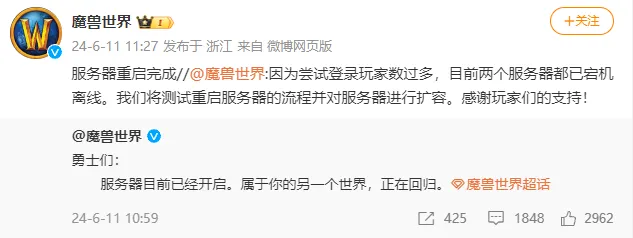 仅用不到20分钟,《魔兽天下》官方微博表现,“由于实验登录玩家数过多,现在两个服务器都已宕机离线”。通过官方重启服务器并对服务器扩容,颠末40分钟的等待,终于有玩家发来喜报:登进去了。