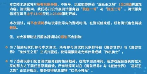 据官方介绍,本次测试面向全部玩家,测试内容为怀旧服“巫妖王之路”,测试时间为上午11:00至晚上23:00。测试服务器被取名为“抗压一号”与“抗压二号”,官方向全部测试玩家答应“炸机勇士”成绩,还表现一旦“游戏服务器真的在大家的积极之下因任何缘故起因瓦解,全部玩家可以在《魔兽天下》与《魔兽天下》”巫妖王之怒“正式开服后,额外得到吊唁宠物“红色小神龙”。