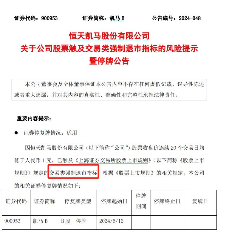 恒天凯马股份有限公司(证券简称:凯马B;证券代码:900953)即将走向退市终局。制止一季度末,凯马B仍有平常股股东23258名。公司股票自6月12日(周三)开市起停牌。 6月11日,上交所向凯马B下发《关于拟制止恒天凯马股份有限公司股票上市的事先告知书》(简称“《告知书》”),对凯马B股票作出制止上市的决定。 上交所指出,5月14日至6月11日期间,凯马B股票一连20个生意业务日的逐日股票收盘价均低于1元,根据《上海证券生意业务所股票上市规则(2024年4月修订)》第9.2.1条的规定,凯马B股票已经触及制止上市条件。 《股票上市规则》第9.2.1条即所谓“生意业务类欺压退市”条款或“面值退市”条款。 该规定明白指出,在上交所仅发行B股股票的上市公司,一连120个生意业务日通过本所生意业务体系实现的累计股票成交量低于100万股,大概一连20个生意业务日的逐日股票收盘价均低于1元,上交所决定制止其股票上市。生意业务类欺压退市公司股票不进入退市整理期生意业务。 制止昨天收盘,凯马B收于0.03美元/股,折合人民币为0.213元/股,公司总市值为9.7亿元人民币。 同时,上交所还就制止上市相关事项向凯马B下发羁系工作函,要求公司及时披露并充实提示风险,做好股票制止上市的有关工作。包罗:尽快聘请主办券商,做好公司股票进入天下中小企业股份转让体系的详细安排和信息披露工作,确保公司股票在摘牌之日起45个生意业务日内可以挂牌转让,掩护投资者股份转让权利。 凯马B方面表现,公司董事会将按照相关规定及时推行信息披露义务,并提请广大投资者或托管券商等市场主体在股票制止上市暨摘牌前及时告终股票质押式回购、约定购回、融资融券、转融通、沪股通等业务。 凯马B早在1998年即完成上市,恒久从事的重要业务为载货汽车、小型机电产物的生产和贩卖等。 2023年,公司贩卖载货汽车7.32万辆,作为对比同年我国货车产销总量为353.9万辆。2023年,凯马B实现业务收入29.5亿元,归属母公司的净利润-1.76亿元,均与上年同期根本持平。 此前,凯马B曾提出要“果断打赢生存发展攻坚战”: 一是增强传统车贩卖。加速市场相应速率,加大经济型和细分市场挖潜力度; 二是抢抓新能源市场。鼎力大举推进新能源客车资质申报工作,同时加速营销渠道下沉,并及时根据市场趋势,订定差别化代价战略,维护重点增量市场; 三是尽力开发国际市场。加大对俄罗斯、阿尔及利亚、中亚五国等市场开发,抢抓增量及大客户市场。 根据Wind统计,制止6月11日收盘,正常生意业务的股票中股票收盘价低于1元/股的上市公司共有26家。 此中多家上市公司已确定退市,如ST亿利(600277)就在昨天的股价异动公告中明白表现,即使公司股票后续一连涨停也不能回归1元/股以上,公司股票已锁定生意业务类欺压退市。 证监会上市公司羁系司司长郭瑞明近期在答记者问中介绍,今年以来,已有33家公司触及退市标准,此中面值退市22家,市场优胜劣汰机制正在逐步形成。“2023年整年退市47家,退市新规设置了肯定过渡期,预计短期内退市公司不会显着增长。” 郭瑞明夸大道。 |