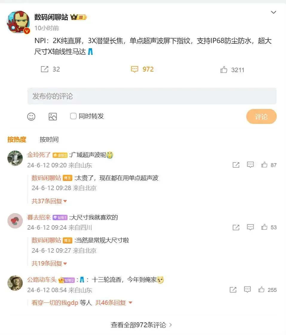 博主「数码闲聊站」爆料,iQOO 13 将会接纳一块 2K 纯直屏,搭载高通过骁龙 8 Gen 4 平台,并配备 3X 潜望长焦、单点超声波屏下指纹,还将支持 IP68 防尘防水,内置超大尺寸 X 轴线性马达。
