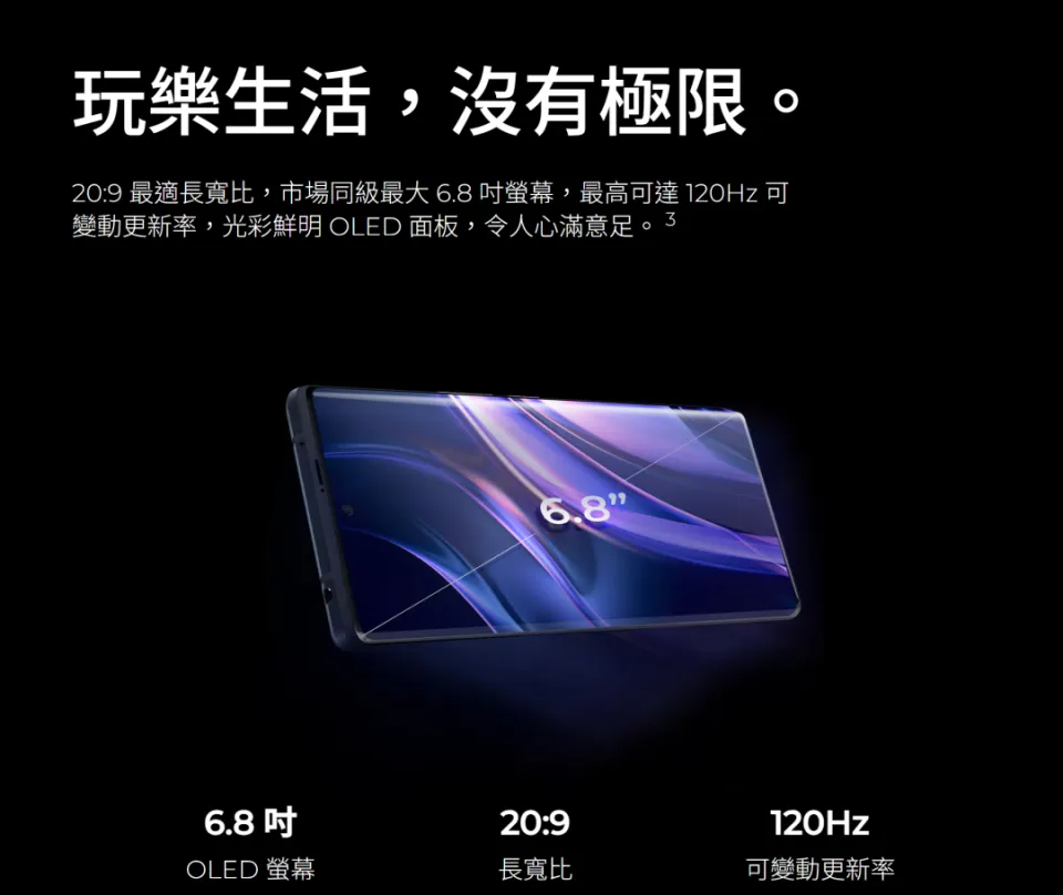 - 正面搭载一块 6.8 英寸高刷屏,分辨率为 2346*1080,大猩猩玻璃