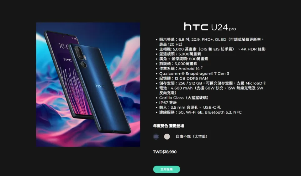 HTC U24 pro 在台湾正式发布,标配 12GB 运存,可选 256GB、512GB 存储,售价分别为新台币 18990 元和 20990 元(约人民币 4254 元和 4703 元)。