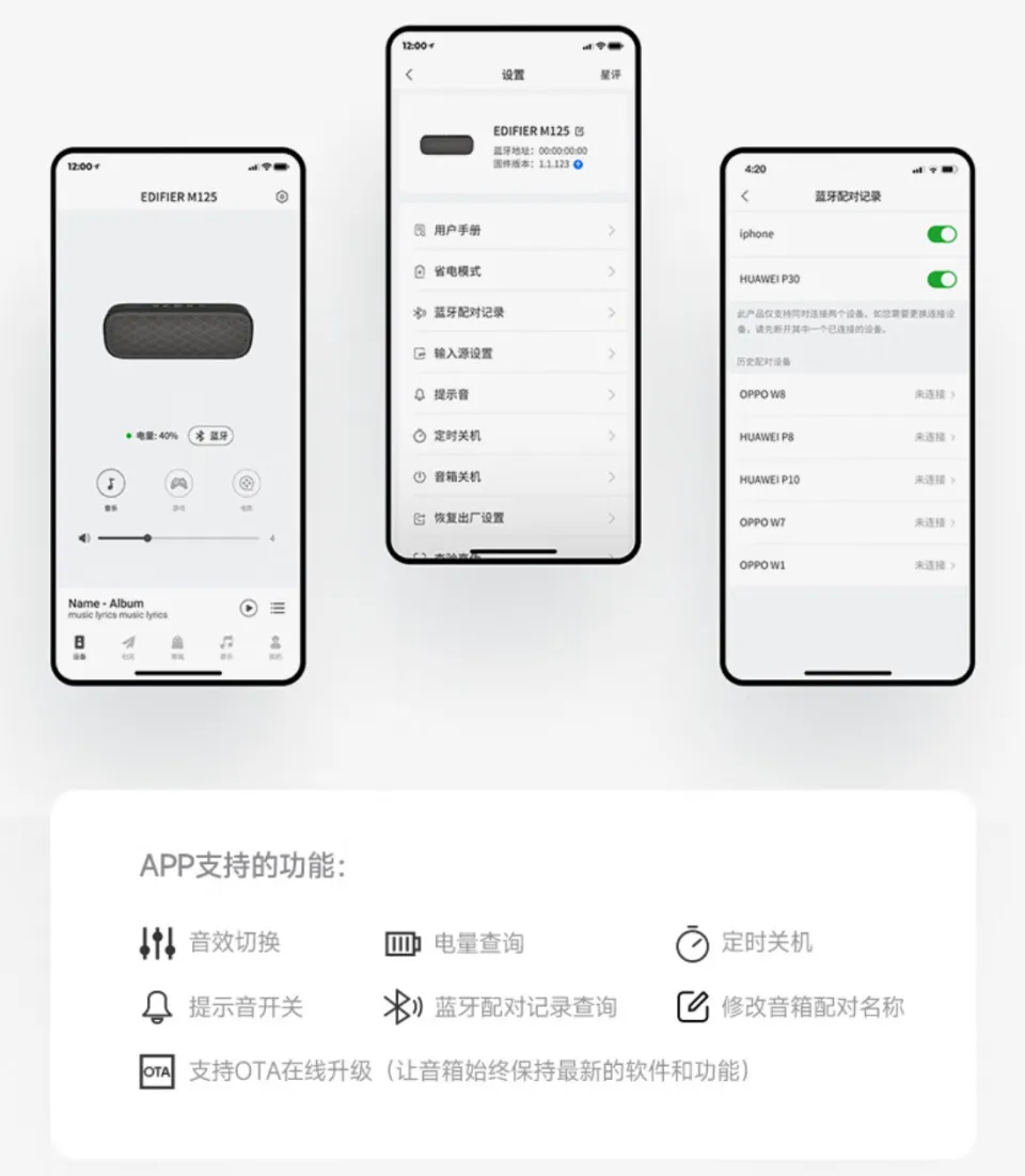 IT之家 6 月 12 日消息,闲步者新品M125 便携式蓝牙音箱采取 4W + 4W 2.0 声学结构,6 月 12 日至 20 日首发到手价 169 元。 闲步者 M125 搭载双 36mm 全频单元与 86 x 35mm 大尺寸低频辐射器,拥有 4W + 4W 连续不失真功率。 续航方面,这款蓝牙音箱内置 2600mAh 电池,在 SBC 编码、80% 音量下连续播放时长可达 13 小时。 外貌方面,M125 长 17.6cm、宽 6.7cm、厚 2.9cm,重 260g,采取喷砂氧化的铝质面网与玄色后壳,顶部配有六个实体按键。 IT之家留意到,闲步者 M125 除支持蓝牙 5.4 设备双毗连外,还支持 microSD 卡当地播放,并内置 USB 声卡,可直连电脑利用。别的,还可通过 EDIFIER Connect 应用自定义音效,提供音乐、游戏、影戏三种音效模式。 |