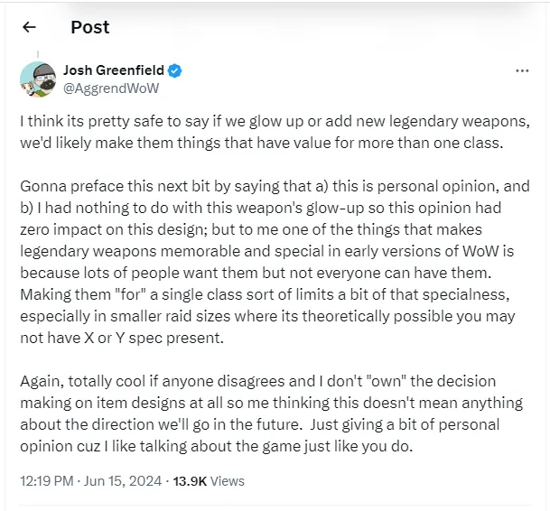 传奇武器在早期版本的魔兽世界中令人难忘和特别的原因之一是,很多人都想要它们,但不是每个人都能拥有它们。将它们“用于”单一职业会限定这种特别性,特别是在较小的团队规模中。