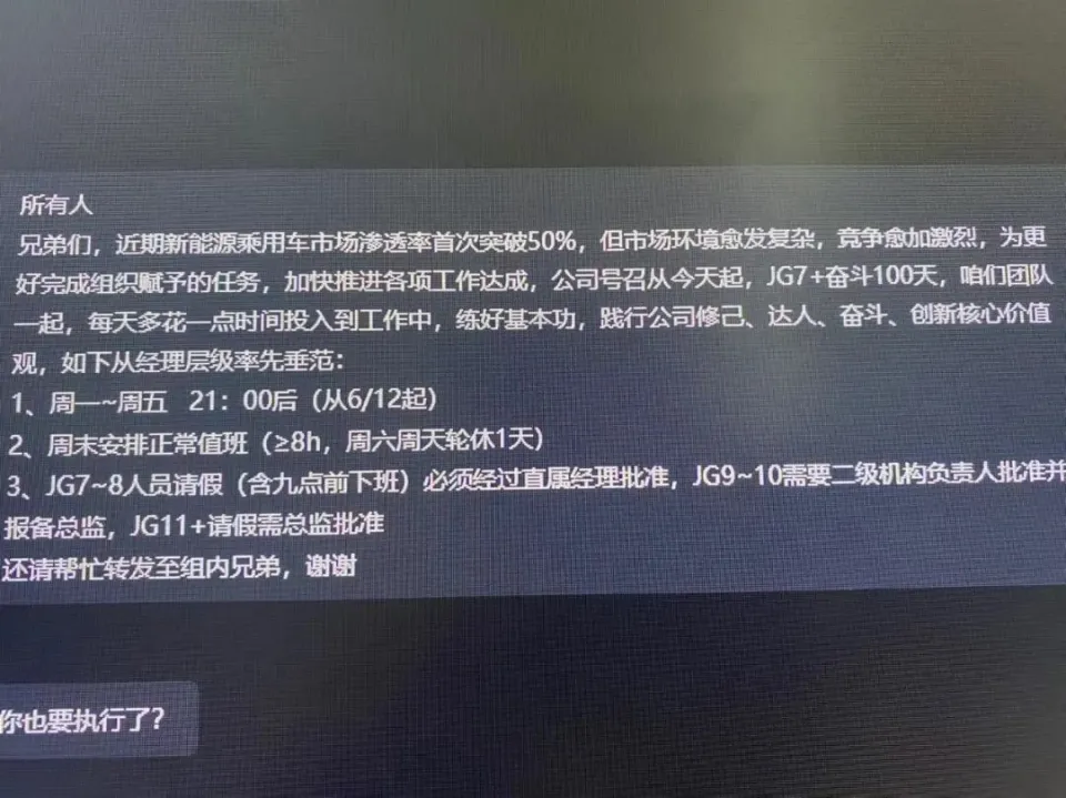 声称不强迫劳动的宁德期间要开始“896”工作制了?公司迅速对此作出回应,其口径却与内部员工爆料大相径庭。 6月17日,一条关于宁德期间实行“896工作制”的听说登上热搜榜第一。 消息称,公司于近期向员工发出“奋斗100天”的号召,即JG7+(职级7级以上)员工从6月12日起,实行“896”工作制。 这意味着,这些员工从早上8时上班到晚上9时放工,一周工作6天,持续百天。同时,该消息还称,外籍员工不强礼服从上述制度。 记者发现,宁德期间内部有着明确的职级体系管理,此中职级7级以上的职位包罗工程师、司理、总监、总裁、董事长等,可以看出,此次传出的加班制度紧张针对公司中高层及技能职员。 该消息一经传出,网上对宁德期间声讨一片,除了对要求员工“896”工作时间的不满,网传内容中的“896”工作制仅要求中国国籍员工服从,外籍员工并不强制的说法更引众怒。 网传消息截图 有内部员工向《国际金融报》记者证实,公司确实有发布“奋斗100天”的消息,但并非通过内部关照邮件发送,而是以群消息转达或口头关照。其分享的谈天纪录中,宁德期间某一团队为相应公司号召,要求自6月12日起,团队内司理层级率先实行周一至周五晚上9点后放工;周六(除周日值班职员当天轮休)安排正常值班,值班时长须大于8小时等规定。 微博热搜数据表现,宁德期间实行“896”工作制的相干话题在10时至18时之间阅读量到达1.1亿,讨论量达2.4万。 事发当日下午,宁德期间方面作出回应:“此事为曲解造谣,公司没有发出如许的规定。” 据相识,宁德期间“奋斗百天”的标语早在2016年便被提及,彼时公司还未有“宁王”称呼,面临市场竞争,董事长曾毓群提出“要以跟竞争对手冒死的精神奋斗百天”。从当时起,各个部分便下达要求,员工开始每天加班至晚上9、10点才气放工,且“任务加班”。 与此次传出的“896”工作制不同的是,2016年并未有明确职级要求,且据员工透露,当时的加班并非强制性9点之后放工,而是根据各自工作状态机动加班。 上海汉盛状师事故所状师王建新告诉记者,根据《中华人民共和国劳动法》规定,用人单元因生产经营须要,经与工会和劳动者协商后可以延长工作时间,但一样平常每日不得凌驾一小时,每月不得凌驾三十六小时。特别环境下,延长工作时间不受此限定。 他表示,宁德期间如果实行了“896”工作制,须要符合《中华人民共和国劳动法》的相干规定,“如果用人单元未与劳动者协商一致,强迫加班,则大概违背劳动法。” 随着中国动力电池市场的快速扩张,宁德期间“奋斗百天”渐渐成为常态。此前,不少求职者在交际平台发文称,口试该公司,口试官会直接提问“可否加班”。 但该征象在客岁动力电池产能过剩风险增大的环境下有所缓解,乃至在宁德期间工厂“强制”双休下,不少工人因“没班上”选择去职。 客岁的校招生梅花(化名)告诉《国际金融报》记者,2023年入职口试时,人力已经不再提问可否加班,同时给出“855”的工作时间,职能岗工作近一年中,除了项目期会拖至晚上8—10点放工,寻常晚上5、6点便可放工。 宁德期间再次提出“奋斗百天”或与其业绩有关。 4月15日,宁德期间公布本年一季度财政数据,营收为797.7亿元,同比下滑10.41%,这已是公司继客岁四序度后,一连第二季度出现营收下滑征象。 对一季度营收再次同比下滑,宁德期间表明称,“受到原材料资本降落,电池资本相应下行的影响,同时受季度性子,公司一季度营收同比下滑。” 如其所言,一季度,国内动力型磷酸铁锂电芯均价降到0.38元/Wh,同比低落52%,环比低落13.6%;动力型三元锂电芯降到0.48元/Wh,同比低落44%,环比低落4%。 受益于资本降落和销量提升,公司净利润仍呈增长趋势,一季度同比增长7%至105.1亿元,但增速已下滑至个位数,远不如客岁一季度的557.97%。 除此之外,随着新能源车企的“内卷”,鄙俚供应链同样受到影响。 多数车企为低落资本,还会选择中创新航、弗迪电池、欣旺达等低价电池装配至较低车型,使得宁德期间的电池装车量渐渐下滑。 5月,宁德期间动力电池装车量为17.29GWh,环比下滑0.77%,市占率为43.87%。相比之下,2021年公司则多次实现单月市占率凌驾50%。 现如今,动力电池代价不断走低、市占率难提,宁德期间的业绩正告别高速增长。 记者 吴迪 编辑 刘星雨 责任编辑 孙霄 |