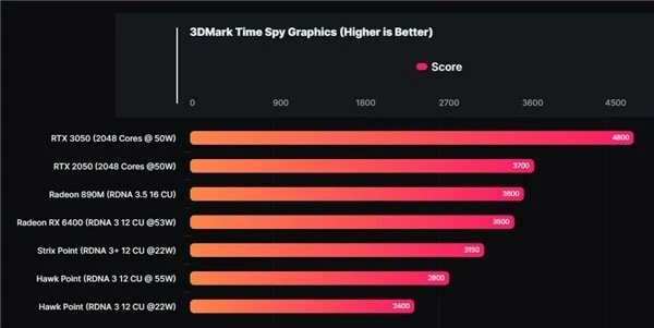 前两天AMD发布了全新一代移动处理处罚器锐龙AI 300,该系列处理处罚器有一大亮点,那就是集成了RDNA3.5架构集成显卡。要知道,RDNA3.5架构的性能照旧不错的,而且此次高端型号Radeon 890M的处理处罚单位直接给到了16个(CU),而且频率2.9GHz,规格非常不错。 现实性能表现也很给力,在3DMARK Time Spy的测试中,Radeon 890M的效果约莫在3600分以上,这个效果已经打平50W的RTX 2050,这也就意味着,集成显卡的性能真的已经完全不输入门独显了。 不过对比RTX 3050,差距照旧比力大的。与50W的RTX 3050相比,Radeon 890M的性能掉队约25%。 (8779048) |