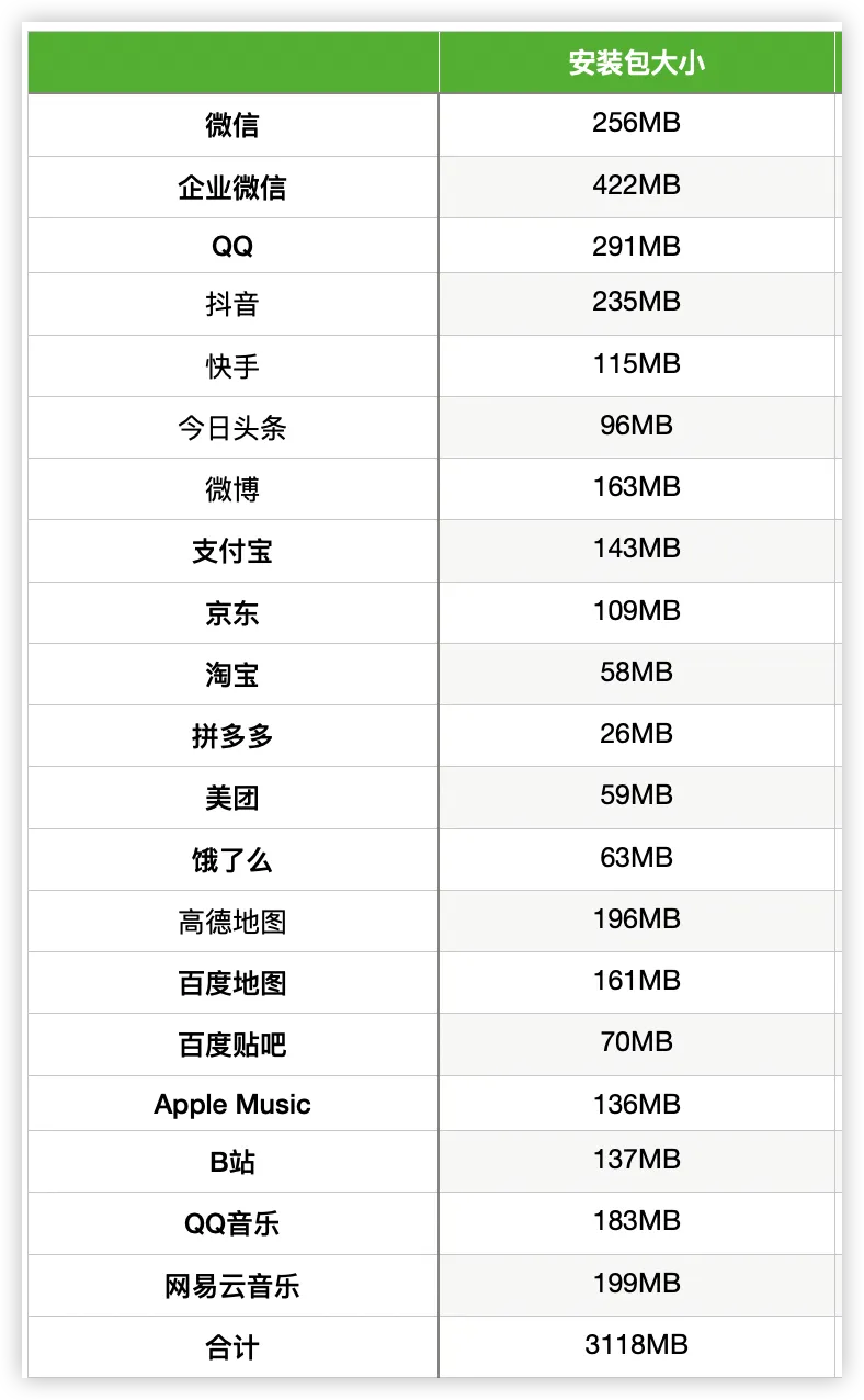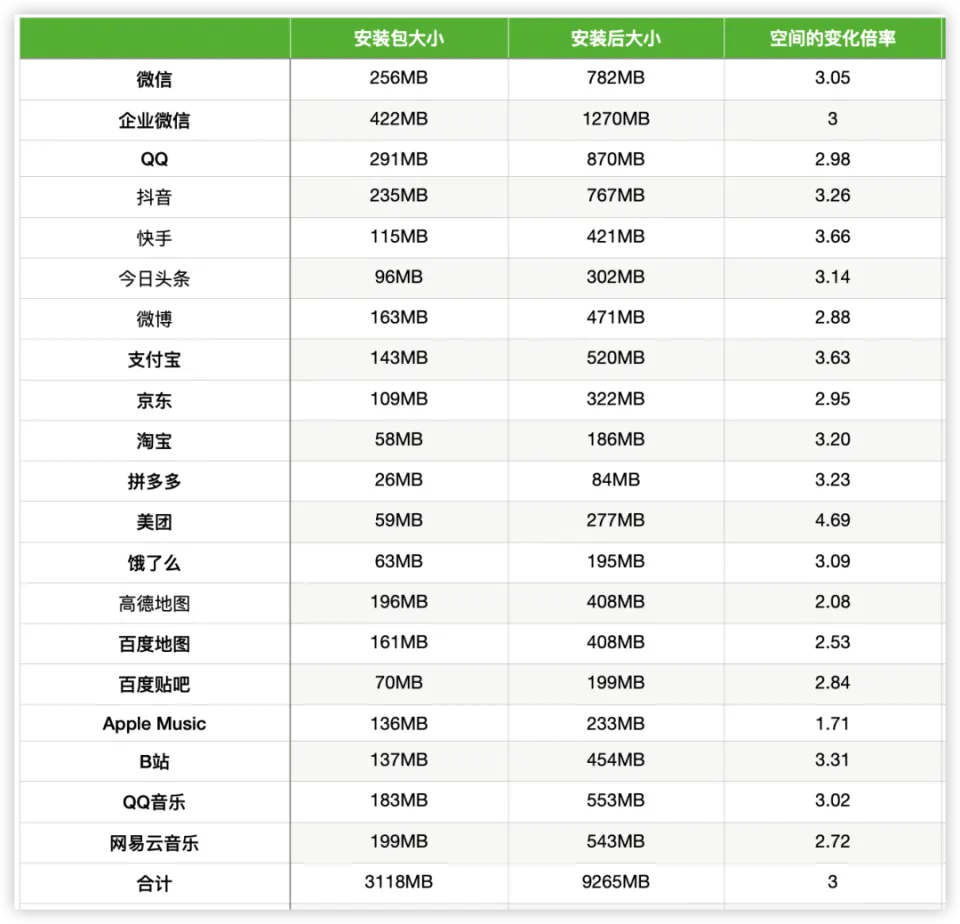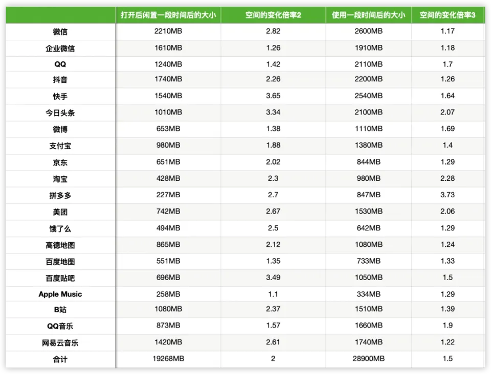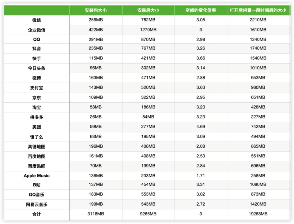 引语差别范例的 APP,功能却是趋同的。 打开手机你会发现,如今的软件就是集大成者! 购物软件可以刷视频,视频软件可以搞交际,交际软件可以玩金融,金融软件还能点外卖,外卖软件还能云原神... 云云大而全的功能,占用空间大也就不特别了。 但是,日益增长的资源占用,真的能让用户体验更好?物尽其用吗?软件 APP 越做越大,是行业共识还是另有缘故起因? 本期,我们测试了大量数据,就为了和各人好好聊聊这些标题,测试真的很耗时间,还请点个小小的赞。 要想观测 APP 体积怎样蛮横生长,我们还得从零开始。先找一台手机,将其规复出厂设置,然后删除自带应用,再安装好 20 款热门应用,具体如图所示。 这 20 款应用包括了谈天交际、视频直播、观光交通、理财付出、影音视听、电商购物、舆图导航、消息资讯八大类。 软件中另有一款国表里通用的 Apple Music,信赖能比力还原真实的使用环境,我们还用新手机号注册登录这些 APP ,尽大概统一测试的标准。 体积变革起首,来看看安装包巨细,20 个安装包中,企业微信的体积最大,422MB 。 拼多多最小,才 26MB ,非常出人意料,也不知道那么多限时秒杀运动它是怎么塞进去的... 虽然最大和最小悬殊 16 倍,但现在来看, 20 款安装包合计才 3GB 出头,根本不会让你容量焦急。 不外,安装好这 20 款软件后,环境发生了 “ 亿点点 ” 变革。 此时的容量占用从全部安装包合计的 3GB ,变成了全部 APP 占用空间合计的 9GB ,后者是前者的 3 倍。 这内里解压缩率带来的影响很大,Apple Music 的 APP 体积是其安装包巨细的 1.71 倍,美团是 4.69 倍,从镌汰下载时间和节流带宽的角度出发,天然是解压缩率越高越好。 固然,APP 的体积肯定不会止步于刚安装完的新生儿状态。 因为当你第一次打开这些 APP,把它们 “ 软生 ” 中贵重的小红点粗暴夺取时,APP 会在背景睁开一系列线程来丰富资源和扩展模块,容量进一步变革。 我们逐一打开这些 APP,登岸全新注册的手机号,然后什么也不动,闲置一段时间,(为避免背景杀应用,中途有主动进入应用以为重新激活)20 款 APP 的合计容量就从刚安装好的 9265MB 变为 19268MB,是原来底子的两倍。 这是什么概念? 就好比说原来企业微信是唯逐一个安装后容量单位变成GB 的大哥,但当你把所有软件打开并闲置半天后,(为避免背景杀应用,中途有主动进入应用以为重新激活)就有别的 7 个款软件和它齐头并进,迈入 GB 的级别。 “ 小而美 ”的微信更是一脚把企业微信踩在脚下,唯逐一个突破了 2GB,然而即便云云,你此时如今打开这个 2GB 多的微信会发现,它的界面还是和刚安装好的时间千篇一律,咱也不知道它在闲置的时间干了些啥,咱也不敢问。 那为了更真实模拟使用者的环境,我们还打开每款 APP 各使用 20 分钟,我们只用默认加载,避免主动型点入。 什么叫主动型点入? 就是像离线舆图、语音包、下载高质量歌曲、游戏小步伐这些,我们齐备绕开不去用它,以免导致某个 APP 的占用容量过于浮夸。 而默认加载很好明白,就是你打开短视频它就会主动播放,这内里此中一些资源会变成缓存文件,如许就能包管,只要你用这款软件的时间比我模拟的 20 分钟更长,那根本上你的占用容量也会比我的更大。 固然,APP 差别,加载的内容差别,产生的缓存巨细也有所差别,以是数据仅供参考。 那么,在每个软件单独 20 分钟,合计 6 个多小时下来的使用中,APP 的合计容量从上一次的 19268MB 变成 28900MB,增长了约 1.5 倍。 但假如和最初的安装包总巨细举行对比,再算上闲置以及每个软件的使用时间,也就是差不多一天,容量就从 3118MB 变成了 28900MB,增长了 826.5%。 你敢信?这增长后靠近 30GB 的容量占用,是真的能实打实刺痛每个还在用 64GB 手机用户的心。 要知道,我们这个还只是轻度的模拟使用,每个 APP 使用的时间最多不凌驾 25 分钟。 但即便是如许,APP 的体积也迎来巨幅上涨。 假如你在装几个热门游戏,128GB 用户也有了显着危急感,大概对于 64GB 或128GB 的朋侪来说,清理空间已经是常态了,是的话请划线。 我们还查看了近来新发的手机,除个别低端机以及 iPhone15 如许把容量当金子卖的手机,256GB 容量起步已成为主流手机的标配。 那么,256GB 是不是就够用了呢? 我们又统计了公司部分小同伴的数据。不丢脸出,我们公司的小同伴都是天生打工圣体,微信占用 20、 30GB 是常态。 身为老板的我更是必要常常确认视频,微信和企业微信的占用分别是 52GB 和 93GB。 像我这种 512GB 都必要常常清理,就更别说容量更小的用户了。 到了这里,我们可以给这个章节做一个总结:安装包的体积很精美,安装后的体积真不少,闲置后的体积让人摸不着头脑,使用后的体积满是痛楚烦恼。 按照这种势头发展下去,容量存储似乎永久也增补不了软件无止尽的增长,要我看,与其买更大容量的手机,不如好好督促这些软件商专心做好空间优化,你附和吗? 运存占用OK,容量的标题我们就先聊到这。 那这 20 款应用下都下好了,趁便就统计一下它们的运存占用吧。 我粗暴的将这些 APP 分为非共通性和共通性。 共通性就好比说微信、QQ 、付出宝这些都可以用饿了么小步伐,付出宝、高德舆图、百度舆图都可以购买飞机票,我把这算成共通性。 而 20 款软件中只有 B 站可以看 4K HDR 视频,而且无视频广告,其他软件达不到类似功能,我就算它黑白共通性。 那显然,具有非共通性特性的软件,根据内