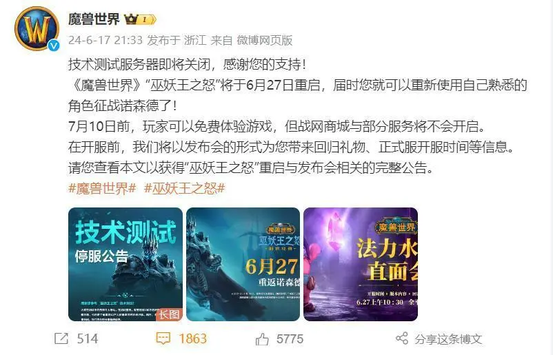 图片来自魔兽官微。 《魔兽世界》官方于6月17日发布消息称,国服删档技术测试正式结束,同时公布“巫妖王之怒”资料片将于6月27日“重启”。届时,玩家可免费嬉戏《魔兽世界》至7月10日。 “软启动”期间,免费玩魔兽6月11日,《魔兽世界》开启了为期一周的国服删档技术测试。 6月17日晚,魔兽世界官方微博(以下简称“魔兽官微”)发文称,“技术测试服务器即将关闭,感谢您的支持!”。同时,魔兽官微表现,“巫妖王之怒”将于6月27日重启,届时玩家就可以重新使用自己熟悉的脚色征战诺森德(注:魔兽世界区域名称)。 根据魔兽官微公告,《魔兽世界》“巫妖王之怒”将于6月27日上午开启软启动,并连续至7月10日。期间,嬉戏游戏无需斲丧游戏时间,无论账号中是否仍留有游戏时间,玩家都可以直接进入游戏。届时,网上商城也将关闭。玩家无法通过商城购买商品,已经购买的脚色转移、脚色改名、阵营转换、种族变吏、脚色直升等服务也将暂时无法使用。 值得一提的是,固然玩家们只能在已有脚色的服务器上创建新脚色,但是运营方将在软启动期间开设新的服务器,供新玩家注册、创建游戏脚色。 图片来自魔兽官微。 据悉,在软启动7月10日结束后,将进行预计24小时的停服维护。“维护完成后,‘巫妖王之怒’的全部服务就将完全重启,服务器限定也会排除”,魔兽官微方面表现。 6月27日发布国服新进展此外,魔兽官方将于6月27日上午10:30举行发布会。届时,将公布一系列回归礼物,以及正式服的开服时间等重要信息。 图片来自魔兽官微。 针对魔兽官微本次预报的内容,有业内人士表现,“所谓‘软启动’,着实就是免费公测。究竟版号之事迟迟未决,正式开服就没有准确时间表。怎样满足玩家的需求,同时维持一个产物热度,就需要接纳一些本事,好比各种公开测试。” 南都记者就27日“重启”之事接洽了网易和暴雪方面,停止发稿时,两边未作干系回应。 采写:南都记者 石力 |