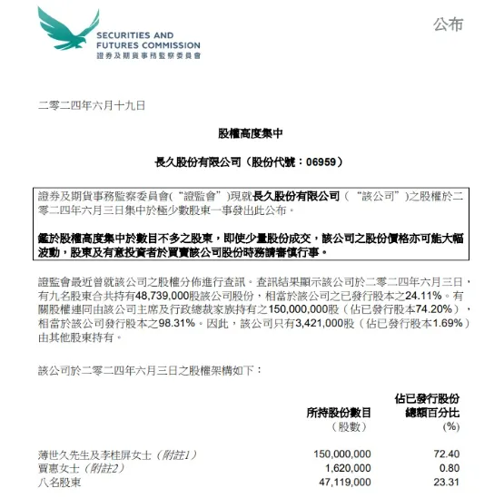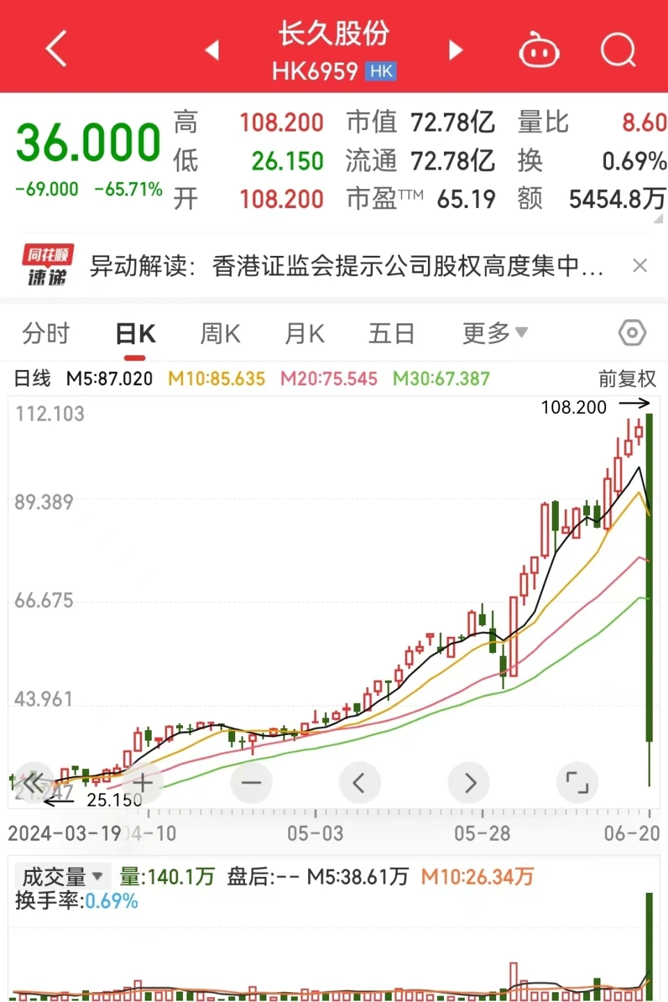 每经编辑:杜宇 港股市场本日(6月20日)再现“崩跌”股。 行情数据表现,恒久股份(HK6959)本日盘中跌幅一度超75%。停止收盘,恒久股份报36港元,跌幅65.71%,140亿港元市值蒸发(约合人民币130.2亿元)。 在此之前,公司股价一起上涨,从年初最低的6.05港元附近涨至本日盘中最高的108.2港元,期间自低位的最大涨幅靠近17倍,市值一度突破212亿港元。这不但让恒久股份成为港股市场年初至今涨幅最高的上市企业,而且独树一帜,成为唯一一家股价涨幅超过10倍的个股,表现极为亮眼。 恒久股份股价今日为何大跌?发生了什么? 香港证监会发出股权高度集中警示消息面上,香港证监会提示恒久股份股权高度集中。6月19日,香港证监会发布公告称,香港证监会近来曾就恒久股份的股权分布举行查讯。查讯结果表现,6月3日,有9名股东共计持有4873.9万股该公司股份,相称于该公司已发行股本的24.11%。有关股权连同由该公司主席及行政总裁家族持有的1.5亿股,占已发行股本的74.2%,相称于该公司发行股本的98.31%。因此,该公司只有342.1万股,占已发行股本1.69%,由其他股东持有。 香港证监会表示,鉴于股权高度集中于数量不多的股东,纵然少量股份成交,其股价亦大概大幅颠簸,提示股东及故意投资者交易时务请审慎行事。别的,按市场投资者们的预期,恒久股份预计9月初会被调入港股通,但由于证监会已经警示该股为股权高度集中的公司,按照港股通调解规则,恒久股份将不会被纳入港股通。 值得留意的是,据恒久股份于1月8日发布的终极发售价及配发公告。公司控股股东于上市时需禁售的股份为1.5亿股,占总股本的74.2%禁售期末了一天为2024年7月8日(第1个六个月期间),距今仅剩10来个买卖业务日。 巨量解禁的档口,又遭证监会提示股权高度集中风险。对于已经赚得盘慢钵满的筹码而言,“卸货抢跑”不失为上佳之选。 是否会退市?若低于25%的已发行股份由公众人士持有,则大概触发退市。那么,恒久股份是否存在这个标题? 恒久股份在1月9日于香港联交所的主板以招股价5.95港元/股上市。根据公司在1月8日发出的终极发售价及配发公告,公司主席及行政总裁家族,以及9位股东于上市时持有197528000股,占已发行股份总数的97.71%。 据恒久股份6月19日公告,根据可得资料及就董事经作出统统公道查询,董事确认于6月3日及公告日期不少于25%的已发行股份由公众人士持有,且该公司已维持联交所证券上市规则规定的充足公众持股量。 恒久股份表示,鉴于股权高度集中于数量不多的股东,纵然少量股份成交,股份代价亦大概大幅颠簸,股东及故意投资者于交易股份时务请审慎行事。别的,由于股权高度集中,公司证券未必有真正的市场,或其股权大概集中于少数股东手上。 公开资料表现,恒久股份是一个细分赛道的龙头。恒久股份的总营收中,占比约九成的是质押车辆监控服务业务。 根据恒久股份发布的2023年全年业绩数据,公司实现收入和调解纯利分别为6.4亿元、1.54亿元,分别同比增长17.1%、57.6%。此中,质押车辆监控服务作为公司核心业务,客岁实现收入占总收入的89.6%。 逐日经济新闻综合公开资料 |