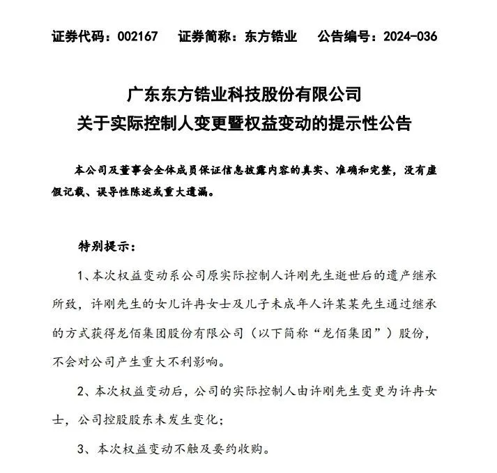 6月20日晚间,钛白粉巨头龙佰团体(002601)及其旗下东方锆业(002167)同步披露,因公司原控股股东、实控人许刚逝世后的遗产继承所致,许刚的女儿许冉及儿子未成年人许某某通过继承的方式得到公司股份,不会对公司产生庞大倒霉影响。本次权益变动完成后,公司控股股东、实控人将由许刚变动为许冉。 许冉系一名“90后”,她也是龙佰团体首创人、原现实控制人许刚老师的女儿。 1个月前,龙佰团体董事会沉痛公告,公司实控人许刚因病逝世,公司当时体现,许刚持有的公司股份将按法律、法规办理继承手续。 “90”后女儿继承大权 成2家A股实控人 龙佰团体原控股股东、现实控制人、光荣董事长许刚于2024年5月20日因病医治无效离世,享年61岁。 上海市静安公证处于2024年6月12日出具《公证书》体现,许刚生前未订立遗嘱,也未与他人签订《遗赠扶养协议》。 经公证后,许刚生前持有龙佰团体6.27亿股股份(占总股本的26.25%),由其女儿许冉继承5亿股,占公司总股本的20.95%,其儿子,未成年人许某某继承1.27亿股,占公司总股本的5.30%。 鉴于许某某系未成年人,其母亲王霞系未成年人许某某法定监护人,故未成年人许某某因法定继承取得的上述公司股份所对应的统统权利,包罗(但不限于)参会权、提名权、提案权、表决权等身份性权利,均依法由王霞代为利用,并登记在王霞名下。 根据王霞与许冉签订的《表决权委托协议》的约定,王霞作为未成年人许某某的法定监护人,将其代未成年人许某某利用权利的龙佰团体全部股份所对应的身份性权利全部委托许冉利用。委托限期至2028年10月23日(即未成年人许某某十八周岁生日之日止)。根据上市公司公告分析,许某某是一位年仅14岁的学生。 至此,许冉合计持有龙佰团体6.27亿股表决权,占据表决权股份总数的比例为26.25%,许冉成为龙佰团体的控股股东、现实控制人。同时,因龙佰团体为东方锆业的控股股东,许冉亦成为东方锆业的实控人。 早已规划二代接班 在龙佰团体实控人许刚离世前一年,该公司举行了董事会换届选举。 2023年3月,龙佰团体董事会换届时,刚满60岁的许刚正式卸任董事长职务,名义上退居二线,而许冉进入了董事会。 彼时,龙佰团体还公布,为恒久保持公司活力和竞争力,进一步优化公司治理,公司对非独立董事提名及任职年岁举行限定,即原则上60周岁以上不得被提名或担当公司非独立董事,并写入《公司章程》。 同时,许刚提名和奔流、许冉、吴彭森、申庆飞、陈创建、王旭东等多名董事进入龙佰团体董事会,组建第八届董事会。除了和奔流之外,别的人均为三四十岁的年轻一代管理人员。值得一提的是,和奔流(现任董事长),1968年出生,2026年任期停止后为58岁,按照《公司章程》,最多也仅能再担当一届非独立董事。 2023年4月的龙佰团体调研活动中,面对申万化工、广发基金、易方达基金、中信证券自营、高毅资产等机构人员共80人,许刚体现,为形成“新老瓜代、接续发展”常态化机制,董事会人数由12名调解为9名,此中非独立董事6名,独立董事3名。新一届董事会年轻化、高学历、专业化。新一届非独立董事除保存60后的董事、总裁和奔流,多为70、80后及90后,均为研究生以上学历。 许刚还体现,“我本人许刚退出董事会不会对企业造成什么影响,起首,我照旧公司控股股东、现实控制人,这是A股上市公司较为普遍的做法,同时我将继承关注公司庞大决定;其次,我的女儿许冉进入董事会,也能代表我的一些想法。” 过往履历信息体现,许冉,女,1990年出生,中国国籍,无境外永世居留权,硕士研究生学历,持有香港住民身份证。许冉拥有澳大利亚麦考瑞大学工商管理专业硕士学位,2014年开始进入龙佰团体工作,2014年10月至2017年3月任龙佰团体业务司理,2014年11月至今任佰利联(欧洲)公司董事,2015年5月至今任佰利联(美洲)公司董事,2017年3月起任龙佰团体总裁助理,2021年4月起任焦作市年轻一代民营企业家团结会副会长,2022年6月至今任Image Resources董事,2022年7月起任焦作市工商联副主席。 14岁儿子继承超24亿市值股票 作为环球最大的钛白粉企业,龙佰团体钛白粉产能151万吨/年,海绵钛产能5万吨/年,规模均居天下前线;磷酸铁锂产能5万吨/年,磷酸铁产能10万吨/年,石墨负极产能2.5万吨/年,石墨化产能5万吨/年。公司钛产业基地结构河南、四川、湖北、云南、甘肃等五省六地市,开端形成从钛的矿物采选加工,到钛白粉和钛金属制造,衍生资源综合利用的绿色产业链;锆成品由公司控股子公司东方锆业经营。 现在来看,在许冉等年轻一辈接班后,龙佰团体的经营团体比力稳健。 2023年度,龙佰团体实现业务收入267.94亿元,同比增长10.92%;归母净利润32.26亿元,同比减少5.64%。2024年第一季度,公司实现业务收入72.94亿元,同比增长4.54%;归母净利润9.51亿元,同比增长64.15%。 停止6月21日收盘,龙佰团体(002601.SZ)市值445亿元,东方锆业(002167.SZ)市值为45亿元,两家上市公司市值合计490亿元。以龙佰团体和东方锆业当前的股价粗略估算,许冉、许某某继承的股票市值分别约为95.44亿元和24.15亿元。 声明:文章内容和数据仅供参考,不构成投资建议。投资者据此操作,风险自担。 编辑|程鹏 杜恒峰 杜波 校对|何小桃 封面图片泉源:逐日经济新闻 刘国梅摄 逐日经济新闻综合自公司公告、21世纪经济报道、证券时报 逐日经济新闻 |