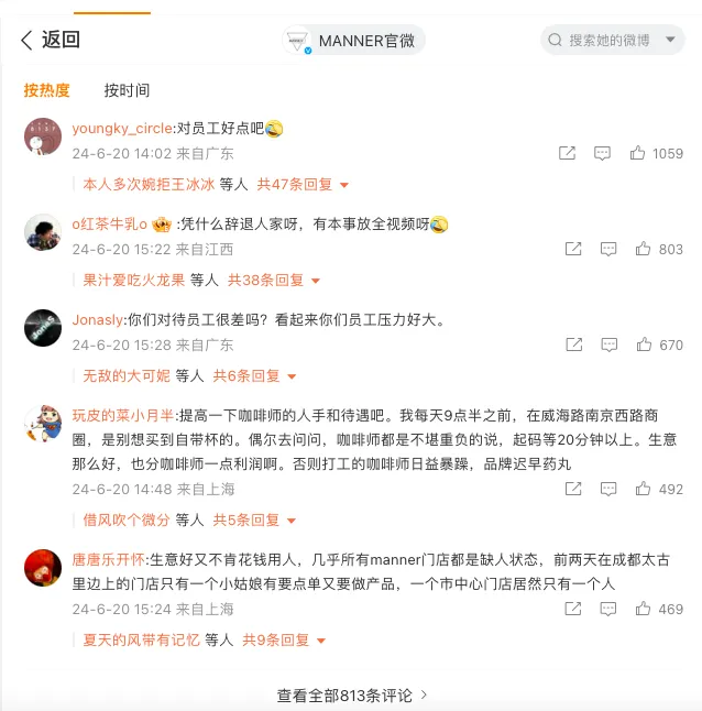 “对员工好点吧。” 某网友在manner微博留言。 昨晚,着名网红咖啡品牌manner,一口吻上了6个热搜! 原因是,在同一天(6月17日)出现两起,店员与顾客的辩论事件: 一个男店员殴打女消耗者,另一个女店员向女消耗者泼咖啡粉。 从传统的贸易代价观和危急公关视角,这都属于不应该发生的事。 由于顾客是天主啊! 按照传统危急公关的应对,品牌就是“三板斧”:致歉,开除,亮相! manner确实也是这么做的,把女员工开除了。 千万没想到,消息一出,manner的微博留言区,被网友“围攻”了。 完全没有人关心被打和被泼的顾客,几乎都在喊话manner:对员工好点! 大叔摘抄几个: