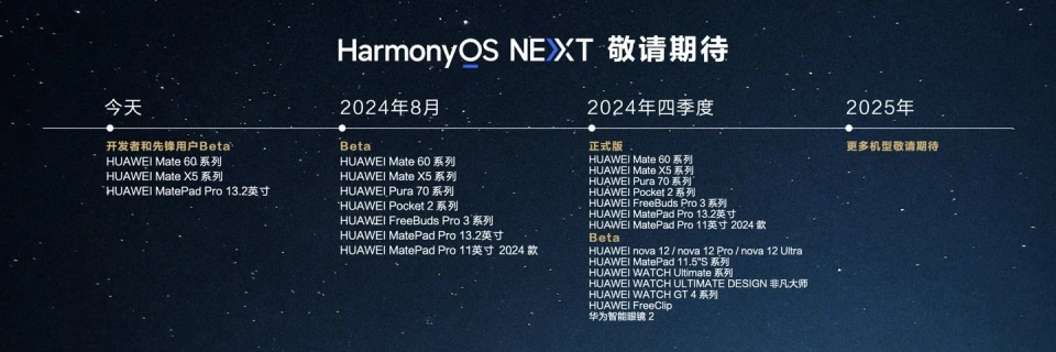 对于智能手机来说其性能不但仅要看硬件设置还要看使用体系软件,华为已经在HDC 2024华为开发者大会上正式推出了纯血版鸿蒙HarmonyOS NEXT新体系。 如今鸿蒙 HarmonyOS NEXT 新体系已经开始向开发者和先锋用户开启beta测试,首批支持升级的机型为华为Mate 60系列手机,华为Mate X5系列手机及华为MatePad Pro 13.2英寸平板电脑,8月开启首批公开测试升级。 而华为本年将要推出的Mate系列新旗舰华为Mate 70系列手时机首发搭载HarmonyOS NEXT正式版。 华为Mate 70会在第四序度的时间推出与大家见面,从如今信息来看华为Mate 70系列手机将会搭载全新麒麟处置惩罚器,首发搭载HarmonyOS NEXT正式版,在性能方面拥有非常不错的表现。 其他方面根据爆料,华为Mate 70系列手机屏幕设计方面与前代差不多,接纳前置三挖孔设计,影像方面将会标配豪威团体传感器。 |