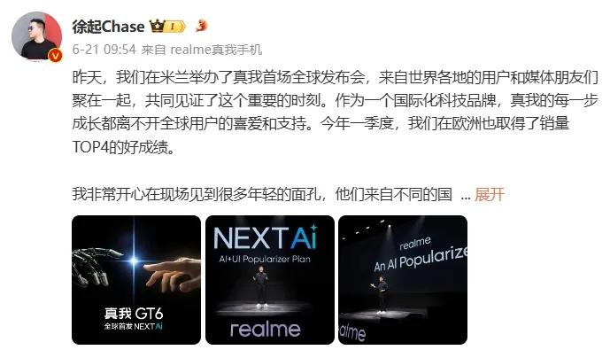 同时,徐起还曾发文预热称:“即将登场的真我GT6,将率先搭载NEXT AI,在AI功能和体验上再次突破,将AI科技与用户场景举行亘古未有的深度融合,成为行业AI手机的新标杆。此外,真我GT6在质感、性能、续航等方面都到达了行业顶峰水准,震撼民气的直屏旗舰,敬请期待。”