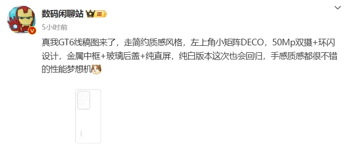 本日,数码博主@数码闲聊站 分享了真我GT6的线稿图,并透露,真我GT6走的是简约质感风格,后置镜头接纳了左上角小矩阵DECO,5000万像素双摄+环形闪光灯操持。