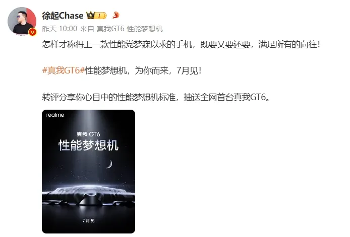 不久前,真我realme副总裁、全球营销总裁、中国区总裁徐起公布,将于7月发布真我GT6,号称是“性能空想机”。