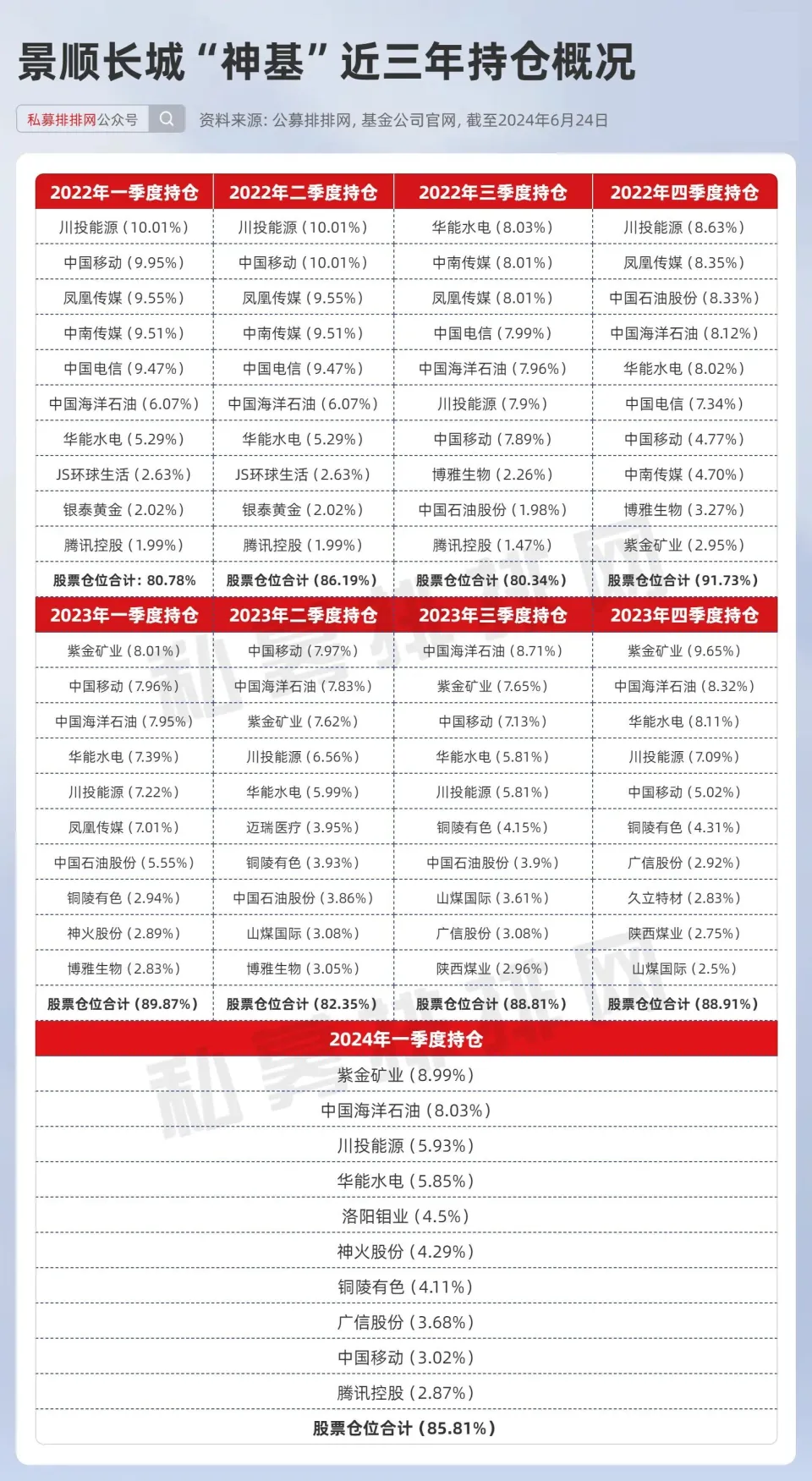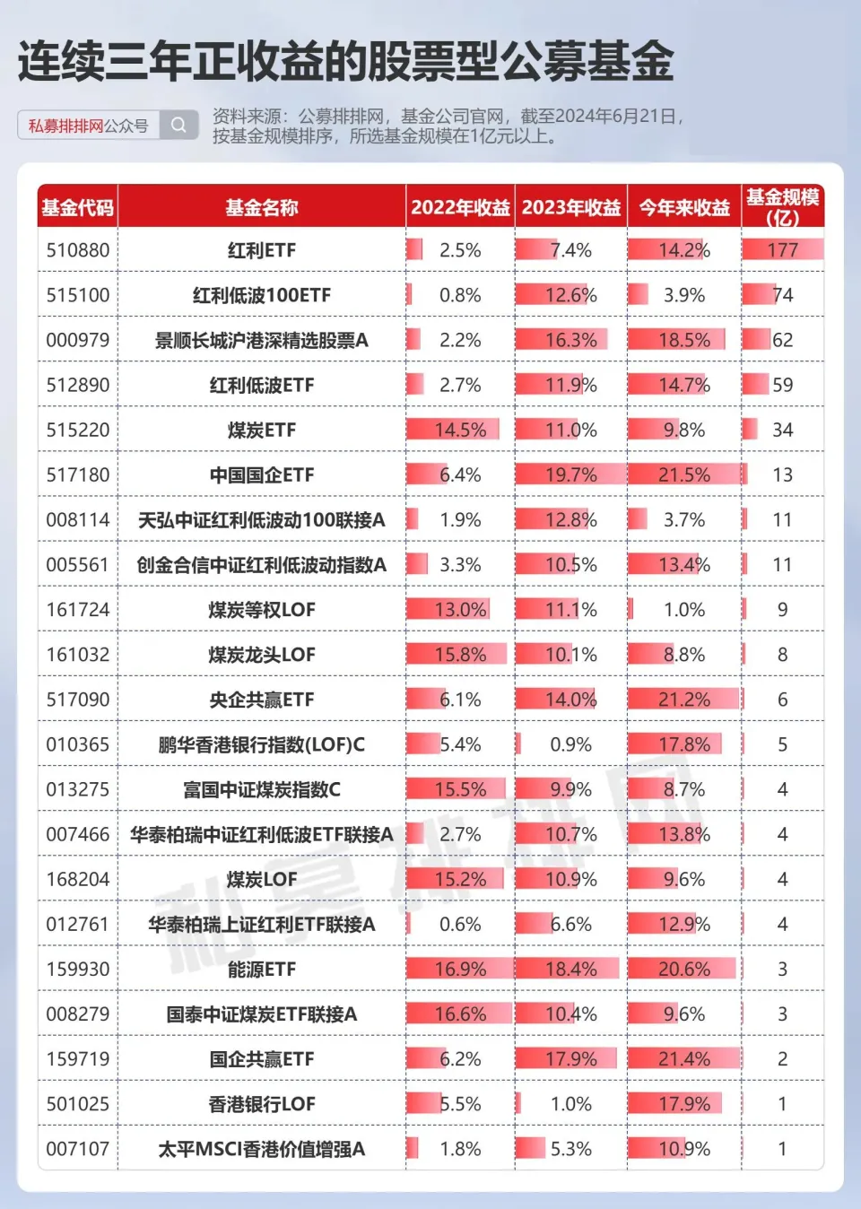 2022年以来,全球市场遭受了新冠疫情、俄乌辩说以及美联储加息等一系列巨大事件的打击,中国A股市场也因此承压,上证指数反复跌破3000点,月线一度六连阴;其他主要股指同样不尽人意,尤以创业板指数最为疲软,自2022年初至本年6月21日已重挫46.17%,几近腰斩。 股民气伤又无奈,“三安光电跌成了一安光电、坚朗五金跌成了坚朗一金、五粮液跌成了二粮液、微创医疗跌成了重创医疗”;受伤的基民也骑虎难下:“我欲清仓归去,又恐迅速反弹,踏空不胜寒”... 不外,即便是在如许的市场情况下,仍旧有股票型公募基金逆势捕获超额收益、交出了2022年至今连续三年正收益的亮眼结果。 全市场仅21只股票型基金连续三年取得正收益 公募排排网数据显示,制止6月23日,有超三年业绩的股票型基金合计2399只,2022年以来均匀收益为-20.1 %。 此中2022年以来连续三年均取得正收益的基金仅有21只,合计管理规模495.5亿,近三年均匀累计收益为44.9%,跑赢同期沪深300指数74.1%。 2022年以来连续三年累计收益最高的是汇添富基金的“汇添富中证能源ETF”,三年累计收益95%。公开资料显示,制止3月31日,该产物规模为3.37亿,跟踪标的为中证能源指数,行业设置上主要为采矿业、电力、热力等行业。该产物的基金经理是董瑾,她是北京大学西方经济学硕士,拥有12年证券从业履历,任职于汇添富基金前,曾任职于国泰基金。 景顺长城的神基“千里挑一”,为机构重仓持有 景顺长城基金的“景顺长城***”是2993只股票型基金里唯一2022年以来连续三年取得正收益的自动管理型基金,以近三年44.1%的收益位居榜四。该产物成立于2015年4月,大概得益于精彩的业绩表现,其管理规模从2023年底的40.4亿元迅速增长至2024年3月31日的62亿元。别的值得一提的是,制止2023年底,该基金有38亿元的份额为机构所持有。 根据公募排排网的资料显示,执掌该产物的基金经理属代价投资派,通过严守安全边际以控制回撤风险。他拥有17年的丰富从业履历,在其职业生涯中交出了年化回报14.9%的精彩结果单,他管理的14只产物迄今为止全部取得正收益。 梳剃头现,该基金股票仓位从2022年一季度的80.78%逐渐抬升至2022年四序度的91.73%,随后虽有所低沉,但也维持在85%-90%的区间。该基金十大重仓股多为行业龙头公司,恒久谋划妥当、分红稳固、估值也不高,尤其是紫金矿业、中国海油、川投能源、中国移动、华能水电这五家公司,已经作为前十大持仓持有超2年。 该产物的基金经理克日在公开平台写到:“现在的持仓都符合我们的投资理念,拥有较佳的商业模式和极强的谋划壁垒,当前的估值也处于公道的范围,盼望通过恒久持有这些公司力图给持有人带来连续的回报”, “现在,能源相干的资源板块在我们的投资组合中占据较大比重,我们对这一范畴连续看好。固然经济当前面临一定压力,但全球其他地域的经济表现稳固,对资源品特殊是能源的需求连续增长。”。 连涨三年的持仓暗码,国家队也重仓! 回过头看,连续三年取得正收益的股票型基金主要都得益于重仓持有煤炭、石油、银行、电信运营商等高股息股票。 由于本身估值较低、分红派息稳固,在一众白马蓝筹杀估值之际,高股息板块逆势走强,成了资金的“避风港”,近期也获”国家队“的青睐。6月19日,中国国新发布公告称,旗下的国新投资认购了3只中证国新港股通央企红利ETF,此举向市场传递出了看好行业职位突出、谋划妥当、现金流充沛、分红高的公司的信号。 (图片泉源:中国国新控股有限责任公司官网) 别的,从国新投资在A股的结构也可以看出其对高股息的青睐,Choice数据显示,制止2024年一季度末,国新投资共持有36家公司,合计持有市值328亿元,当中有35家公司为央国企控股;持有的一家港口航运公司、两家煤炭开采公司近12月股息率均超10%。 关于高股息资产的投资代价,多家券商所见略同”。 申万宏源在其研究陈诉中夸大,三季度期间,广义高股息资产将继续引领市场投资主线。短期内,高股息股价内涵稳固性率先规复,市场弱势中“稳固器”作用正在表现,因此,发起投资者继续持有那些基本面坚固、尚未下滑的高股息资产。 交银国际分析师万丽分析指出,当前支持高股息计谋的外部与内部情况稳固。国际市场中,美联储降息进程未完全符合市场早前预期,市场风险偏好仍旧方向守旧。而国内市场,低利率的情况也促使对高股息资产的需求显著上升,这一趋势未见逆转。 华西证券的首席计谋分析师则从另一维度剖析:自2023年三季度开始,企业拙质僻出增速减缓,这在一定水平上进步了企业的分红潜力,促使更多上市公司倾向于实验分红政策以回报投资者。猜测未来,鉴于资产设置荒仍存在,A股仍将是热门快速轮动的风格,高股息红利品种照旧后续重点设置方向。 在此,笔者呈上近期券商给出“买入评级”、国资委控股的高股息公司名单,烦请扫码检察。 【资料泉源】:公募排排网、基金公司官网 【收益盘算阐明】:按区间收益率由高到低举行排名。 【排行阐明】:以上排行不代表公募排排网从事基金评价工作,公募排排网仅对自身所收录的公募基金产物以一定规则举行排行,上述排行不得作为投资者投资决定唯一依据,仅供投资者自研参考利用。 【风险显现】:投资有风险,基金的过往业绩并不预示其未来表现,基金管理人管理的其他基金的业绩并不构成基金业绩表现