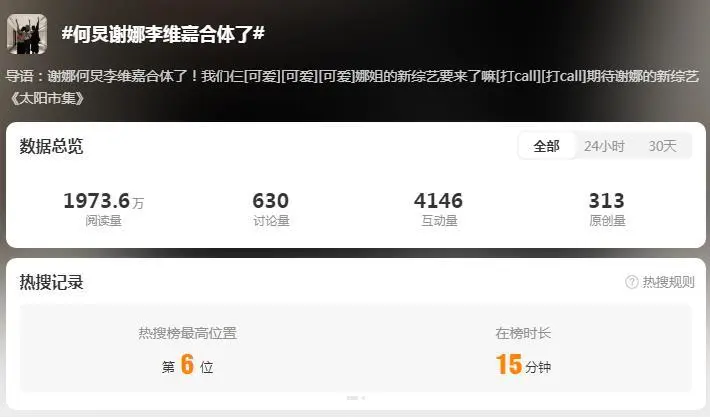 谢娜何炅李维嘉合体了,冲上热搜! 清晰可见的是,谢娜在社交平台发文,只有短短三个字,却引发关注。 “我们仨”。 发文反面有三个笑脸,从而表达谢娜对三人合体的一种高兴之情。 想想看,不是吗? 当何炅、李维嘉、谢娜,多年后,再次合体,不仅仅是一种缘分的使然,更是相互心灵的约定。 谢娜在发文下方公开了一张图片。 图片中的三个人,以背影的形式出现,看上去充满神秘感。 不熟悉的人,大概都不知道他们是谁? 从谢娜的表述来看,这三个人无比密切,带来了一种再次相逢的暖和感觉。 从这张图片来看,中心戴着帽子的谁大家身高最高,周边的两个人身高低一点。 如许一种站位拍照,看起来非常和谐。 而在拍照的时候,三个人都举起一只手,动作整齐划一,很有节奏感。 由此表明了三人团队密切感和归属感。 究竟上,谢娜以这种方式,抛砖引玉何炅、谢娜、李维嘉的公开露面,也是一种非常好的选择。究竟,曾经的《快乐大本营》主持人有多辉煌。 还记得何炅、谢娜、李维嘉、吴昕、杜海涛一起继续主持的《快乐大本营》节目,充满了欢声笑语,带来省级卫视最火爆的综艺节目。 主持人和明星一起参与游戏演出,你中有我,我中有你,让综艺节目标快乐陪同观众左右。 现如今,再回想起来,仍旧让人快乐无比,别有一番滋味在心头。 但对于主持人谢娜来说,却是一种很好的回想。 对此,网友们纷纷关注“何炅谢娜李维嘉合体了”话题消息。 这一话题一度登上热搜榜第6位的位置,话题阅读量凌驾1973万,互动量4146,讨论量630。 网友们在批评区热议起来,表达了自己最真实的感受。 “你们三个,你们五个,可以一起录个团综吗” 网友对谢娜、李维嘉、何炅就是如此期待,期待他们的新节目。 那么,网友可以大概空想成真吗? 其实,多年后,再来回首《快乐大本营》节目,更多的是一种团圆与念想。 究竟,当时候,谢娜、何炅、李维嘉等主持人欢聚一堂,其乐陶陶,别有一番滋味在心头。 现如今,每个主持人的发展也都不一样。 尤其是主持人何炅,他目前主持《歌手2024》节目,带来了感动民气的结果。 进一步来看,谢娜在社交平台发文和配图,起到了一种引人关注的作用,具有以下两大意义。 第一大意义,谢娜对于“我们仨”合体同框,表达了高兴之情。 第二大意义,谢娜多年后再回顾“我们仨”的综艺故事,也就带来满满的快乐和温馨。 尤其是在一年之中承上启下时间段的时候,一个人就会回望之前走过的路,从而给厥后的路指引方向。 不过,总而言之,可以大概有一段精美的回想萦绕心头,也不失为人间间的一种快乐和乐成。 祝福你们。 |