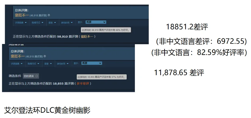 你会看到他们为魂系神作老头环的DLC“黄金树之影”绝不客气地奉上差评(值得注意的是,中文语言差评率和非中文语言差评率悬殊巨大)