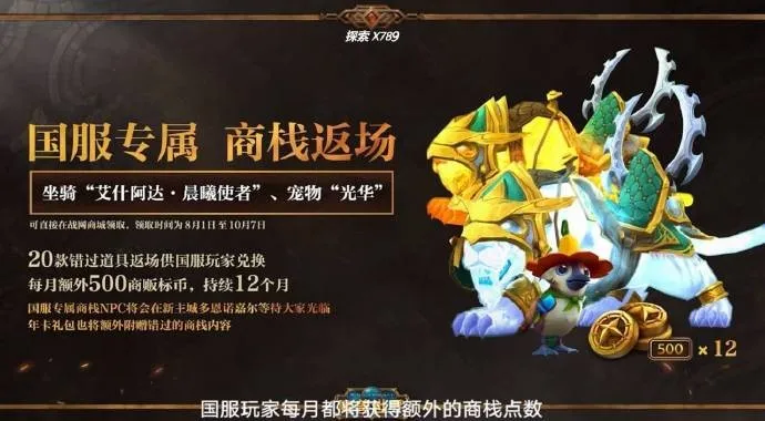 此外,魔兽还为等候已久的国服玩家带来了不少赔偿:如国服专属坐骑“艾什阿达·晨使者”、宠物“光华”,14天免费游玩时间,每月得到500额外商栈点数,怀旧服一个月50%经验提升等。