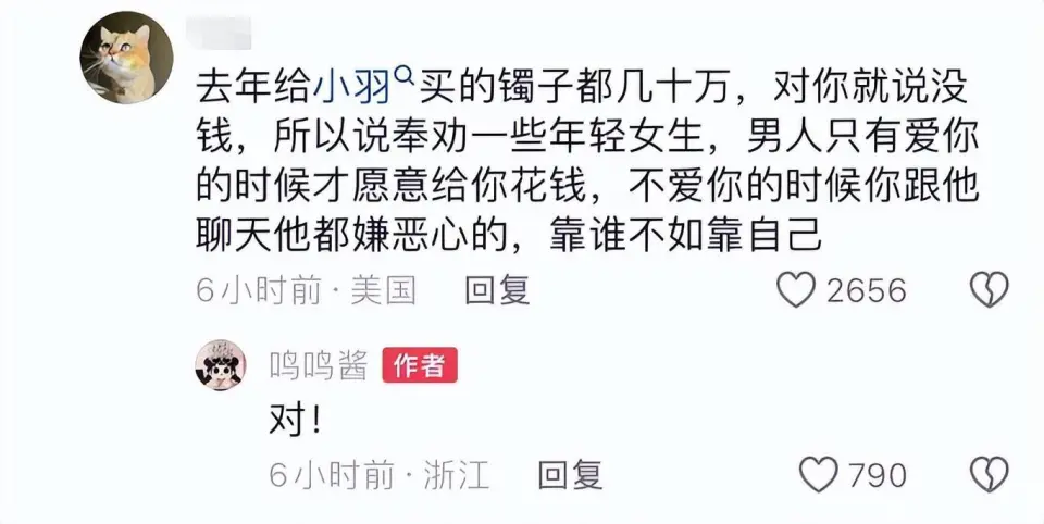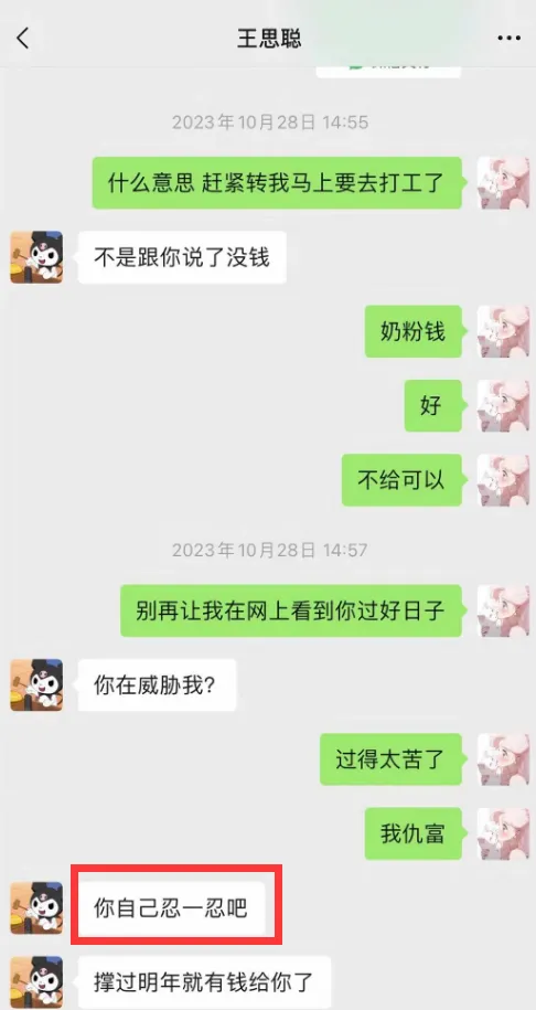 黄一鸣自从公开与王思聪有一女儿后,其热度猛涨,各人一方面等待着王思聪的回应,一方面看黄一鸣还会不会爆出更多猛料,果不其然,在王思聪缄默沉静冷处置处罚后,黄一鸣又晒出与王思聪的谈天记载,信息量挺多。 黄一鸣说王思聪不是不负责任,只是太困难了,他很爱女儿闪闪。内容中表现,王思聪在客岁10月份,曾明白拒绝付出女儿奶粉钱,还哭穷说自己没钱,让黄一鸣忍一忍,撑过来岁就有钱给了。 之前黄一鸣曾说没有拿过王思聪一分钱,女儿也都是她独自抚养的,可这份谈天记载却表现是她自动开口给王思聪索要奶粉钱,只是没想到遭到对方的拒绝。 甚至在索要未果的情况下,说出“别再让我在网上看到你过好日子”这种话,王思聪显然不吃她这一套,最终还是没付出孩子奶粉钱。 着实多少能感受到,黄一鸣还是很在意王思聪的,即便对方不付出抚养女儿的费用,她仍以为王思聪很爱孩子,还说王思聪承认女儿的存在。 黄一鸣还说自己不是为了钱,只是想找王思聪聊谈天,这是拿女儿当捏词,来找王思聪谈天?看来黄一鸣对王思聪还是有感情的,只是对方已不爱。 黄一鸣还表明说,自己确实没花他的钱。 大概此时的黄一鸣已清醒,究竟王思聪客岁还给另一个前女友小羽花几十万买镯子,却拒付奶粉钱,这就是不爱了的表现。 黄一鸣还说王思聪的父母并不知道有孙女,有网友发起她带上孩子还有亲子证明去找王健林,可黄一鸣以为太贫困。 固然没能要来孩子的抚养费,对方不带孩子,但黄一鸣以为这很正常,只是不想忍一辈子。 看了黄一鸣和王思聪的谈天记载,网友觉得挺搞笑的,有说,没想到连王校长也拖欠养娃费用,也难以置信王思聪居然没钱给孩子买奶粉。 还有网友留意到,王思聪居然用库洛米当头像,这反差好大,感觉萌萌的。 还有说,看了王思聪和黄一鸣的对话,感觉像两个小学生的对话,王思聪有种淡淡的幽默。 固然黄一鸣轻描淡写的说王思聪拒付孩子奶粉钱,但也都知道单身妈妈独自抚养孩子,也确实很不容易,要一边照顾孩子一边工作,这其中的心伤当过妈妈的都深有相识吧。 幸亏黄一鸣的家人能帮着带孩子,只管给孩子一个温馨的发展情况,前段时间一家人还给闪闪过了一岁生日,小可爱在家人的陪同下快乐发展。 而此时的王思聪仍在外陪着新女友游玩,隔三差五被偶遇,完全不在意黄一鸣在网上的各种爆料,真就是不爱了都懒得回应了。 之前还有采访说黄一鸣盼望女儿继承王思聪的产业,不过本人随后否认这些内容,盼望各人能理性吃瓜。 不管怎样,还是盼望王思聪能多关心下孩子吧,究竟孩子是无辜的,他也该为孩子的到来负责。 |