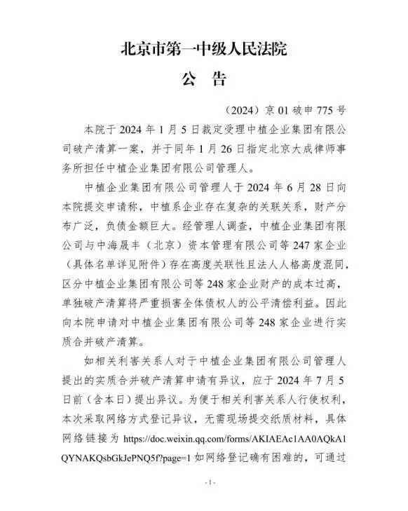 综合丨观察员 谢帝 审校夏期见 中植企业团体有限公司等248家企业被申请实质归并休业整理。 6月28日,据中植企业团体消息,北京市第一中级人民法院发布公告称,中植企业团体有限公司管理人于2024年6月28日向本院提交申请称,中植系企业存在复杂的关联关系,财产分布广泛,负债金额巨大。经管理人观察,中植企业团体有限公司与中海晟丰(北京)资源管理有限公司等247家企业存在高度关联性且法品行德高度混同,区分中植企业团体有限公司等248家企业财产的成本过高,单独休业整理将严峻侵害全体债权人的公平清偿长处。因此向本院申请对中植企业团体有限公司等248家企业举行实质归并休业整理。(以下简称:中植或中植系) 中植系的幻灭早有征兆。早在2022年,就有市场就传出“中植系”发展过于激进,大量超高投资产物设置,在遭遇市场颠簸时,大概引发产物兑付风险。 2023年10月,中植团体公开认可公司出现活动性标题,相干产物实质性违约,并向投资者致歉。 按照中介机构模拟归并口径测算中植团体总资产账面金额约2000亿元,剔除保证金后相干负债本息规模约为4200-4600亿元,短期内可用于兑付债务的资源远低于整体债务规模。 中植团体在公开信中表现,团体活动性枯竭,已严峻资不抵债,存在巨大一连策划风险。 规模巨大的中植系自爆危急,引发巨大的市场动荡。大量投资者陷入巨大恐慌,监管机构也迅速介入观察。 公开信息显示,中植企业团体创建于1995年,早期主营造纸材料策划与房地产开辟,于1999年举行股份制改造,成立中植企业团体有限公司。 2001年,中植团体进入金融财产范畴,同时大力大肆发展房地产开辟业务。 2002年开始大力大肆发展信托业务,渐渐发展成为涵盖实体财产、资产管理、金融服务、财产管理等范畴的综合性企业团体。 中植团体战略参股或控股6家持牌金融机构,此中战略参股中融信托、中融基金、横琴人寿、恒邦财险,控股中融汇信期货和中润金服。 恒天财产等四大财产公司涉及的理财产物总规模凌驾3万亿元,涉及的投资者数目凌驾100万人。这些理财产物的年化收益率一样平常在8%到12%之间,远高于市场均匀水平。 中植系一度投资多家上市公司,搭建起了巨大资源版图。据公开资料显示,中植系曾与中南文化、*ST宝德、台甫城、康盛股份、凯恩股份、准油股份、美吉姆、法尔胜、达华智能、荃银高科等20多家上市公司有过各种关联,并现实控制9家上市公司,分别为美尔雅、凯恩股份、准油股份、康盛股份、美吉姆、宇顺电子、皓宸医疗、天山生物、宝德股份。 然而,随着中国经济的转型和在房地产行业的下行,“中植系”营收开始出现标题,旗下产物收益率低迷,活动性出现困难。 2021年,中植团体创始人解直锟因病离世,让公司陷入杂乱。由于团体及旗下企业高度依附于实控人决议,导致内部管理处于失效状态,让本就风雨飘摇的“中植系”加速崩塌,旗下产物陆一连暴雷。 2023年11月25日,北京市公安局向阳分局转达,近期,北京市公安局向阳分局依法对“中植系”所属财产公司涉嫌违法犯罪存案侦查,对解某某等多名犯罪嫌疑人接纳刑事逼迫步调。 以后一连有中植高层管理人员被带走担当观察。据统计从2023年11月到2024年1月中植团体及旗下公司有近百人被观察问询或接纳刑事逼迫步调。 2024年1月5日,北京市第一中级人民法院表现,依法受理中植企业团体有限公司休业整理案,债务人中植企业团体有限公司以不能清偿到期债务,资产不敷以清偿全部债务,且显着缺乏清偿能力为由,向法院申请休业整理。 中植系的休业是中国经济发展过程中,企业盲目激进的凄惨代价,它高达3.6万亿元的资产规模,涉及数目浩繁的企业和巨大的投资者。现在,随着休业的锤定,一切灰飞烟灭。 |