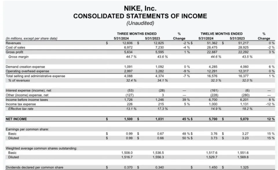每经编辑:张锦河 北京时间6月28日晚美股开盘,三大指数涨跌不一,制止发稿前,道指上涨0.44%,纳指上涨0.81%,标普500指数上涨0.61%。 英伟达涨2.31%,特斯拉涨2.02%,苹果涨0.54%,微软涨0.42%,Meta涨0.32%,亚马逊涨0.16%,谷歌跌0.24%。 芯片股集体上涨。AMD涨3.38%,高通涨2.64%,英特尔涨1.85%,美光科技涨1.04%。 耐克股价下跌19.43%,市值蒸发276.15亿美元(约合人民币2006.48亿元)。 当地时间6月27日,耐克公司发布制止2024年5月31日的2024财年第四序度和全年财务业绩。 财报表现,耐克团体第四财季实现营收126.06亿美元,低于市场预期,同比下滑2%;实现净利润15亿美元,超出市场预期,同比增45%;每股收益0.99美元,同比增长48%,超出市场预期。 2024财年,耐克团体实现营收513.62亿美元,同比持平;实现净利57.7亿美元,同比增长12%。 耐克大中华区第四财季实现营收18.63亿美元,同比增长3%,高于市场预期。2024财年实现营收75.45亿美元,同比增长4%,实现一连七个季度正增长。此中鞋类与服饰及装备业务对比下,增速最少。 第四财季耐克大中华区息税前利润(EBIT)为5.48亿美元,低于市场预期,同比增4%。2024财年大中华区EBIT为23.09亿美元,同比增1%。 Wind数据表现,这是耐克自2010年以来(不包罗新冠疫情)年度贩卖额增长速率最慢的一年。 据汹涌消息,耐克团体全球总裁兼首席实行官唐若修(John Donahoe)表现:“我们近期面对挑衅,但在耐克未来至关告急的范畴正不断取得盼望,通过提拔运动表现的创新服务运动员,不断满足消耗者连续厘革的需求,并扩大完满市场布局。我信赖我们的团队正在整合耐克的竞争上风,为我们的业务创造更大影响。” 耐克高管将第四财季贩卖额下滑归咎于系列因素。详细来看,耐克高管指出,由于线上贩卖疲软,别的生存方式业务在第四财季出现疫情暴发以来初次下滑,重要包罗Air Force1(空军一号)和Nike Dunks等线上贩卖占比高的经典系列表现不佳。而篮球鞋和跑鞋等高性能业务的增长势头不足以抵消前述下滑。 据外媒报道,消耗者对非须要付出变得更加挑剔,而耐克推出越来越多的经典老款产物,推动昂跑(On Running)和Hoka等新入局的时尚创新品牌渐渐抢走“耐克们”的客户。 南边都市报此前报道,美国时间2月15日晚,耐克公司(Nike)首席实行官John Donahoe在一封向全公司发出的电子邮件中告诉员工,公司将裁人2%,预计此次裁人不会影响市肆员工、配送中央员工以及其创新团队的员工。 制止2023年5月底,耐克共拥有83700名员工,这意味着,凌驾1600名员工将会被裁掉。 逐日经济消息综合自汹涌消息、南边都市报、公开信息 |