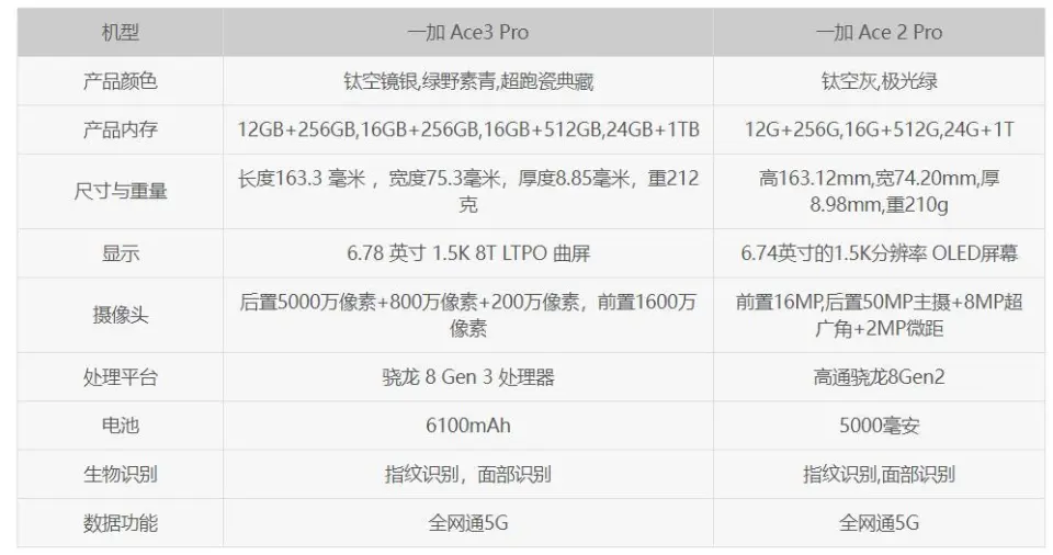 自从 @一加手机 接收绿厂Ace系列新机后,该系列机型的定位就有了相称大的改变,特别是Ace Pro系列机型,更是以杰出的性能也确实赢得了相称不错的消耗者口碑。那么,最新发布的一加Ace3 Pro与上代一加Ace2 Pro除了在处置惩罚器上的差别之外,另有哪些提升呢?渴望下文对感兴趣的小同伴有所资助。 表面方面 一加Ace3 Pro提供钛空镜银、绿野素青、超跑瓷典藏3款配色,分别接纳行业首创“液态金属反射工艺”、行业首创“松脉树纹工艺”、3D一体陶瓷后盖。而且新机接纳旗舰级金属中框、独家三段式开关,而且机身背部的镜头模组上也是产生了一些细节上的改变。 一加Ace2 Pro官方提供极光绿配色和钛空灰配色,接纳全新升级漫反射工艺打磨,拥有十足的光泽感,镜头边缘蚀刻出「精密刻度」,在镜头模组区域引入玻璃冷雕工艺和立体蚀刻工艺,带来了更强的质感。实在表面设计也不弱,只是中框接纳的是塑料材质。 的表面也是不弱,在镜头边缘蚀刻出「精密刻度」,在镜头模组区域引入玻璃冷雕工艺和立体蚀刻工艺,带来了更强的质感。 搭配极光绿配色和钛空灰配色,接纳全新升级漫反射工艺打磨,拥有十足的光泽感,只是接纳的是塑料中框材质。 轻薄度方面 一加Ace3 Pro的三种配色接纳了不同机身厚度和重量的设计,其中,绿野素青(厚8.95mm,重207g)、钛空镜银(OPPO晶盾玻璃,厚8.85mm,重212g)、超跑瓷白(厚8.69mm,重225g) 一加Ace2 Pro:厚8.98mm,重210g 总体来看,两款机型的手感应该没有太大差别。 性能方面 一加Ace3 Pro和一加Ace2 Pro分别搭载了高通骁龙8Gen3处置惩罚器和骁龙8Gen2处置惩罚器,这也是机型迭代带来的一定更新。不外在存储方面,两款机型还是有肯定区别的。 一加Ace3 Pro提供了12GB+256GB、16GB+256GB、16GB+512GB、24GB+1TB;超跑瓷典藏版 16GB+512GB、24GB+1TB等多种存储组合可选。 一加Ace2 Pro则只有12GB+256GB、16GB+512GB、24GB+1TB三种存储组合可选。 屏幕方面 一加Ace3 Pro接纳的是分辨率为2780×1264的京东方X1材质6.78英寸OLED双曲屏,手动最高亮度800nit、全局引发亮度1600nit、局部峰值亮度4500nit,支持120Hz 革新率(8T LTPO 1-120Hz 可变),明眸护眼,类DC调光+2160Hz高频PWM调光,支持10.7亿色,HDR10+/杜比视界认证,康宁大猩猩玻璃Victus2。同时,该块屏还支持雨水触控2.0、IP65防尘防水、超薄指纹解锁等 一加Ace2 Pro当年首发2772×1240分辨率京东方Q9+材质6.74英寸OLED双曲屏,局部引发亮度 1600nit,支持 120Hz 革新率,支持 2160Hz 高频 PWM 调光,支持 10bit 色深,通过 HDR 10+ 认证、莱茵TUV全局护眼认证。 很明显一加Ace3 Pro的屏幕体验要比一加Ace2 Pro更好一些,而这也在料想之中。 影像方面 一加Ace3 Pro前置1600万像素(三星 S5K3P9)自拍镜头,后置5000万像素(索尼IMX890,OIS,1/1.56")主摄+800万像素超广角(索尼 IMX355)+200万像素微距(豪威 OV02B)三摄组合,支持实况照片拍摄(兼容小红书); 一加Ace2 Pro:前置1600万像素(三星 S5K3P9)自拍镜头,后置5000万像素(索尼 IMX890,OIS,1/1.56")主摄+800万像素超广角(索尼 IMX355)+200万像素微距(豪威 OV02B)三摄组合。 从硬件设置来看,这两款机型在影像方面根本没有厘革 续航快充及周边 一加Ace3 Pro配备6100mAh冰川电池,支持100W快充,DOU测试突破2天,号称“两天充一次,一次用两天”。周边设置方面,该机金属中框+超薄光学指纹+0916T线性马达+Wi-Fi7+蓝牙5.4+红外遥控+多功能NFC+三频北斗双频GPS+IP65。 一加Ace2 Pro的续航本领也是不弱,内置5000mAh容量的大电池,而且支持150W快速充电技能,让用户无需担心电量不敷的问题。 总体来看,一加Ace3 Pro相比上代一加Ace2 Pro在表面、手感和影像方面并没有太明显差别,不外在性能、续航、周边和存储等方面还是有明显差别的。其中,假如对影像体验有需求的小同伴,并不消急着换机,究竟一加Ace3 Pro的影像设置与上代一样,而对性能和续航方面有需求的小同伴倒是可以关注一下一加Ace3 Pro,究竟现在两天充一次的智能手机壳真不多见。 |