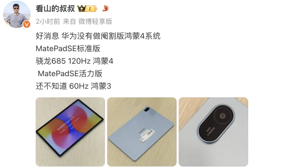 华为有望在7月的时间推出MatePadSE 系列平板新品,现在关于华为MatePadSE 系列平板新品新消息来了。 有博主分享表现华为 MatePadSE 系列平板将会有标准版记活力版两款差异机型。 此中标准版在硬件配置上搭载的是高通骁龙685处置处罚器,预装的是鸿蒙4体系,而且是“无阉割版”HarmonyOS 4,标准版在屏幕方面支持的是120HZ高革新率,有8GB + 128GB 和 8GB + 256GB 两种差异存储配置版本可以选择。 而活力版屏幕方面支持的是60HZ革新率,操纵体系方面预装的是鸿蒙3体系,存储配置为8GB + 256GB。 华为 MatePad SE 系列平板新品最快会在7月的时间推出与大家晤面,到时其硬件配置,外观设计,代价等等将会正式发表。 除了华为 MatePad SE 系列平板新品之外, Sound Joy 2 蓝牙音箱、麦芒 30 手机、Sound X 4 音箱等新品也有望一同推出与大家晤面。 |