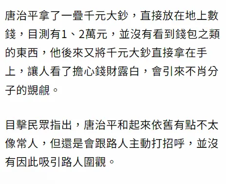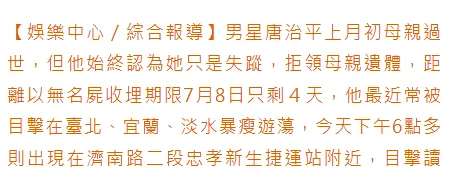 台湾男星唐治平丧母后疑似患上解离性失忆症,对母亲的影象产生庞杂,因而认不出殡仪馆的遗体,也拒绝认领妈妈遗体。 7月8日是唐治平认领妈妈遗体的最后期限,距今仅剩几天时间,假如置之不理,遗相识以“无名尸”的方式收埋。 7月4日,有网友在陌头偶遇唐治平,他穿着背心、短裤和拖鞋,叼着烟独自游荡,眼见者体现唐治平边走边摇头晃脑,看上去仍不太像正凡人,会主动和路人打招呼,但各人似乎都不敢靠近,也无人围观。 眼见者爆料唐治平一开始把钱放在地上,一边数一边叠起来往口袋装,全部都是千元台币的钞票,约莫有1、2万台币,而他也袒露满足的笑容。 只管有钱傍身,但网友照旧担心其安危,号令相干机构可以伸出援手,帮帮唐治平。 网友的初志是好的,只不外唐治平并不担当,经纪公司曾发声明体现,唐治平不以为本身有题目拒绝就医,由于不是家属,没办法逼迫送他去医院。 据悉,唐治平孤苦伶仃,已往和妈妈生存在一起,染上酒瘾后一蹶不振,每个月靠菲薄的演出收入维持生存,常常身无分文,要向同事乞贷。 日子虽苦但至少有收入,尚有妈妈相依为命。 可惜不知道那里出了题目,唐治平的妈妈6月1日在出租屋楼顶自杀,他当时喝的酩酊大醉,两天都没有发现,直至警察上楼拍门才揭开死讯。 妈妈去世之后,剧组无情的“封杀”了唐治平,收入刹时归零。 他口袋的几万块,可能是经纪公司预支的工资,不外本月房租立刻到期,这点钱估计租不到新居子,假如无人伸出援手,大概率要流落陌头。 即便如今尚有出租屋遮风挡雨,但唐治平已经像个流浪汉了,一周前赤裸上身在陌头游荡,被路人搭讪后到相干部门投诉,有点颠三倒四。 46岁的唐治平出演过《东方茱丽叶》和《格式少男少女》等电视剧,荧幕形象一直是帅气的玉人子,不意世事无常沉溺至此,外界也有猜疑他是瘾君子,实在唐治平已食不果腹了,又哪来的钱嗑药?显然是不堪妈妈自杀而精力受创所致,也希望他早日康复。 |