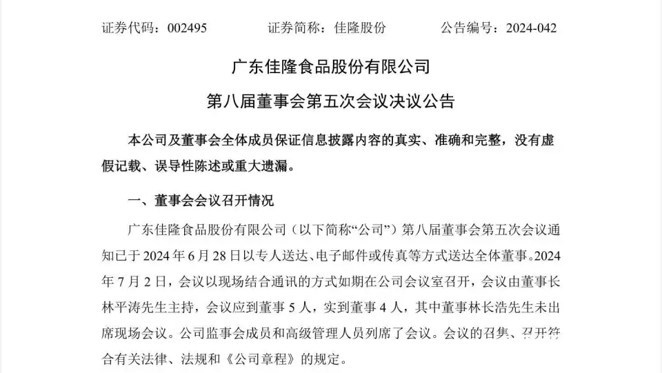 7月3日晚,佳隆股份(002495.SZ)披露了公司董事会于近日收到股东林平涛提交的函件。函件中,林平涛提请罢免林长浩董事职务,同时向公司董事会提名林长春为非独立董事候选人。 值得注意的是,林长浩、林长春两人均为佳隆股份董事长林平涛之子。 泉源:佳隆股份 父子二人是否“反目”?干系本相外界尚不清晰,但疑似家属内部不和的消息爆出后,佳隆股份股价已应声大跌,制止7月4日收盘,股价跌至1.42元/股,跌幅4.7%,总市值13.29亿元。 林平涛妻子许巧婵对提案投下弃权票 对于父亲林平涛罢免林长浩、提名林长春的发起,在佳隆股份董事会表决中,林平涛妻子许巧婵(林长浩、林长春母亲)投下弃权票。 她表现:本人对上述议案无明确意见,无意愿参与表决,故弃权。 佳隆股份官网表现,公司位于广东省普宁市,重要从事鸡粉、鸡精等调味品的生产、研发和贩卖。从公司高层的人事来看,可以看出显着的家属企业痕迹。 据佳隆股份2023年报,林氏家属5人为公司控股股东及实控人,分别为林平涛(75岁)、许巧婵(73岁)、林长青(53岁)、林长春(51岁)和林长浩(46岁)。林平涛和许巧婵为夫妻关系,为林长青、林长春和林长浩的父母。 其中,林平涛现任公司董事长,许巧婵现任公司副董事长等职务,林长浩现任公司董事、总裁。 从持股比例来看,林平涛为公司第一大股东,持股比例17.15%;被发起罢免的林长浩为第二大股东,持股比例8.36%;许巧婵为第三大股东,持股比例6.09%;林长青为第四大股东,持股比例为4.82%;被提名的林长春是第五大股东,持股比例显著低于前四大股东,为1.88% 。 在2015、2016年、2017年胡润百富榜上,林氏家属均有上榜,其财产值分别为33亿元、30亿元、21亿元。 值得注意的是,4月18日,佳隆股份董事会才刚刚完成换届,当时,林平涛、许巧婵、林长浩三人具备被选为公司非独立董事。换言之,林长浩担当董事职位仅仅两个多月。 别的,林平涛并未发起罢免林长浩总裁职务。 林氏家属5人均先后在公司任职 林长浩任总裁期间,业绩曾出现下滑 从佳隆股份的汗青来看,林氏家属5人均先后在该公司任职。 招股书表现,2001年7月,林平涛和林长青于分别以50万元投资设立佳隆食品,即佳隆股份的前身。今后,林氏家属5人均先后得到公司股份,也均在公司任差异职位。2010年,佳隆股份乐成登岸厚交所。 2015年1月,林长春在董事、总裁任期到期后离任,今后其精力用在了个人创业上。林长浩接任公司总裁职务。林平涛、许巧婵的职务则不绝未发生变革。 林长浩接任公司总裁后,从业绩数据上看,或受大情况影响,佳隆股份各项业绩指标在稳中有降。 佳隆股份2015-2023年业绩 业绩上较大的变革出现在近来两到三年。 2022年,佳隆股份业绩较上年跌幅显着。年报表现,2022年公司营收2.08亿元,同比下降25.80%;红利方面,则由盈转亏,当年净亏损达5476.98万元。2023年,佳隆股份业务收入回暖,达2.60亿元,但仍旧亏损4471万元。同时,公司调味品销量和贩卖额上也表现了这一业绩上的颠簸。 佳隆股份2015-2023年调味品销量与贩卖额 泉源:同花顺iFinD 非常常性损益是导致公司亏损的告急原因。据2023年报,佳隆股份因参股公司前海股交控股(深圳)有限公司(下称“前海股交”)发生策划亏损,导致公允代价变动丧失3486.61万元(2022年度的丧失为4966.6万元)。 采写:南都·湾财社记者 刘常源 |