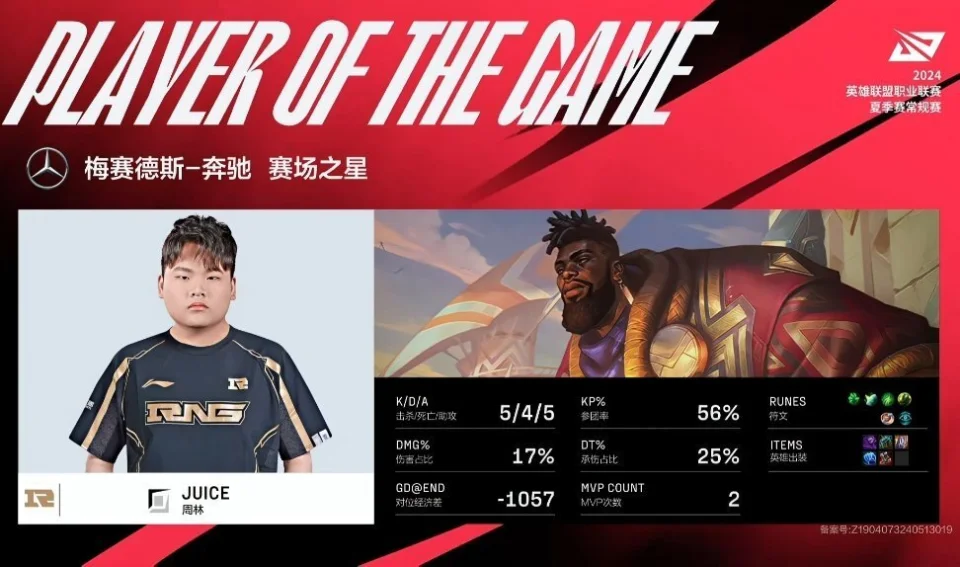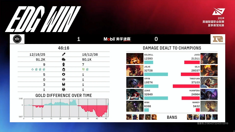 LPL夏季赛组内赛RNG和EDG的BO3,RNG这边首发打野格局和辅助iwandy,双方大战3局之后,EDG以2-1的战绩击败RNG,拿下角逐的胜利! 第一局EDG上单纳尔,打野婕拉,中单小炮,下路女枪加牛头;RNG上单卡牌,打野火男,中单飞机,下路卡莎加芮尔。6分钟双方夺取巢虫,RNG打出1换2,格局火男拿下了一血。14分钟EDG推掉了上路一血塔,前期EDG经济领先1K。中期25分钟EDG光速rush掉第一条大龙。27分钟EDG拿下听牌龙。后期31分钟EDG击杀iwandy芮尔后,拿下水龙魂,RNG则是拿下第二条大龙。37分钟双方夺取大龙,RNG击杀wink牛头后,选择打远古龙,EDG赶来后,cryin小炮被击杀,RNG拿下远古龙。40分钟RNG上路抓cryin小炮失误,iwandy芮尔被EDG众人反杀,EDG拿下第三条大龙。45分钟EDG拿下远古龙,终极凭借三龙汇击杀RNG四人后,拿下第一局的胜利。首局双方输出如下,汤圆飞机打出全场最高伤害,EDG这边伤害最高的是jiejie婕拉。 第二局EDG上单纳尔,打野死歌,中单飞机,下路女枪加洛;RNG上单奎桑提,打野火男,中单小炮,下路烬加牛头。2分钟下路2V2对拼,Iwandy牛头被对线击杀,wink洛拿下了一血。12分钟汤圆小炮推掉了上路一血塔。前期双方经济根本持平。中期20分钟RNG选择rush大龙,EDG赶来为时已晚,固然RNG拿下第一条大龙,但是EDG击杀RNG三人。27分钟Leave女枪和汤圆小炮中路solo,相互单杀,之后EDG追到野区,cryin飞机失误被击杀,RNG拿下听牌龙。后期30分钟,EDG大龙逼团,RNG赶来后,EDG开团打出1换2,随后EDG拿下第二条大龙。33分钟Juice奎桑提TP绕后,RNG打出2换3后,拿下火龙魂。37分钟EDG拿下第三条大龙。39分钟格局火男闪现大招击杀jiejie死歌后,RNG拿下远古龙。终极41分钟,RNG在高地击杀EDG四人后,拿下第二局的胜利。MVP给到了Juice奎桑提。 第三局EDG上单奎桑提,打野死歌,中单小炮,下路韦鲁斯加芮尔;RNG上单贾克斯,打野莉莉娅,中单飞机,下路炸弹人加洛。7分钟双方夺取巢虫,EDG拿下2个巢虫,而且打出0换2,cryin小炮拿下了一血。11分钟EDG推掉了上路一血塔。12分钟Juice贾克斯上路单杀leave韦鲁斯。前期双方经济持平。中期24分钟EDG在上路抓死汤圆飞机后,光速拿下第一条大龙。26分钟EDG拿下听牌龙。后期30分钟EDG拿下第二条大龙。31分钟EDG拿下风龙魂。36分钟EDG拿下第二条大龙。38分钟EDG拿下远古龙,RNG则是打出2换3。终极41分钟,EDG在高地击杀RNG三人后,拿下角逐的胜利。 那么,对于这场角逐,你们有什么想说的吗?欢迎在批评区留言探究。 |