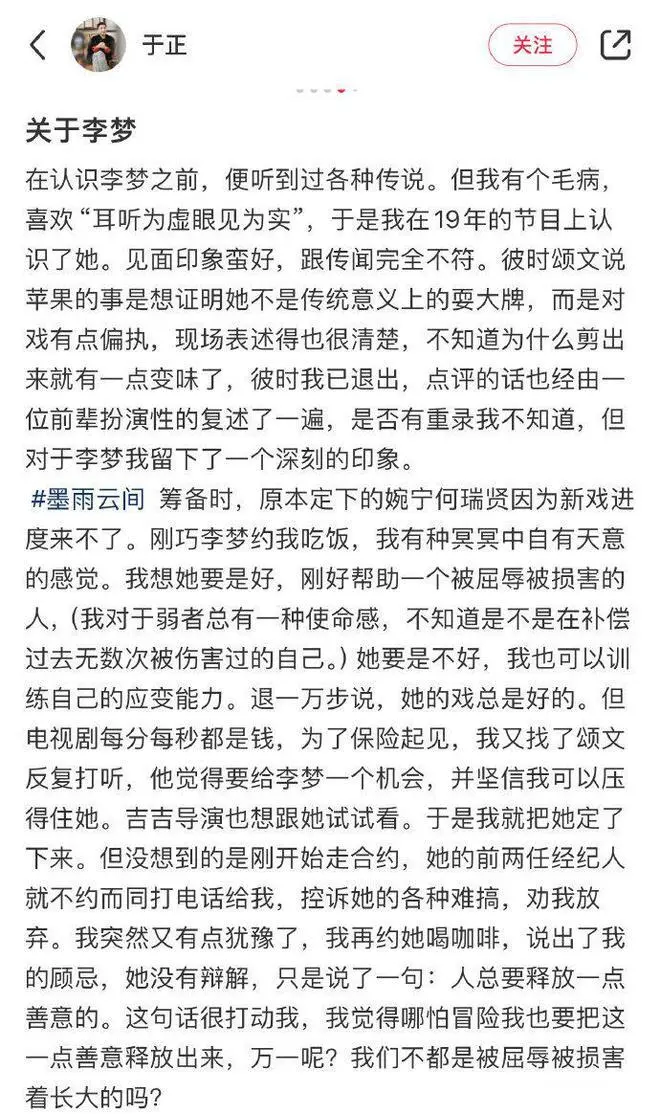前不久,于正新剧《墨雨云间》热播后引起了不少关注,随着各位主演的走红,剧中“婉宁公主”的饰演者李梦也时隔数年再次进入观众视野。 刚刚,于正就李梦上热搜一事发出长文谈及两人合作幕后故事,于正透露,《墨雨云间》是原定婉宁公主演员暂时来不了了,恰好李梦又约自己用饭,这才决定给她一个机会,终极定下了李梦。 在于正看来,李梦传言颇多,耍大牌等风评令她“被屈辱被损害”,但于正也没有想到,在刚预备敲定合约时,李梦两任前经纪人就打电话劝他放弃,并控告李梦非常难搞。 于正也并没有一味帮李梦说好话,他也指出了李梦确实有许多欠好的风俗,比如李梦进组后时刻诉苦发饰重、总迟到、任意拿别人水壶喝水、现场还不背台词,要靠导演督促才会背词等。 但最后,于正也表现只要戏好这些都无所谓,他称比李梦难搞的演员多了去了,由于他们红了,各人也就忍了。 作为编剧,于正这条长文实在亮点颇多。 外貌上看,于正是为李梦正名,承认了她的演技和本领,但同时,于正曝光的一系列片场幕后故事,也印证了李梦作为演员性格方面的欠缺,难搞一词,用在她身上再合适不外。 在许多人看来,李梦当年确实是昙花一现过的,刚出道就当了王全安影戏《白鹿原》的女主角,之后短短几年走上了戛纳,风头无俩,大有天降紫微星之势。 但令全部人没想到的是,合法李梦奇迹顶峰之际,她被曝出耍大牌等各种浮名。 在《白鹿原》电视剧版拍摄期间,李梦在片场各种大呼小叫,她感情极其不稳固,不光朝着工作职员指手画脚,出言不逊,乃至连导演都不被她放在眼里。 从这之后,李梦灵敏跌落谷底,她的角色被换,奇迹也被全面停息,再见她时,已经是2021年加入《我就是演员》的时间了。 并且,在节目中哪怕李梦没有表现出任何异样,依然遭到了李诚儒、郝蕾等导师的质疑,尤其是张纪中,不光直接在节目中批评李梦“难搞”,更直言绝不会用她如许的演员。 从李梦的经向来看,这次于正无论是给她机会重新拍戏,又或是发长文为她正名,相对来说,也都无法抵消李梦自己性格的缺陷,更无法改变观众对于李梦的见解才是。 不外,于正这次发文除了提及李梦之外,文中还提到了张颂文的名字,他更是透露,是张颂文以为要给李梦一个机会,这才让于正决定定下了对方。 张颂文对于李梦的履历,显着也是知道的,包罗当初李梦加入《我就是演员》时就与张颂文有过合作。 对于李梦的演出,其时张颂文也给出了自己中肯的意见和评论。 明知道李梦有着“难搞”的标签,明显相互之间没有任何关系,连简单的友谊都达不到,但张颂文却仍然在于正眼前力挺李梦,毫无生存的为她着想统统。 显然,于正偶然间提到张颂文的这句话,真正彻底袒露了张颂文的善良。 张颂文的善良当然也是公认的,这几年来,外界对他的关注和报导增多,他也从不着名小演员发展到了一线男星。 但纵然如许,张颂文的生存没有太多的改变,他还是谁人他,低调生存,积极拍戏,对人对事始终保持谦逊的态度,包罗之前他加入节目,不光跟当地的邻人打成一片,还主动加入素人婚礼,包红包的运动令无数网友盛赞。 当然,能做到这一步,也远阔别不开张颂文成年后的履历。 他年轻时间并非专业演员,他16岁从高职结业后离家去了东莞,先后做过印刷厂工人、饮料贩卖员、空调安装工、旅馆服务员、饭店司理等,最后考了证干起了导游工作。 机会巧合下,张颂文辞职去了北京,之后考进了北电学习班当了一名职业演员。 他每天积极学习演出,是学校里公认的专业第一,但现实却总是给他残酷的打击。 结业后,张颂文跟同砚周一围跑剧组投简历,被剧组工作职员当众吐槽长得丑,像个侏儒、猿人,当不了演员。 他不放弃也不悲观,接着跑剧组投简历。 但之后的三年时间里,张颂文跑了凌驾800个剧组,投了上千个简历,却依然没有任何收效。 在日子最难的时间,张颂文每天来回上百公里,为了省钱,每天晚上去市场买打折的食物,有时间连菜叶子都要在地上捡。 可以说,张颂文的履历比国内全部演员都要苦,他这一路上的颠沛流浪,哪怕是拍成电视剧都足够跌荡起伏。 也正因云云,张颂文明确演员的不易,他更相识一个机会有多么难过,就像是李梦,哪怕她曾经站在顶峰,但现在也与张颂文曾经的样子是那么相似。 以是,张颂文资助李梦,是发自内心的,他的履历注定让他善良一辈子。 同样也更让人感触的是,有张颂文如许的好演员在娱乐圈,何愁行业不兴呢? |