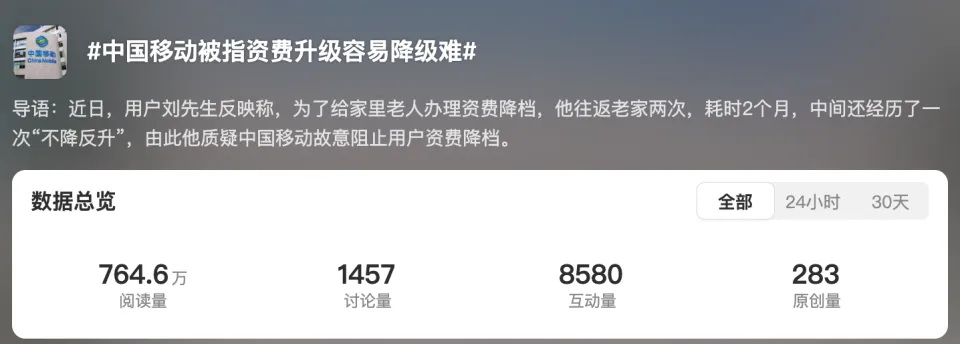 IT之家 7 月 8 日消息,本日微博话题“中国移动被指资费升级容易降级难”登上热搜,停止IT之家发稿,相干热搜位列榜单第 11,阅读量764.6 万。 据汹涌消息报道,刘老师为了给家里老人办理资费降档,耗时 2 个月往返故乡两次,中间还履历了一次“不降反升”,由此他质疑中国移动故意克制用户资费降档。 中国移动相干工作职员表现,自 2024 年 5 月 1 日起,10086 客服没有权限为用户办理资费降档,用户也不能在中国移动 App 上举行办理,只能通过专员回电来处置惩罚。 相干工作职员称:“我们的客服服务台席是有限的,以是会根据用户的需求举行分别,初次接电话的客服大概没有改套餐的权限,以是要转给相干的专员举行处置惩罚。”她表现,如果因此对用户造成困扰,会向公司反映,提拔服务服从。 据刘老师先容,家里老人最初使用的是中国移动的 79 元套餐,刘老师本年 5 月通过老人的手机给中国移动 10086 拨打了电话,对接人工客服后表现想给套餐降档,换成纯通话的套餐。“当时客服说她办理不了,4 个小时内会有降档专员往返电办理。” 6 月 23 日,得知该情况后,刘老师再次拨打 10086 为老人办理资费降档,同样被告知,必要先由 10086 的客服举行登记,再由降档专员回电才能办理乐成。“这个降档专员的回电只能接听,不能回拨,如果接不到就接洽不上了。” |