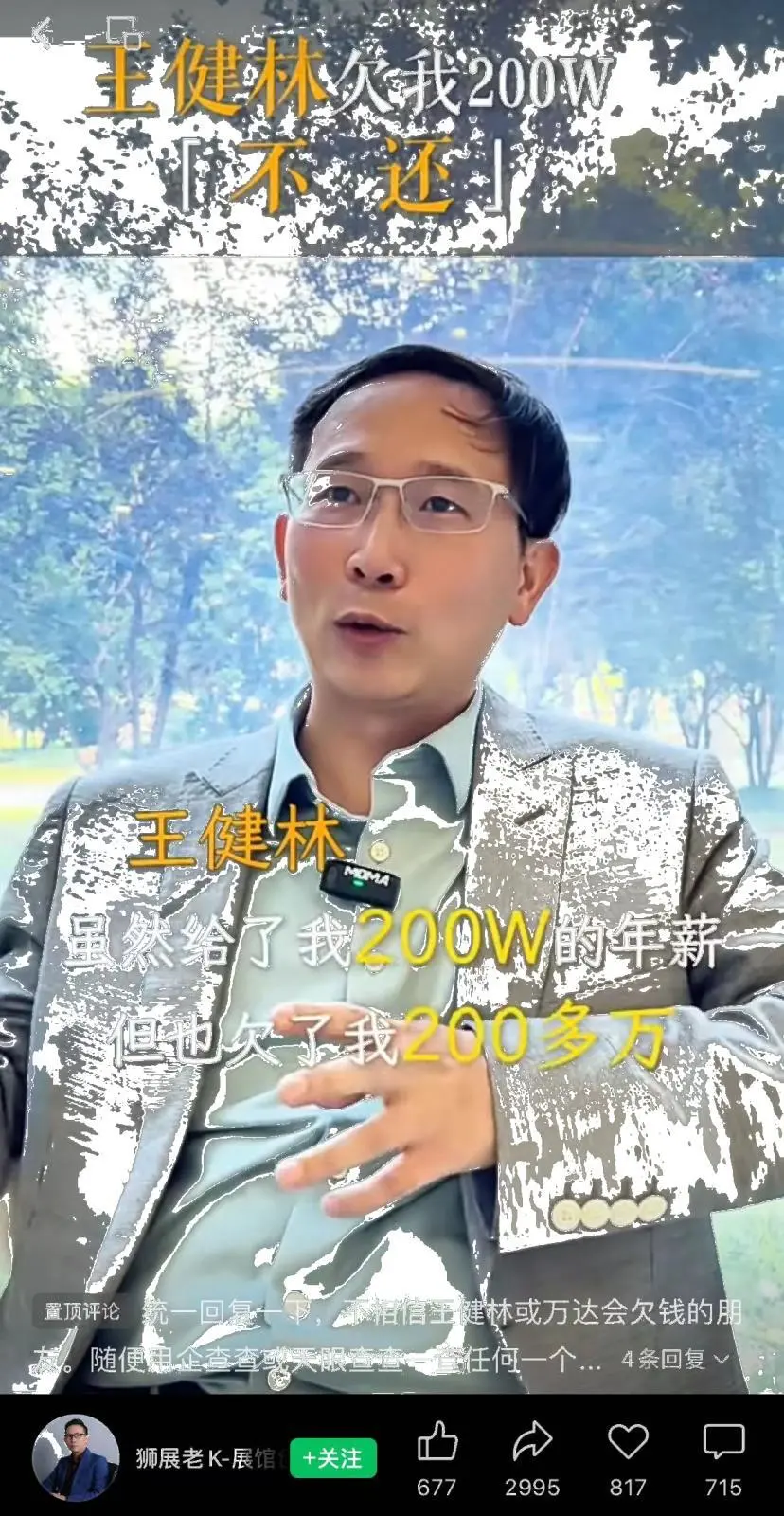 雷达财经出品 文|肖洒编|深海 固然王健林父子重回富豪榜前十,但万达看起来仍旧在过紧日子,不但一连“卖卖卖”,乃至还被前员工曝出欠其200多万。 近日,名为“狮展老K-展馆创意家”的用户发视频称,王健林把万达都卖了。欠我的钱,估计是还不了。据其先容,王健林固然给了他200万年薪,但也欠了他200多万元,法庭上都签了息争书,还是付不出来。 雷达财经注意到,上述“老K”名叫詹扬文,是狮展(上海)展示服务有限公司首创人、总司理。该公司官网显示,詹扬文是活泼在中国主题展馆&文旅范畴的新加坡籍专家,2015年曾到场万达文化团体,担当万达儿童娱乐团体副总司理。 现在,欠钱一事是“老K”单方面的说法,还没有“实锤”,但王健林卖万达广场一事,所言非虚。据媒体公开报道,7月初,又有两座万达广场被卖了。而在本年4月,北京万达总部大楼也被卖了。 王健林旗下的万达资金链告急的另一个信号是,6月28日,大连万达贸易管理团体股份有限公司(下称“大连万达商管”)所持有的大连新达盟贸易管理有限公司(下称“大连新达盟”)162亿元全部股权再次被冻结。 万达有困难,也让网友对听说中王健林的孙女发愁,到底还能不能拿到奶粉钱? 万达文化前高管称被欠200万 7月7日,视频号和抖音名为“狮展老K-展馆创意家”的用户发视频配文表现,王健林把万达都卖了。欠他的钱,估计是还不了。 其在视频中表现,“王健林固然给了我200万的年薪,但也欠了我200多万,都在法庭上签过息争书了,答应某年某月给我付钱,都付不出来了。” “狮展老K”称,他(王健林)现在大概连最后一个钢镚都已经快穿透了,否则,以他那么爱体面的人,不大概想让整个社会看他笑话,哪怕他口袋里另有一个亿,他会拿出来。 “以是说我本日只能祝福他,渴望我这个老东家能熬得过,渴望还能把欠我的钱还给我,着实还不出来,我渴望我底下那些工人的钱,他能还上。”“狮展老K”表现。 视频下方评论区,“狮展老K”再次写道,不信赖王健林或万达会欠钱的朋侪,任意查一查任何一个万达广场,最少都有10条几十条的被实验记录。“老王都穷到卖万达了,你们怎么还会以为万达不会欠钱。欠我钱的公司叫‘上海青浦万达茂投资有限公司’,另有扬州万达,连云港赣榆万达,厦门鹭港万达另有浩繁宝贝王有限公司。评论区不能发截图或PDF,各人自行上网搜一下就清晰了!” 自称被万达欠200万的“狮展老K”是谁?雷达财经梳理发现,“老K”是出生在福建的詹扬文的笔名。 狮展(上海)展示服务有限公司官网显示,詹扬文是该公司的首创人、总司理,其本科毕业于中国农业大学修建专业,硕士毕业于新加坡国立大学管理专业,担当中国电子商会数字展示专业委员会副会长。 据官网先容,狮展(上海)展示服务有限公司于2014年开端于新加坡。由行业龙头新加坡Kingsmen展示团体和上海华建团体主题展示奇迹部的焦点骨干连合创立。 公司及团队成员所经历的行业案例,覆盖了浩繁天下级主题展示项目。从上海迪士尼、北京环球到世博会&奥运的浩繁主题展示馆的筹划施工,再到GE、CokeCola、万科、越秀等天下500强企业的团体品牌展厅的打造,均有其团队的作品。 从该公司相助同伴一栏中,也可以看到万达团体的身影。与此同时,詹扬文也有在万达的工作经历,其曾于2015年到场万达文化团体,担当万达儿童娱乐团体副总司理。 天眼查资料显示,北京万达文化财产团体有限公司创建于2012年,由大连万达团体股份有限公司全资持有,股权穿透后由王健林、王思聪父子全资持有。 不外从公开报道中,并没有检索到万达文化团体高管中曾有詹扬文的名字。 王健林父子重回富豪榜前线 在上个月,2024新财产500创富榜正式发表。“王健林王思聪父子重回创富榜前十”的话题,相继冲上微博、百度热搜。 不难理解,在地产企业家渐渐淡出创富榜的本年,王健林父子重新跻身前十,无疑引发了外界的广泛关注。 详细而言,本年的新财产500创富榜中,王健林、王思聪父子以1408.4亿元的持股市值重新跻身榜单第9名,客岁排在第25位。 这些资产是怎样盘算出来的?据新财产披露,王健林家族控制的旗舰企业大连万达商管,是资产评估主体,该主体持有拟港交所上市的珠海万达商管部分股权,同时拥有各地万达广场等固定资产。 而大连万达商管的价值容易确定,该公司2023年仍正常发债。以其公布的财政数据来测算,制止2023年末,大连万达商管的总资产为6089亿元,负债为3041亿元,净资产为3082亿元,归母净资产为3010亿元。 而在大连万达商管里,王健林、王思聪父子通过万达团体持股46.08%,因此,其在万达商管里的持股市值约为1387亿元。 与此同时,2023年末,万达影戏市值跌至284亿元,而王健林仅在万达影戏第二大股东莘县融智里持股74%,以此盘算,其持有的万达影戏7.56%股权,对应市值为21.5亿元。 别的,由于王思聪的重要资产,包括大连万达团体2%股权和全资控制的普思资源已质押给大连万达团体,因此王健林、王思聪父子的所有财产这便是上述的1408亿元。 值得一提的是,一直作为万达流量继续的王思聪,至今未公布完婚,但在近期却曝出了私生女大瓜。网传消息显示,6月初,一个名叫黄一鸣的女孩发视频说,Wsc说实话我太恨你了。有网友推测,这三个字母是“王思聪”。 随后,该女生发视频公开认可吐槽的就是王思聪,由于他不来看孩子,以是就越来越恨了