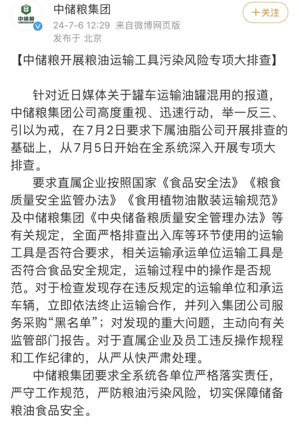 “卸完煤制油,再装大豆油”,克日,有关罐车运输油罐混用的消息引发热议。 有媒体报道称,罐车运输行业存在食品类液体和化工类液体运输混用,且不洗濯的情况。两辆刚卸完煤制油的罐车,在并未洗罐的情况下,就装上了食用油,涉及的食用油企业分别是汇福粮油团体和中储粮油脂(天津)有限公司。 “让人不测的是,中储粮这样的央企部属天津分公司居然是涉事主角之一。”7月8日,央视网评中储粮罐车运输油罐混用称,统统不公道的商业举动背后都有经济利益作祟。 央视网批评称,对于运输方来说,终极还是钱的标题,不少罐车在换货运输过程中不洗濯罐体,为的是可以省下数百元的洗濯费用,本钱下来了,竞争力上去了,别的运输车辆只有跟着“卷”。 但对于食用液体收支库的管理方,尤其是中字头这样的吸取方,坚称“不验罐是由于没办法分辨”,则完全令人咋舌。 信任这不是由于无能,而是由于无德、无责任心导致助纣为虐。舞台上的草台班子,无非演出结果差一点,出不了大事,这样的草台班子会要了消耗者的命。 现在,已有多家食用油上市公司回应,公司不存在运完煤制油再装运食用油的情况。 中储粮发文 7月6日,中国储备粮管理团体有限公司官方微博就罐车运输油罐混用变乱发文回应: 针对克日媒体关于罐车运输油罐混用的报道,中储粮团体公司高度器重、敏捷举措,闻一知十、引以为戒,在7月2日要求部属油脂公司开展排查的根本上,从7月5日开始在全系统深入开展专项大排查。 要求直属企业按照国家《食品安全法》《粮食质量安全羁系办法》《食用植物油散装运输规范》及中储粮团体《中心储备粮质量安全管理办法》等有关规定,全面严格排查收支库等环节利用的运输工具是否符合要求,相干运输承运单元运输工具是否符合食品安全规定,运输过程中的操作是否规范。 回应指出,对于查抄发现存在违背规定的运输单元和承运车辆,立即依法停止运输相助,并列入团体公司服务采购“黑名单”;对发现的庞大标题,主动向有关羁系部门陈诉。对于直属企业及员工违背操作规程和工作规律的,从严从快严厉处置惩罚。中储粮团体要责备系统各单元严格落实责任,严守工作规范,严防粮油污染风险,切实保障储备粮油食品安全。 别的,7月8日,汇福粮油团体工作人员复兴媒体称,企业对于此事积极配合,当局有关部门已经来过单元进行核查调查,包罗查抄了油的质量等各方面。该工作人员称,汇福粮油团体可以面向社会答应,企业的制品罐装油质量是过关的,而且公司没有自主的油罐车,是客户派车来自提产物的。 官网表现,汇福粮油团体始建于1999年10月,是以大豆加工为主的综合性企业团体,为国家农业产业化重点龙头企业,紧张产物为汇福食用油、汇福豆粕。 现在汇福粮油团体拥有河北燕郊、江苏泰州、辽宁盘锦三个加工基地,总加工能力到达1000万吨。自2005年以来,汇福粮油团体连年入围“中国企业500强”“中国制造企业500强”“中国食品工业十强企业”等。 食用油上市公司回应 在投资者互动平台,多家食用油上市公司回应油罐混用标题。此中,多家公司表现,已开展自查,并否认有“装完火油接着装豆油”这类食品安全变乱发生。 金龙鱼称,公司对食用油运输有严格羁系,贯彻实验国家有关法律法规对食用油运输的相干规定,并制定了团体性管理制度,旗下各工厂严格落实实验。食用油运输工具须按照《食用植物油散装运输规范》要求。 京粮控股称,公司在网络上发现相干信息后,第一时间构造相干子企业开展自查,经全面评估,不存在此类情况,公司相干子企业均满足《食品安全法》《GB/T 30254-2013食用植物油散装运输规范》等相干法律法规中关于食用油运输的相干要求,并通过查抄洗濯纪录、验车、查验铅封、取样检测、条约管理、过程纪录等步伐防范食用油运输风险,全面保障公司产物安全。 金健米业方面人士回应媒体称,公司运输油料紧张是以船运为主,是专门的装载食用油船。另有一些是汽运,相助方和承运商都是比较大型的企业,手续都比较规范、正规,在信誉和资质方面都有筛选。在详细操作中,公司也会严格查抄油罐是否干净、有无异味,会逐一核实。油罐混用的征象在行业中确实存在,但是公司通过一系列风控步伐,严格杜绝这类变乱发生。 道道全相干人士公开表现,岳阳工厂是一体化生产,不存在运输标题。重庆工厂不具备压榨产能,豆油通过长江航运的专用船只运到重庆进行包装,上述船只专用于运输食用油。 西王食品相干人士同样表现,公司食用油为一体化生产,不存在异地运输。 别的,食品检测、物流追踪、运输等相干板块上市公司纷纷被投资者扣问业务情况。 有投资者扣问实朴检测:叨教贵公司的食品检测营收占比总营收大概多少?贵公司可以检测出食用油中混杂的其他液体成分吗? 另有投资者扣问易瑞生物:是否有专业的食用油安全检测技能吗?是否可以检测出食用油里混装的其他液体成分? |