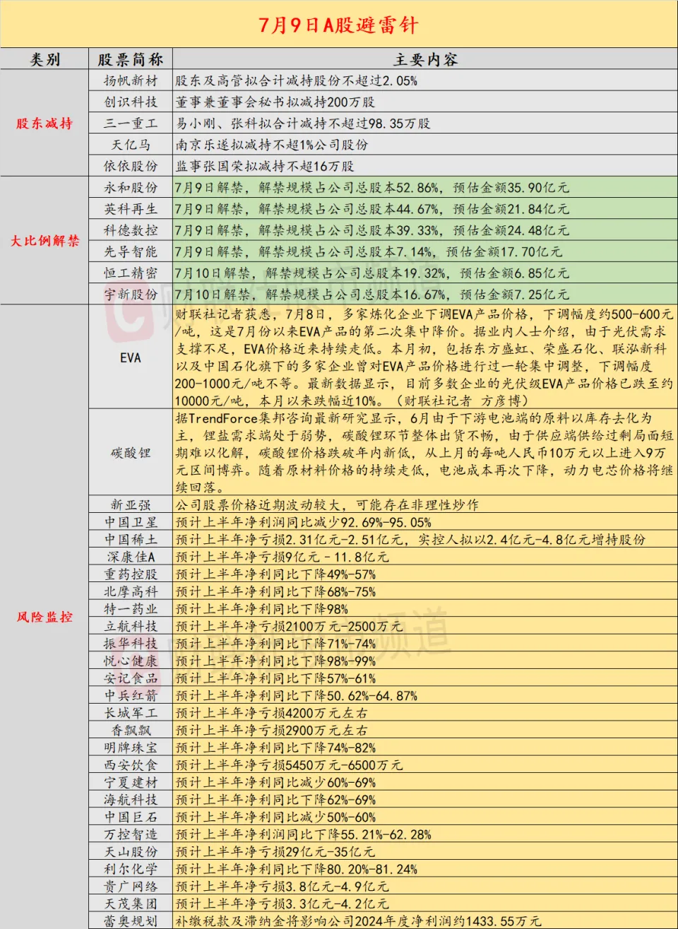 导读:财联社7月9日投资避雷针,克日,A股及外洋市场匿伏风险事件如下。国内经济信息方面包罗:1)光伏需求支持乏力,EVA月内跌价近10%;2)余额宝收益率跌破“1.5%”大关,分析人士称货基收益率大概进一步下行;公司方面重点关注包罗:1)三连板新亚强提示风险,公司股票价格近期颠簸较大,大概存在非理性炒作;2)中国卫星预计上半年净利润同比淘汰92.69%-95.05%;外洋市场重点关注包罗:1)热门中概股普跌,纳斯达克中国金龙指数跌超1%;2)COMEX黄金期货收跌1.31%,COMEX白银期货收跌2.08%。 经济信息 1、财联社记者获悉,7月8日,多家炼化企业下调EVA产物价格,下调幅度约500-600元/吨,这是7月份以来EVA产物的第二次会合降价。据业内人士先容,由于光伏需求支持不敷,EVA价格迩来连续走低。本月初,包罗东方盛虹、荣盛石化、联泓新科以及中国石化旗下的多家企业曾对EVA产物价格举行过一轮会合调解,下调幅度200-1000元/吨不等。最新数据体现,现在多数企业的光伏级EVA产物价格已跌至约10000元/吨,本月以来跌幅近10%。(财联社记者 方彦博) 2、货币基金收益率再下台阶。以天弘余额宝为代表的一众货币基金产物,停止7月8日,7日年化收益率纷纷跌破1.5%。分析人士以为,金融市场不稳固、财政发力不及预期,宽松的货币配景导致投资标的收益率下行等,均是货币基金收益率不达预期的缘故起因。金鹰基金固定收益部以为,从现在货币基金设置的资产收益来看,三季度货币基金的收益率预期大概还会进一步下行。缘故起因是当下的经济环境下居民风险偏好难以灵敏扭转,央行也不大大概贸然收紧资金的供给,未来短端债券资产的收益率大概率尚有下行空间,货币基金的收益也天然随之下行。 (第一财经) 3、据TrendForce集邦咨询最新研究体现,6月由于卑鄙电池端的质料以库存去化为主,锂盐需求端处于弱势,碳酸锂环节团体出货不畅,由于供应端供给过剩局面短期难以化解,碳酸锂价格跌破年内新低,从上月的每吨人民币10万元以上进入9万元区间博弈。随着原质料价格的连续走低,电池资本再次降落,动力电芯价格将继续回落。 公司预警 1、三连板新亚强:公司股票价格近期颠簸较大,大概存在非理性炒作。 2、中国卫星:预计上半年净利润同比淘汰92.69%-95.05%。 3、中国稀土:预计上半年净亏损2.31亿元-2.51亿元,实控人拟以2.4亿元-4.8亿元增持股份。 4、深康佳A:预计上半年净亏损9亿元–11.8亿元。 5、扬帆新材:股东及高管拟合计减持股份不凌驾2.05%。 6、创识科技:董事兼董事会秘书拟减持200万股。 7、三一重工:易小刚、张科拟合计减持不凌驾98.35万股。 8、天亿马:南京乐遂拟减持不超1%公司股份。 9、依依股份:监事张国荣拟减持不超16万股。 10、重药控股:预计上半年净利同比降落49%-57%。 11、北摩高科:预计上半年净利同比降落68%-75%。 12、特一药业:预计上半年净利同比降落98%。 13、立航科技:预计上半年净亏损2100万元-2500万元。 14、振华科技:预计上半年净利同比降落71%-74%。 15、悦心康健:预计上半年净利同比降落98%-99%。 16、安记食品:预计上半年净利同比降落57%-61%。 17、中兵红箭:预计上半年净利同比降落50.62%-64.87%。 18、长城军工:预计上半年净亏损4200万元左右。 19、香飘飘:预计上半年净亏损2900万元左右。 20、明牌珠宝:预计上半年净利同比降落74%-82%。 21、西安饮食:预计上半年净亏损5450万元-6500万元。 22、宁夏建材:预计上半年净利同比淘汰60%-69%。 23、海航科技:预计上半年净利同比降落62%-69%。 24、中国巨石:预计上半年净利同比淘汰50%-60%。 25、万控智造:预计上半年净利润同比降落55.21%-62.28%。 26、天山股份:预计上半年净亏损29亿元-35亿元。 27、利尔化学:预计上半年净利同比降落80.20%-81.24%。 28、贵广网络:预计上半年净亏损3.8亿元-4.9亿元。 29、天茂团体:预计上半年净亏损3.3亿元-4.2亿元。 30、蕾奥规划:补缴税款及滞纳金将影响公司2024年度净利润约1433.55万元。 外洋预警 1、美股三大指数收盘涨跌不一,道指跌0.08%,纳指涨0.28%,标普500指数涨0.1%。热门科技股涨跌不一,英伟达涨超1%,苹果、特斯拉涨幅不敷1%,其中苹果市值迫近3.5万亿美元,逾越微软重回第一,特斯拉实现一连9日上涨,Meta跌近2%,谷歌、微软、亚马逊跌幅不敷1%。电脑硬件、半导体板块涨幅居前,超微电脑、纳微半导体、英特尔、安高盟涨超6%,戴尔科技涨超5%,AMD涨近4%,惠普、罗技涨超1%。海运、其他工业金属与采矿跌幅居前,美洲白银公司跌超5%,斯蒂加斯海运跌超3%,根科船务贸易跌近2%,淡水河谷、必和必拓跌超1%。 热门中概股普跌,纳斯达克中国金龙指数跌1.05%。富途控股跌超7%,小鹏汽车跌近6%,蔚来跌超3%,爱奇艺跌超2%,阿里巴巴、微博、理想汽车、百度、拼多多、京东跌超1%,满帮、唯品会、网易、腾讯音乐小幅下跌。哔哩哔哩涨超2%。 2、COMEX黄金期货收跌1.31%,报2366.4美元/盎司;COMEX白银期货收跌2.08%,报31.03美元/盎司。 3、芝加哥期货交易所(CBOT)农产物期货主力合约周一全线收跌,大豆期货跌2.68%报1099.5美分/蒲式耳;玉米期货跌3.89%报407.5美分/蒲式耳,小麦期货跌3.43%报570.25美分/蒲式耳。 4、高盛环球市场部董事总司理兼战术专家Scott Rubner称,美国股市从8月初开始将接连履历痛楚的两周,被动投资者的大量资金流出大概会减弱回报,而且企业盈利若令人扫兴会迫使体系性基金卖出股票。2024年上半年有来自股票ETF和共同