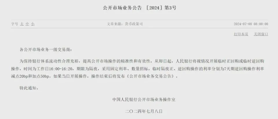 央行新货币政策工具出炉。 7月8日早间,中国人民银行发布公开市场业务公告称,为保持银行体系运动性公道充裕,进步公开市场操纵的精准性和有效性,从克日起,人民银行将视环境开展临时正回购或临时逆回购操纵。 多位业内专家表现,此次临时回购工具的创设丰富了货币政策工具的种类和期限,有助于央行更机动地调治运动性颠簸,根本目标在于完善货币政策框架,稳固基准利率和短期资金利率,疏通由短到长的利率传导机制。 公告表现,此次创设的临时回购操纵时间为工作日16∶00—16∶20,期限为隔夜,采取固定利率、数目招标,临时隔夜正、逆回购操纵的利率分别为7天期逆回购操纵利率减点20bp(基点)和加点50bp。 据相识,央行自1998年开始建立公开市场业务一级交易商制度,选择了一批可以大概负担大额债券交易的贸易银行作为公开市场业务的交易对象,主要包罗回购交易、现券交易和发行中心银行单子。此中,回购交易又分为正回购和逆回购两种,用于调治市场中货币供应量的工具,分别用于接纳资金和增长市场运动性。 与以往的操纵模式相比较,此次央行创设的临时回购操纵在原有的7天、14天、28天期限上增长了“隔夜”的期限,并拓展了“工作日16∶00—16∶20”的操纵时段。利率方面,当前7天期逆回购操纵的利率为1.8%,这意味着临时隔夜正回购操纵利率为1.6%,临时隔夜逆回购操纵利率为2.3%。 “此次创设临时回购操纵,丰富了货币政策工具的种类和期限,开释了央行盼望可以更加实时、精准、高效调治市场运动性的信号。”上海交通大学安泰经济与管理学院、中国发展研究院副研究员钟辉勇直言。 别的,央行在工具选择上还创设了临时正回购操纵,或意味着正回购操纵的重启。 中国民生银行首席经济学家温彬在采访中分析称,此次央行明确了正回购重启,大幅提拔了吸取运动性的主动性,具有较强的信号意义。现在央行主要通过逆回购和MLF(中期借贷便利)到期时的缩量操纵净回笼运动性,操纵时点和缩量空间均受到肯定制约。央行设立临时正回购工具,可以共同日前公布的“借入卖出”国债,更加主动和机动地吸取运动性,既丰富了央行公开市场操纵的期限布局,也大幅进步了央行调治市场短期运动性的本领。 “联合‘借入卖出’国债举措来看,临时正、逆回购的设立反映出央行短期内调控债券利率的决心较大,在优劣两头均出台了强有力的调控步伐,有助于债券利率更公道反映我国经济根本面的修复环境。从长期来看,设立临时正、逆回购的根本目标是完善货币政策框架,稳固基准利率和短期资金利率,疏通由短到长的利率传导机制,对债市利率走势不具有决定性作用。”温彬进一步分析道。 6月19日举行的2024陆家嘴论坛上,中国人民银行行长潘功胜就我国未来货币政策框架演进指出,“未来可思量明确以央行的某个短期操纵利率为主要政策利率”,别的,“大概还必要共同适度收窄利率走廊的宽度”。 对于此次央行创设临时隔夜正、逆回购工具的举措,在多位业内专家看来,这开释了未来进一步优化利率走廊的信号。 光大证券金融业首席分析师王一峰以为,央行此举主要开释了优化利率走廊的信号。创设临时正、逆回购的举措,重点在于镌汰DR(存款类金融机构间的债券回购利率)的颠簸性,强化其基准利率职位,肯定程度上可以团体缩窄利率走廊的宽度。 “临时正、逆回购工具将有助于央行在运动性出现颠簸时,更加实时、机动地予以调治,平抑资金利率的大起大落,为市场创造更加稳固的短期资金利率预期。且临时正、逆回购的利率相当于形成宽度为70bp的利率走廊,大幅小于当前已有利率走廊宽度245bp。更窄的利率走廊宽度进一步限定了基准利率和短期资金利率的最大颠簸区间,有利于DR007(7天期回购利率)更贴近主要政策利率以及短期资金利率的稳固,更加明确货币政策态度。”温彬在采访中分析指出。 值得留意的是,此次临时正、逆回购的操纵时点选定在工作日的16∶00—16∶20,此举有何考量? “一方面,央行公开市场操纵时间,本身具有机动性,综合思量市场资金面环境、宏观经济及货币政策目标等方面。”光大银行金融市场部宏观研究员周茂华以为,“另一方面,选择在下午债市邻近收盘,也有助于更好稳固尾盘市场,并向市场开释政策取向信息。” 王一峰也在采访中表现,将操纵时点放在下午,有助于防止日内利率的过大颠簸,可以防止季末等关键时点出现资金市场利率极高的环境。至于以后正、逆回购的操纵方式等详细细节仍有待继续关注。 谈及未来临时回购的回购量,温彬以为,此次工具设立更夸大“临时”,表明央行不会以7天逆回购利率减点20bp的利率无穷吸取运动性,也不会以7天逆回购利率加点50bp的利率无穷开释运动性,既对利率走廊具有肯定收紧作用,但同时保存了宽度的机动性,并非70bp宽度的紧束缚。 “但临时正、逆回购在每日外汇交易中心交易体系关闭前才实验,既有助于平抑资金市场通常在下午较大的运动性颠簸,也对短期资金利率具有较强的预期引导作用。”温彬进一步夸大。 业内观点以为,此次临时回购工具的创设或将进一步进步央行调治市场短期运动性的本领。 那么,联合公开市场交易和运动性环境,下半年是否大概迎来新一轮的降准降息? “现在经济稳步复苏、金融体系妥当、低物价环境下,国内通例货币政策