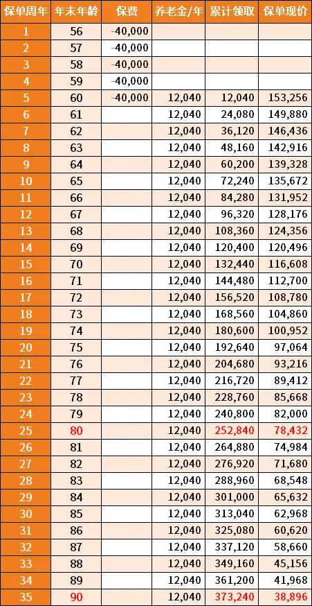 晚上好,我是小保。 前两天养老金涨了的消息,各人应该都知道了,我因此得到一笔「不测之财」—— 外婆的养老金跟涨,老人挂念我一人在外流落,特意转来一笔钱,让我炎天别不舍得开空调。 提及外婆的养老金,还蛮神奇的。 01 外婆最早是农民,厥后跟随外公工作调动,落了都会户口。 外婆没有工作,多年来收入端赖外公;幸亏,外公退休金比力高,保障老两口的老年生存很宽裕。 只是天有不测风云,外公退休第三年就由于「老年痴呆」进入了失能状态;一样平常的吃药、住院开销不低,纵然外婆节俭,每个月也都会「月光」。 这样的状态,维持了13年后,外公因多器官衰竭去世了。 外婆很要强,她不肯意跟随儿女生存,也不肯意担当「生存费」;她自己种了土豆、白菜,计划就这样过冬。 我不明白外婆为什么要吃这么多苦,妈妈告诉我:外婆最怕自己“没用”。 外公去世几个月后,生前所属的教诲局和民政部门给外婆送来一笔钱,大概是外公30个月的工资,作为抚恤金。 刚拿到这笔钱时,外婆的4个后代同等同意:钱全存起来,留给老妈养老用! 娘舅负责每个月给外婆取1000元用于生存,但外婆总是把钱偷偷放起来,舍不得花;她依然只吃自己种的菜。 不久后,我们县城出了一个政策,没有「退休金」且满退休年岁的老人,可以「买退休」。 当时外婆已经72岁,须要一次性付出9万多元,每个月领取700元;算算,大概要11年才气回本。 娘舅有些夷由:外婆不算「年轻」,身段情况也不是很好,大概「本儿都回不了」。 而妈妈却以为:只有让外婆自己有了退休金,有了源源不停的现金流,她「花自己的钱」才会安心。 末了,妈妈给外婆买了这个「退休金」。 没想到的是,短短8年时间,这个养老金从700元涨到了1800元,那9万元的资源,早就返来了;如妈妈所料,花自己钱的外婆,精力头越来越好了。 02 为什么有退休金的老年人每每精力头儿特足呢,我想,是由于:活一天,就有一天的钱,不消担心「人还在,钱没了」的困顿。 没有退休金的老年人,为了「不拖累儿女」,六七十岁还在想办法赚点钱。 有退休金的老年人,他们的一样平常研究的是「怎样更长命」。 到如今,还是以为我妈当时的坚持,简直是神来之笔。 她早早推测了「手里拿着一笔钱」和「源源不停现金流」,带来的生理体验完全差别。 而我,正站在这个选择的分叉点。 上个月,我爸给了我10万元钱,让我帮他打理。 我爸妈都是企业单位,退休金大概是退休前工资的40%,买菜用饭的一样平常开销肯定是够的,但要是想每年出去旅游一次,或者只靠退休金维持退休前的生存水平,会有点告急。 以是这钱,我想帮我爸做成「养老现金流」的情势;一要稳固恒久,二不低于或者略高于如今安全类资产的收益。 在众多产物里找到一个「大龄快领」的玩法,还挺强的: 50岁买,90岁时IRR突破4%;55岁买,90岁时IRR破4.2%。 代入我爸(今年55周岁)来测算: 每年交4万元,连续交5年,60周岁开始领钱(交完末了一期当年就能领了); 可以选择年领12040元,也可以选择月领(全年总领取12280元),我这里选择的是按年领取。 由于这款产物终身有现金价值,以是除了按年领取,须要用钱时可以一次性退保或者减保。 当我爸80岁时,领取的养老金+现价,统共是331,272,IRR为:3.52%; 当我爸90岁时,领取的养老金+现价,统共是412,136,IRR为:4.2%。 *各人如果想浅易算个数,直接以倍数乘除就可以:比如总保费上升到100万元,那每个月能领5000多元,如果总保费降到10万元,那每个月能领500多元。 这个玩法对我来说有3点很心动: