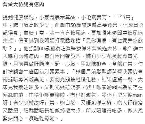 7月10日,61岁港星钱小豪回应“患癌症”一事,引起热议。 钱小豪在继承采访时表现,他看到了网上关于他患癌的传言,他以为这是一些人为了刷存在感而乱说的,他并不生气,反而以为本身很有型很男人,有点皱纹很正常。 钱小豪表现,到了他这个年事,身上肯定会有点小弊端,他在60岁之前买保险时做过一次浑身查抄,除了在大肠里发现两颗息肉,肺部有一些暗昧,以及轻微的青光眼之外,其他的倒没有什么标题,他上个月又做了一次查抄,也没啥大事。 固然,大弊端没有,小弊端肯定是有的,钱小豪坦言,他有三高,要定期吃药,至于被传患癌一事,他不想剖析,“做人最紧张开心,瘦下来身领会相对轻松。” 此前,有媒体爆料称钱小豪因为患癌做化疗,导致头发掉光暴瘦36斤,走路艰难恶疾缠身。 对于“光头”一事,钱小豪在此次采访中也做出了回应,称是因为他的头皮上出现了不正常的黑斑,必须要剃光头取组织化验,后来幸好化验结果没事。 钱小豪幼年习武,后来又进入邵氏成为武打演员,年轻时敢打敢摔,先后在《广东十虎与后五虎》《飞狐外传》《僵尸老师》《精武好汉》《古惑仔之龙在中国》《猛龙特警之天罗地网》《太极张三丰》等作品中都有精彩的体现。 可想而知,作为一名武打演员,伤痛是在所不免的,不外幸亏年事大了之后没有留下什么大的“后遗症”。 但是有一说一,钱小豪自从2016年开始在本地拍摄网络大影戏以来,先后主演了《救僵清道夫》《四目老师》《至尊老师》等多部僵尸干系题材的影片。 然而这些影戏险些都是评分只有不到3分左右的“烂片”,剧情稚子、殊效拉胯,被网友们纷纷吐槽:钱小豪是掉进消耗林正英的网大“烂剧”里不愿意出来了。 确实,钱小豪从前和林正英、许冠英一同主演的《僵尸老师》系列绝对是经典中的经典,钱小豪在片中扮演林正英的徒弟,给观众留下了深刻的印象。 然而让人没想到的是,多年过后,林正英早已不在,钱小豪却打着“致敬林正英”的名义反复接烂剧本拍“烂片”捞金,引得网友们纷纷不满,以为他给林正英丢人。 怎么说呢?钱小豪是有演技的,只是在本地拍戏确实没接到好剧本吧?毕竟他前些年主演的向传统僵尸片致敬的影戏《僵尸》,确实不错。 |
