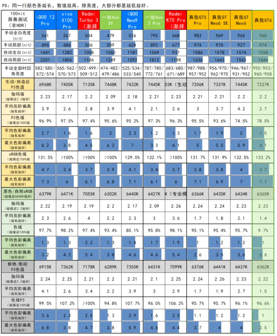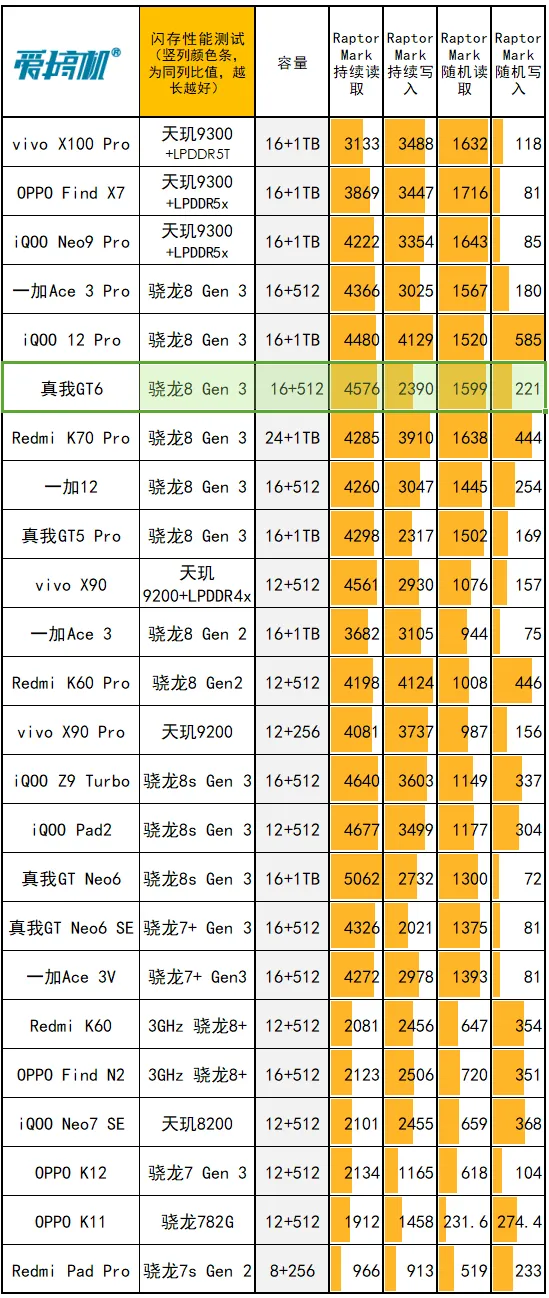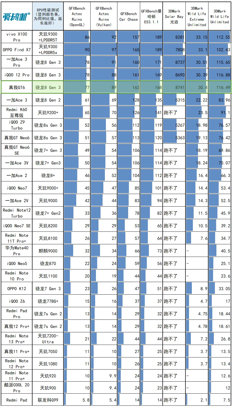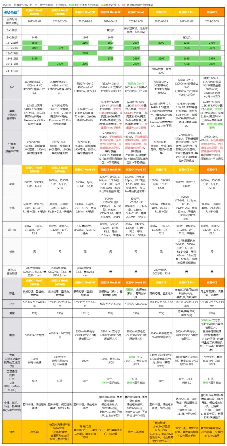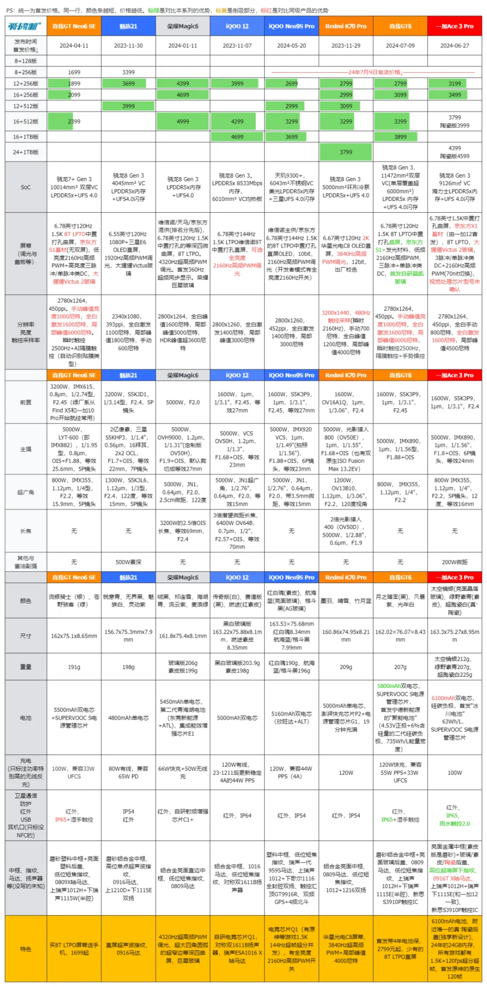 连一刻都没有为“友商”3199元起的定价感到伤心,立刻赶到战场的是真我GT6! 7月9日,真我GT6发布,这是暑假这批骁龙8 Gen 3/天玑9300+次旗舰里的第二台:骁龙8 Gen 3、1.5K的8T LTPO直屏、5800mAh电池+120W快充、IMX890主摄、金属中框+IP65,定价2799元起。 真我GT6是7月9日15:30预售,7月15日10:00开卖: 12+256版2799元,16+256版3099元,16+512版3399元,16+1TB版3899元。 外貌&做工&手感&指纹识别&外放&振动真我GT6的手机壳,竟然也是“拼接”计划的(雷同材质,但上亮下暗),这真的是深入真我的DNA……↑ 真我GT6这颗120W氮化镓充电头,固然还是魔改A口,但这次有高功率的PPS/UFCS兼容。 用来给某台不肯意透露姓名的热心新机充电也能凌驾33W。绿厂系肯转头,感动哭了,地球之母为真我点赞。 Redmi K70 Pro、真我GT6、一加Ace 3 Pro ↑ Redmi K70 Pro、真我GT6、一加Ace 3 Pro↑ 换成直屏之后,真我GT6也成了直边中框,相机装饰块变方,也有巴黎饰钉。假如没有“拼接”装饰,确实会和某橙色友商挺像的(相机模组太长,影响到了散热背夹的位置)。 屏幕和中框的四个R角,着实没有完全对应,但靠近四边等宽。 真我GT6都是磨砂铝合金中框+亮面玻璃后盖。有月之暗(黑)、暴紫、光年白3个配色,我们最保举的是“永久不堕落”的白色。 月之暗是特殊配色,而紫色是真我的标志色。就像是一加的绿、魅族的白、vivo的蓝一样,总是显得那么特殊。 外貌上,个人最喜欢的还是这中框,试问谁能反抗一条宽大笔挺的铝合金磨砂中框,而且还是深紫色的,这质感谁顶得住啊。 红外、IP65防护+湿手触控、0809 X轴马达、低位置的短焦指纹、新思S3910P触控IC,这些都不消多说,老朋侪了。 外放是上瑞声1012H+下瑞声1115E(半腔)。型号和一加Ace 3 Pro、一加12同等,但少了全腔计划,现实外放表现就是2000、3000元档的常见水平。 客观测试:屏幕&性能&发热&续航&充电(屏幕测试,亮度颜色条越长越好,色偏颜色条越短越好) 真我GT6是6.78英寸120Hz 1.5K 8T LPTO中置打孔【直屏】,京东方S1+发光材料,低频2160Hz高频PWM,三脉冲+单脉冲类DC,首发自研晶凯玻璃; 2780x1264,450ppi。手动峰值亮度1000尼特,全白引发1600尼特,局部峰值6000尼特,瞬时触控2500Hz,隔膜触控+手势操控。 真我GT6这块屏幕面,就是真我GT Neo6/Neo6 SE那块的色准升级版。 它在老的1931标准下,色准表现革新我们数据库记载。天然模式(sRGB)和影院模式(P3)的平均色偏都便是1,色准强无敌。 除了改成了直屏,亮度和可视角度表现,和真我GT Neo6/Neo6 SE/真我GT5 Pro差异不大。 这次最值得一提的是,真我GT6终于有全手动调色模式↑。 这功能别说一加,连OPPO都没有。 真我,你如许玩,人家很轻易猜疑谁才是绿厂嫡宗子的啊。 CPU性能测试(每一列,颜色条越长,越强) GPU性能测试(每一列,颜色条越长,越强) 闪存读写性能的两个测试↑(每一列,颜色条越长,越强) 真我GT6是骁龙8 Gen 3,11472mm双层VC均热板(宣称单层覆盖超6000mm),LPDDR5x 内存+UFS 4.0闪存。 现实跑分表现正常。但在RAR这种非白名单的App,即便开GT模式(真我的性能模式),性能输出也是比友商低。这里一部门表明了,为什么它的一样平常续航会比一增强。 而真我的默认调理,还是太保守了。不在白名单的游戏会比力悲观,而且配景管理真的太严酷了。很多冷门点的APP,放配景没多久就会被一波清掉了。 盼望后期能把“游戏专属内存Pro”功能开放给非游戏App(在专属内存空间的游戏是永久保活状态的)。 (室温26度,200尼特屏幕亮度) 真我GT6在3DMark烤机最高度48.6度。 3DMark Solar Bay测试稳固度55.7%、Wild Life Extreme Ulimited测试稳固度57%,Wild Life Ulimited测试稳固度77.8%。 温控线靠近49度,低压力测试稳固性不错,但高压力测试的热稳固偏低。确实是“VC越大,热容量越大”,但凌驾热容量后就有点绷不住了。 26.1度室温,颠末20分钟的《平静精英》HDR高清+极限帧数+抗锯齿,最高温36.4度,表现正常。 (续航测试:测试环境为室温26.1度,200尼特屏幕亮度,测试电量区间30%到80%。包罗30分钟《平静精英》HDR高清+极限帧数+抗锯齿、30分钟B站1080P视频播放、30分钟微博短视频、各30分钟的Wi-Fi和5G冲浪,共2.5小时) 真我GT6是5800mAh双电芯+120W快充,兼容55W PPS+33W UFCS。 首发宁德新能源的“聚能电池”(4.53V正极+6%含硅量的二代硅碳负极,735Wh/L能量密度),带SUPERVOOC S电源管理芯片。 真我GT6现实续航表现不错,这才是我们熟悉的5800mAh电池,没有特意在前后段隐藏电量。 在200尼特屏幕亮度,循环播放B站1080P视频的“100%测到0%”测试中,真我GT6总时长22小时3分钟,比6100mAh电池的一加Ace 3 Pro短20分钟(毕竟后者在1%时逼迫进入了降亮度的超等省电模式)。 (充电测试,1%开始。同一行的颜色条越长,速率越快↑。已打开vivo超快充电模式/OPPO智能极速充电/小米快充加快与低电疾充等功能。部门厂商/机型默认关闭相干功能,需手动开启) 真我GT6在32分钟表现电量100%,随后还会在15W左右的功率维持5分钟左右才断充。 真我GT6的120W显着比真我GT Neo6的120W慢。这是大容量+高密度的硅氧负极电池的代价,但这已经是这批硅氧负极电池机型里,充电最快的了。 对比前代,真我GT6电池大了560mAh,但体积更小,机身还薄了0.5mm。也有1%电量的超等省电模式,不会像一加Ace 3 Pro那样逼迫进超等省电模式,自由度会稍高一点。 真我这方案,和6100mAh+100W的一加对比,便是是用300mAh的容量差距,换高20W的快充。 照相真我GT6的相机部门是老朋侪了: 前置1600W,S5K3P9,1μm,1/3.1",F