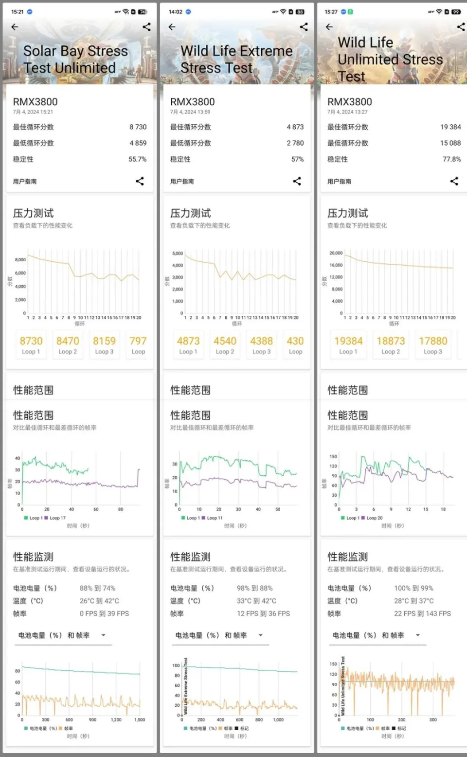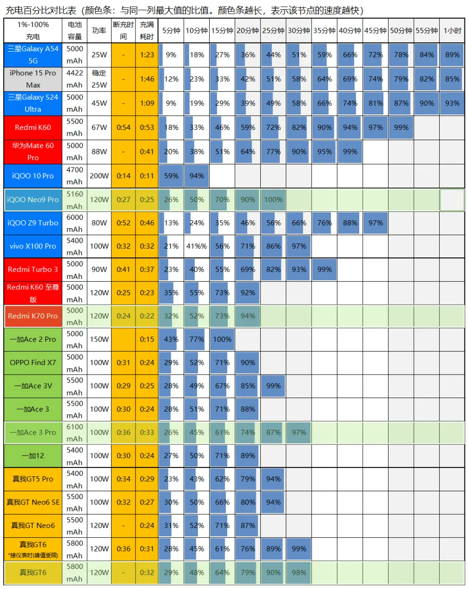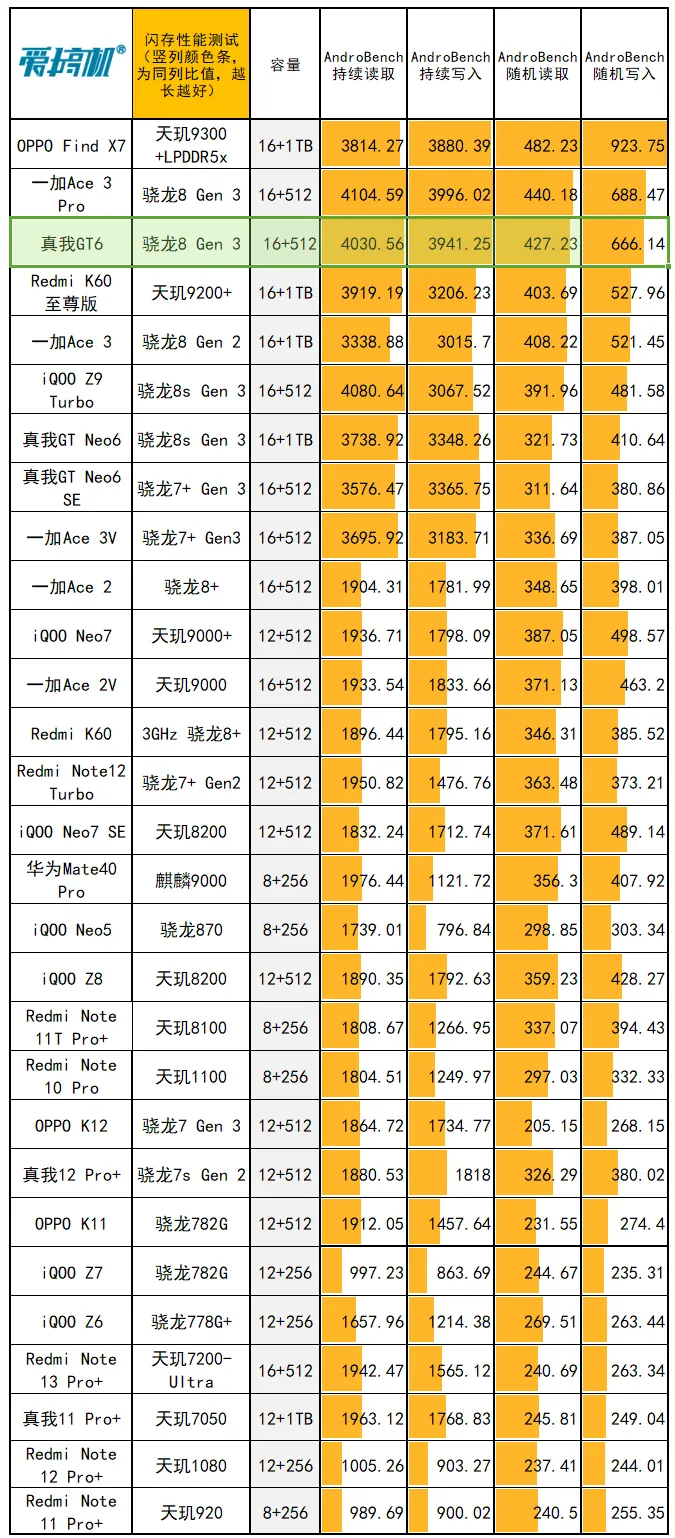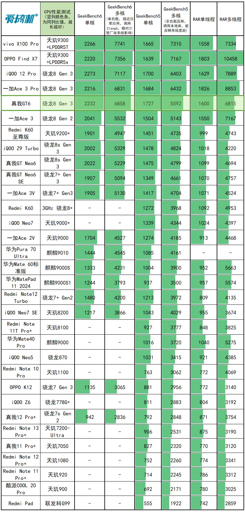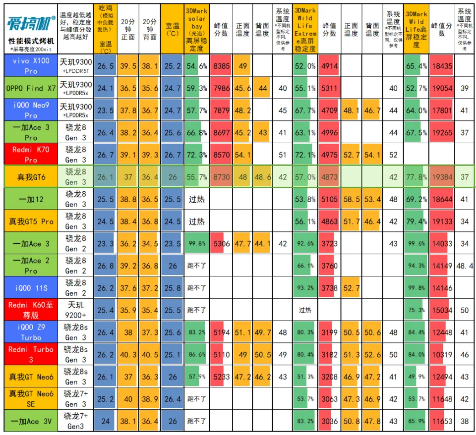 连一刻都没有为“友商”3199元起的定价感到伤心,立刻赶到战场的是真我GT6! 7月9日,真我GT6发布,这是暑假这批骁龙8 Gen 3/天玑9300+次旗舰里的第二台:骁龙8 Gen 3、1.5K的8T LTPO直屏、5800mAh电池+120W快充、IMX890主摄、金属中框+IP65,定价2799元起。 真我GT6是7月9日15:30预售,7月15日10:00开卖: 12+256版2799元,16+256版3099元,16+512版3399元,16+1TB版3899元。 外貌&做工&手感&指纹识别&外放&振动真我GT6的手机壳,竟然也是“拼接”计划的(雷同材质,但上亮下暗),这真的是深入真我的DNA……↑ 真我GT6这颗120W氮化镓充电头,固然还是魔改A口,但这次有高功率的PPS/UFCS兼容。 用来给某台不肯意透露姓名的热心新机充电也能凌驾33W。绿厂系肯转头,感动哭了,地球之母为真我点赞。 Redmi K70 Pro、真我GT6、一加Ace 3 Pro ↑ Redmi K70 Pro、真我GT6、一加Ace 3 Pro↑ 换成直屏之后,真我GT6也成了直边中框,相机装饰块变方,也有巴黎饰钉。假如没有“拼接”装饰,确实会和某橙色友商挺像的(相机模组太长,影响到了散热背夹的位置)。 屏幕和中框的四个R角,着实没有完全对应,但靠近四边等宽。 真我GT6都是磨砂铝合金中框+亮面玻璃后盖。有月之暗(黑)、暴紫、光年白3个配色,我们最保举的是“永久不堕落”的白色。 月之暗是特殊配色,而紫色是真我的标志色。就像是一加的绿、魅族的白、vivo的蓝一样,总是显得那么特殊。 外貌上,个人最喜欢的还是这中框,试问谁能反抗一条宽大笔挺的铝合金磨砂中框,而且还是深紫色的,这质感谁顶得住啊。 红外、IP65防护+湿手触控、0809 X轴马达、低位置的短焦指纹、新思S3910P触控IC,这些都不消多说,老朋侪了。 外放是上瑞声1012H+下瑞声1115E(半腔)。型号和一加Ace 3 Pro、一加12同等,但少了全腔计划,现实外放表现就是2000、3000元档的常见水平。 客观测试:屏幕&性能&发热&续航&充电(屏幕测试,亮度颜色条越长越好,色偏颜色条越短越好) 真我GT6是6.78英寸120Hz 1.5K 8T LPTO中置打孔【直屏】,京东方S1+发光材料,低频2160Hz高频PWM,三脉冲+单脉冲类DC,首发自研晶凯玻璃; 2780x1264,450ppi。手动峰值亮度1000尼特,全白引发1600尼特,局部峰值6000尼特,瞬时触控2500Hz,隔膜触控+手势操控。 真我GT6这块屏幕面,就是真我GT Neo6/Neo6 SE那块的色准升级版。 它在老的1931标准下,色准表现革新我们数据库记载。天然模式(sRGB)和影院模式(P3)的平均色偏都便是1,色准强无敌。 除了改成了直屏,亮度和可视角度表现,和真我GT Neo6/Neo6 SE/真我GT5 Pro差异不大。 这次最值得一提的是,真我GT6终于有全手动调色模式↑。 这功能别说一加,连OPPO都没有。 真我,你如许玩,人家很轻易猜疑谁才是绿厂嫡宗子的啊。 CPU性能测试(每一列,颜色条越长,越强) GPU性能测试(每一列,颜色条越长,越强) 闪存读写性能的两个测试↑(每一列,颜色条越长,越强) 真我GT6是骁龙8 Gen 3,11472mm双层VC均热板(宣称单层覆盖超6000mm),LPDDR5x 内存+UFS 4.0闪存。 现实跑分表现正常。但在RAR这种非白名单的App,即便开GT模式(真我的性能模式),性能输出也是比友商低。这里一部门表明了,为什么它的一样平常续航会比一增强。 而真我的默认调理,还是太保守了。不在白名单的游戏会比力悲观,而且配景管理真的太严酷了。很多冷门点的APP,放配景没多久就会被一波清掉了。 盼望后期能把“游戏专属内存Pro”功能开放给非游戏App(在专属内存空间的游戏是永久保活状态的)。 (室温26度,200尼特屏幕亮度) 真我GT6在3DMark烤机最高度48.6度。 3DMark Solar Bay测试稳固度55.7%、Wild Life Extreme Ulimited测试稳固度57%,Wild Life Ulimited测试稳固度77.8%。 温控线靠近49度,低压力测试稳固性不错,但高压力测试的热稳固偏低。确实是“VC越大,热容量越大”,但凌驾热容量后就有点绷不住了。 26.1度室温,颠末20分钟的《平静精英》HDR高清+极限帧数+抗锯齿,最高温36.4度,表现正常。 (续航测试:测试环境为室温26.1度,200尼特屏幕亮度,测试电量区间30%到80%。包罗30分钟《平静精英》HDR高清+极限帧数+抗锯齿、30分钟B站1080P视频播放、30分钟微博短视频、各30分钟的Wi-Fi和5G冲浪,共2.5小时) 真我GT6是5800mAh双电芯+120W快充,兼容55W PPS+33W UFCS。 首发宁德新能源的“聚能电池”(4.53V正极+6%含硅量的二代硅碳负极,735Wh/L能量密度),带SUPERVOOC S电源管理芯片。 真我GT6现实续航表现不错,这才是我们熟悉的5800mAh电池,没有特意在前后段隐藏电量。 在200尼特屏幕亮度,循环播放B站1080P视频的“100%测到0%”测试中,真我GT6总时长22小时3分钟,比6100mAh电池的一加Ace 3 Pro短20分钟(毕竟后者在1%时逼迫进入了降亮度的超等省电模式)。 (充电测试,1%开始。同一行的颜色条越长,速率越快↑。已打开vivo超快充电模式/OPPO智能极速充电/小米快充加快与低电疾充等功能。部门厂商/机型默认关闭相干功能,需手动开启) 真我GT6在32分钟表现电量100%,随后还会在15W左右的功率维持5分钟左右才断充。 真我GT6的120W显着比真我GT Neo6的120W慢。这是大容量+高密度的硅氧负极电池的代价,但这已经是这批硅氧负极电池机型里,充电最快的了。 对比前代,真我GT6电池大了560mAh,但体积更小,机身还薄了0.5mm。也有1%电量的超等省电模式,不会像一加Ace 3 Pro那样逼迫进超等省电模式,自由度会稍高一点。 真我这方案,和6100mAh+100W的一加对比,便是是用300mAh的容量差距,换高20W的快充。 照相真我GT6的相机部门是老朋侪了: 前置1600W,S5K3P9,1μm,1/3.1",F