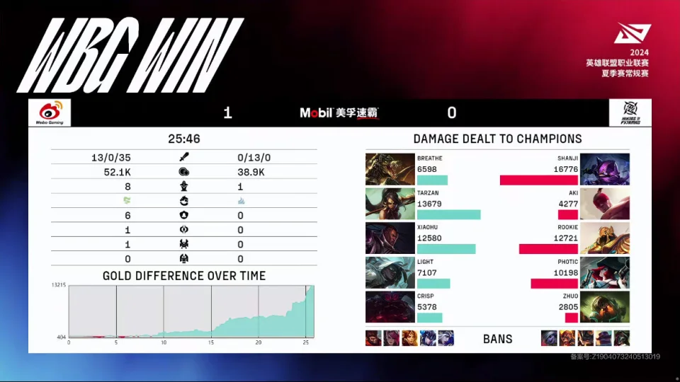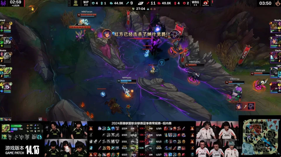 LPL夏日赛组内赛WBG和NIP的角逐,两边大战2局之后,WBG以2-0的战绩击败NIP,送给NIP三连败! 第一局WBG上单鳄鱼,打野豹女,中单卢锡安,下路赛娜加奥恩;NIP上单凯南,打野盲僧,中单沙皇,下路女枪加泰坦。9分钟两边下路混战,zhuo泰坦被击杀,小虎卢锡安拿下了一血。前期WBG推掉了上下两路一塔,经济领先4K。中期22分钟,WBG多次拍大龙,NIP赶来后,刘青松奥恩开团,WBG打出0换3后,拿下第一条大龙。终极25分钟山鸡凯南TP人绕后,但是伤害不足,WBG反打团灭NIP后,拿下第一局的胜利。首局两边输出如下,山鸡凯南打出全场最高伤害,WBG这边伤害最高的是Tarzan豹女。 第二局NIP上单奎桑提,打野猪妹,中单飞机,下路泽丽加璐璐;WBG上单鳄鱼,打野莉莉娅,中单永恩,下路赛娜加奥恩。2分钟Tarzan莉莉娅入侵野区被Aki单杀,NIP拿下了一血。14分钟WBG推掉了中路一血塔,前期两边经济根本持平。中期25分钟WBG拿下听牌龙,之后NIP先手开到Tarzan莉莉娅,但是Tarzan金身规避,WBG冲散NIP阵容,击杀2人后,拿下第一条大龙。后期31分钟WBG拿下火龙魂,随后两边混战,Photic泽丽被击杀,WBG击杀NIP四人后,拿下角逐的胜利。 那么,对于这场角逐,你们有什么想说的吗?欢迎在评论区留言探讨。 |