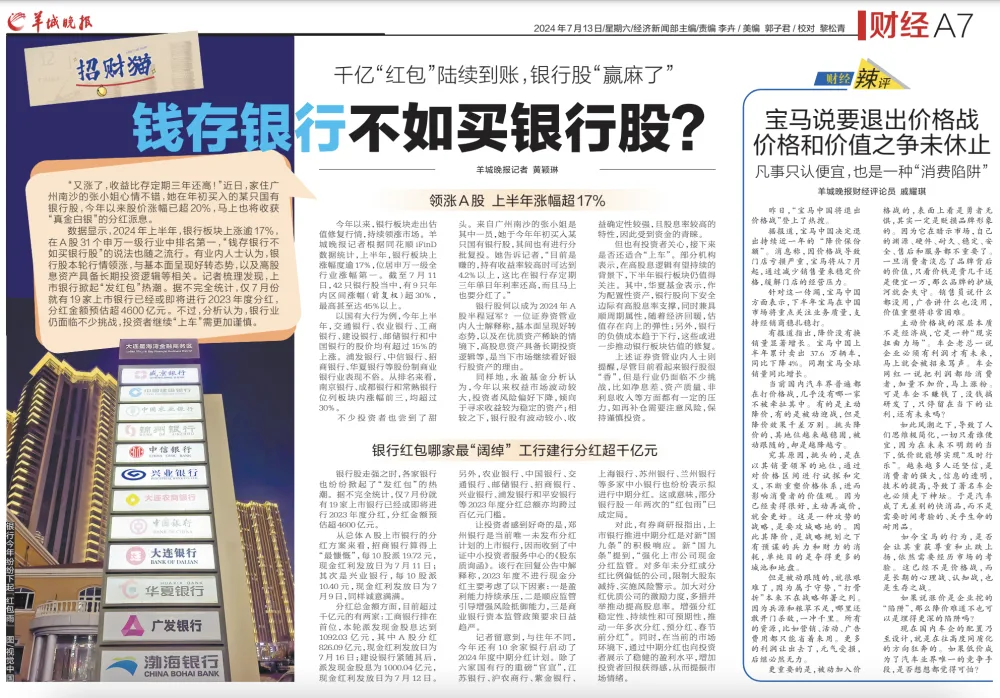 “又涨了,收益比存定期三年还高!”克日,家住广州南沙的张小姐心情不错,她在年初买入的某只国有银行股,本年以来股价涨幅已超20%,立即也将劳绩“真金白银”的分红派息。 数据表现,2024年上半年,银行板块上涨逾17%,在A股31个申万一级行业中排名第一,“钱存银行不如买银行股”的说法也随之盛行。有业内人士以为,银行股本轮行情领涨,与根本面出现好转态势,以及高股息资产具备恒久投资逻辑等干系。记者梳理发现,上市银行掀起“发红包”高潮。据不完全统计,仅7月份就有19家上市银行已经或即将举行2023年度分红,分红金额预估超4600亿元。不外,分析以为,银行业仍面对不少挑衅,投资者继承“上车”需更加谨慎。 领涨A股上半年涨幅超17% 本年以来,银行板块走出估值修复行情,一连领涨市场。羊城晚报记者根据同花顺iFinD数据统计,上半年,银行板块上涨幅度逾17%,位居申万一级全行业涨幅第一。克制7月11日,42只银行股当中,有9只年内区间涨幅(前复权)超30%,最高以致达45%以上。 以国有大行为例,本年上半年,交通银行、农业银行、工商银行、创建银行、邮储银行和中国银行的股价均有超过15%的上涨。浦发银行、中信银行、招商银行、中原银行等股份制商业银行业表现不俗。从排名来看,南京银行、成都银行和常熟银行位列板块内涨幅前三,均超过30%。 不少投资者也尝到了长处。来自广州南沙的张小姐是此中一员,她于本年年初买入某只国有银行股,其间也有举行分批复投。她告诉记者,“现在是赚的,持有收益率较高时可到达4.2%以上,这比在银行存定期三年单日年利率还高,而且立即也要分红了。” 银行股何以成为2024年A股半程冠军?一位证券资管业内人士表明称,根本面出现好转态势,以及在优质资产稀缺的情境下,高股息资产具备恒久投资逻辑等,是当下市场继承看好银行股资产的来由。 同样地,永盈基金分析以为,本年以来权益市场颠簸较大,投资者风险偏好降落,倾向于寻求收益较为稳固的资产;相较之下,银行股有颠簸较小、收益确定性较强,且股息率较高的特性,因此受到资金的青睐。 但也有投资者关心,接下来是否还得当“上车”。部分机构表示,在高股息逻辑有望一连的配景下,下半年银行板块仍值得关注。此中,中原基金表示,作为设置性资产,银行股向下安全边际有高股息率支撑,同时兼具顺周期属性,随着经济回暖,估值存在向上的弹性;别的,银行的负债成本趋于下行,这些或进一步推动银行板块估值的修复。 上述证券资管业内人士则提示,只管现在看起来银行股很“香”,但是行业仍面对不少挑衅,比如净息差、资产质量、非利钱收入等方面都有肯定的压力,如再补仓须要注意风险,保持谨慎投资。 银行红包哪家最“阔绰”工行建行分红超千亿元 银行股走强之时,各家银行也纷纷掀起了“发红包”的高潮。据不完全统计,仅7月份就有19家上市银行已经或即将举行2023年度分红,分红金额预估超4600亿元。 从总体A股上市银行的分红方案来看,招商银行算得上“最慷慨”,每10股派19.72元,现金红利发放日为7月11日;其次是兴业银行,每10股派10.40元,现金红利发放日为7月9日,同样诚意满满。 分红总金额方面,现在超过千亿元的有两家:工商银行排在首位,本轮派发现金股息到达1092.03亿元,此中A股分红826.09亿元,现金红利发放日为7月16日;创建银行紧随厥后,派发现金股息为1000.04亿元,现金红利发放日为7月12日。别的,农业银行、中国银行、交通银行、邮储银行、招商银行、兴业银行、浦发银行宁静安银行等2023年度分红总额亦均跨过百亿元门槛。 让投资者感到好奇的是,郑州银行是当前唯一未发布分红计划的上市银行,因而收到了中证中小投资者服务中央的《股东质询函》。该行在回复公告中表明称,2023年度不举行现金分红重要考虑了以下因素:一是红利能力一连承压,二是顺应羁系引导加强风险抵抗能力,三是商业银行资源羁系政策要求日益趋严。 记者注意到,与往年差异,本年尚有10余家银行启动了2024年度中期分红计划。除了六家国有行的重磅“官宣”,江苏银行、沪农商行、紫金银行、上海银行、苏州银行、兰州银行等多家中小银行也纷纷表示拟举行中期分红。这或意味,部分银行股一年两次的“红包雨”已成定局。 对此,有券商研报指出,上市银行推进中期分红是对新“国九条”的积极响应。新“国九条”提到,“强化上市公司现金分红羁系。对多年未分红或分红比例偏低的公司,限定大股东减持、实行风险警示。加大对分红优质公司的鼓励力度,多措并举推动进步股息率。加强分红稳固性、一连性和可预期性,推动一年多次分红、预分红、春节前分红”。同时,在当前的市场环境下,通过中期分红也向投资者展示了妥当的红利程度,增长投资者回报得到感,从而提振市场感情。 文|记者 黄颖琳 图|视觉中国 |